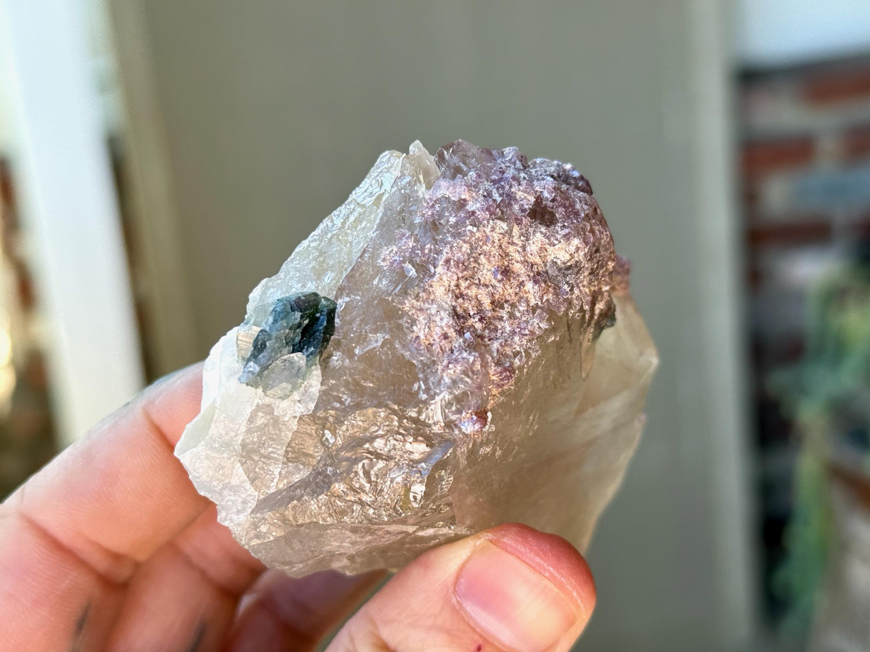 This crystal features some cathedral-like etchings on the front side, and the back is a partially healed contact area. We can also see a few small green and even pink Tourmaline inclusions embedded here as well (Photos 5-6).