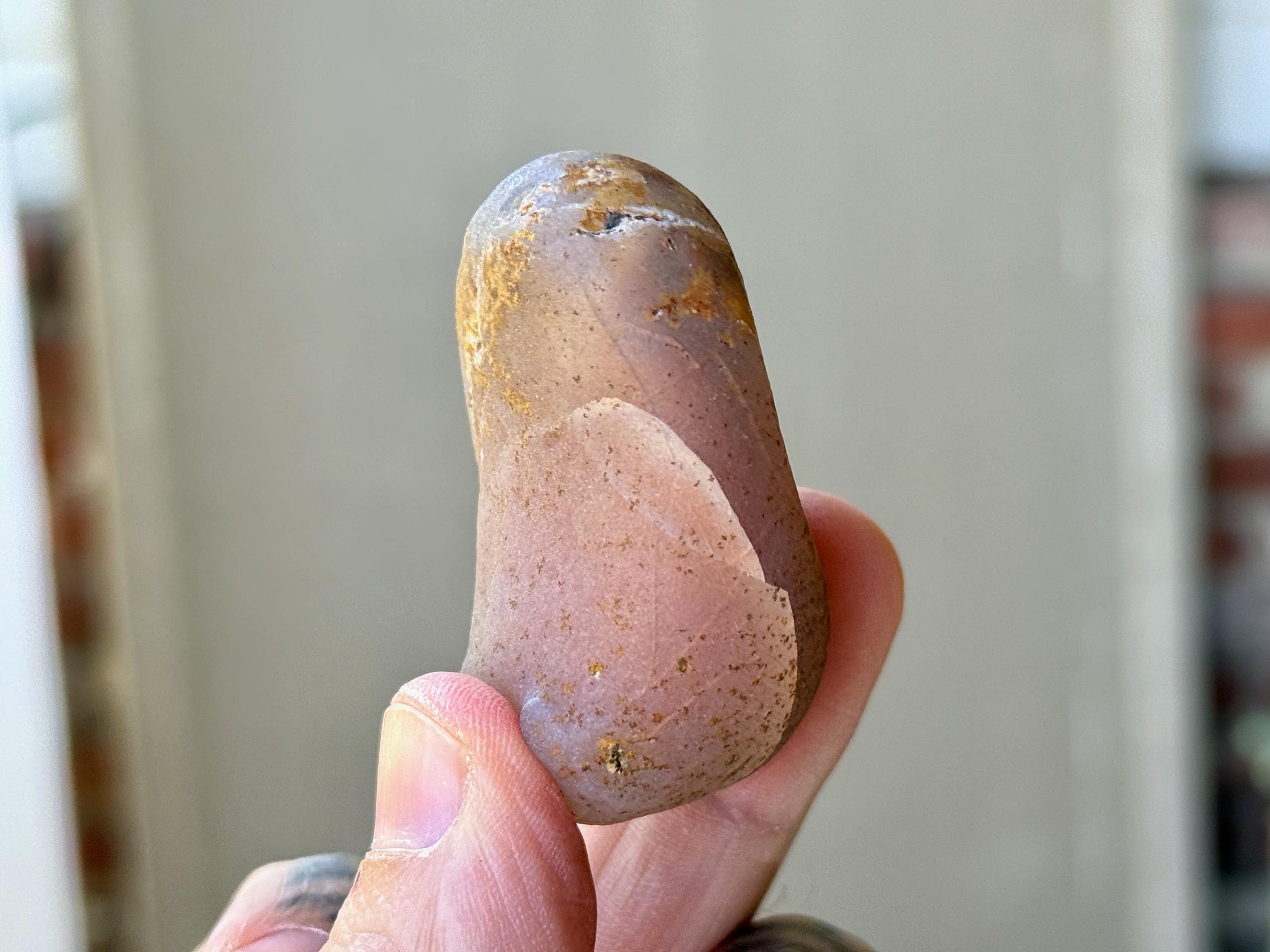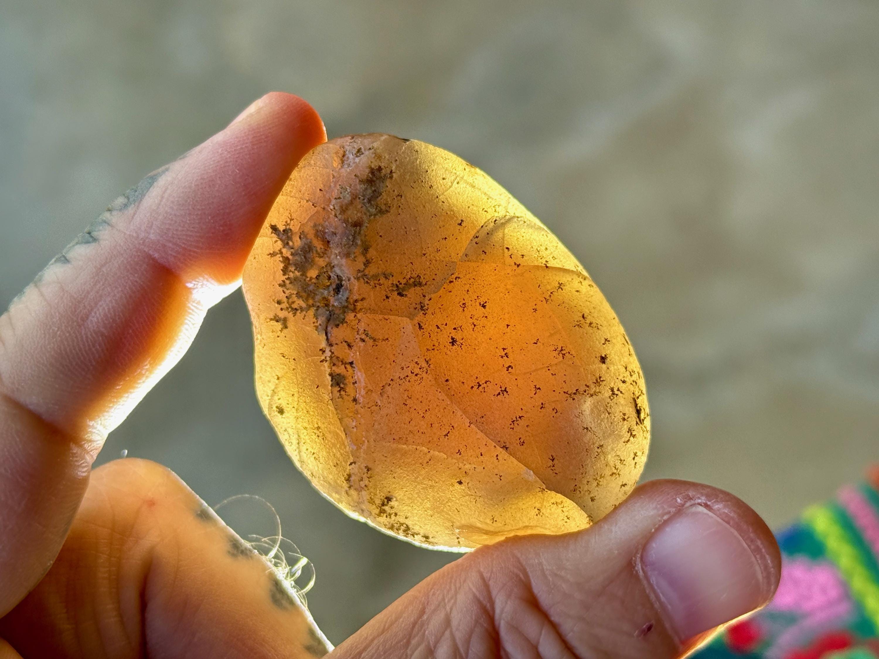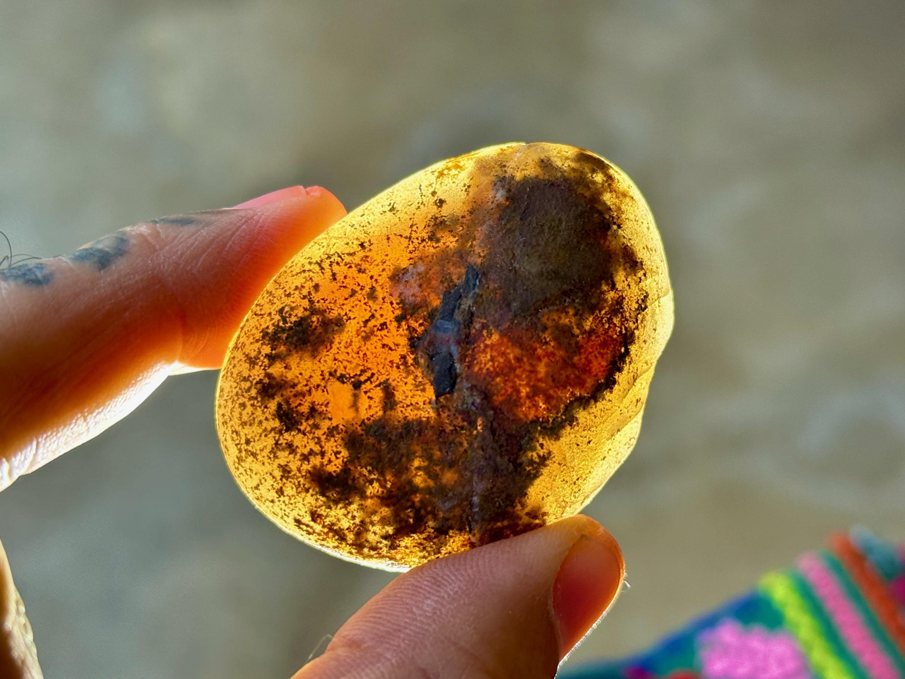 A wonderful stone from this rare collection of "Running Sand" Gobi Agates! This piece has a rounded, smooth formation with vibrant orange hues. When backlit, as in Photos 2-3, we can see how nice the translucency is. And when we hold it up to the light and play with it a bit, we can see the "running sand" moving within the piece (see the video!).