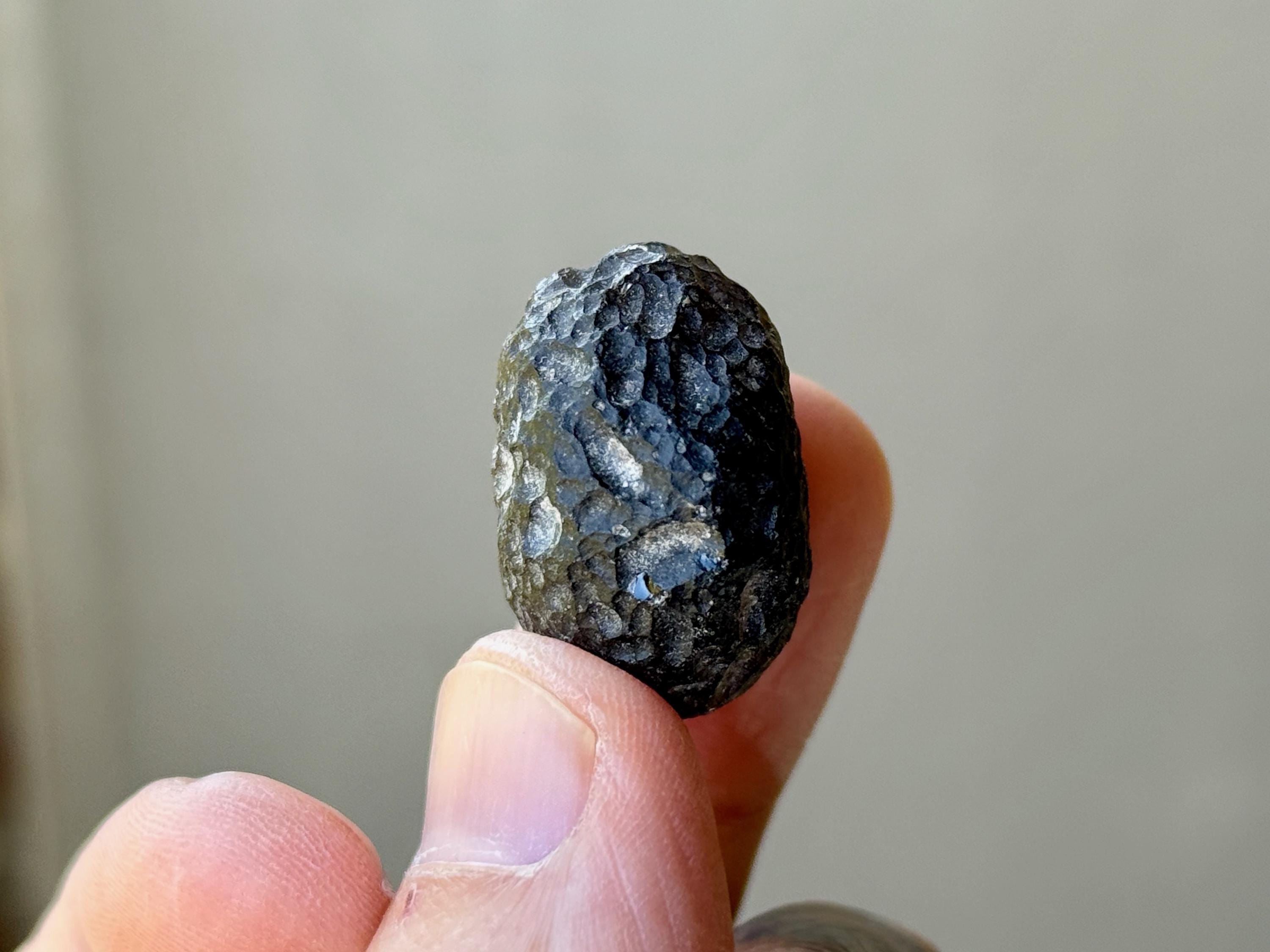 "B" Grade - These specimens may have a slightly duller complexion, with less luster and more more of a charcoal gray hue, as opposed to deep pitch black. They may still have rounded or ovular formations, or they may have irregular shapes and forms. There is still an element of translucency that is often quite high, or it may be slightly less. They may have larger smooth areas where there is no pitting.