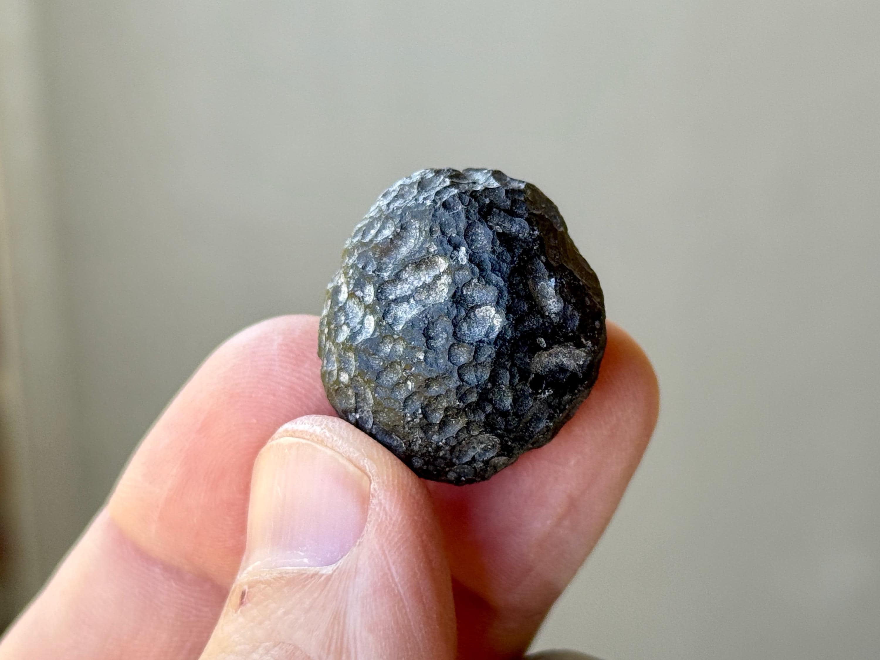 This crystal has all the hallmarks we look for in these high-grade Colombianites. It possesses a wonderful "saucer" formation (round and slightly flattened) with a lustrous, deep black exterior and is covered in natural pitted textures. The shape and depth of the textural imprints, as well as this lustrous sheen, makes this a "museum grade" piece (see more on this below).
