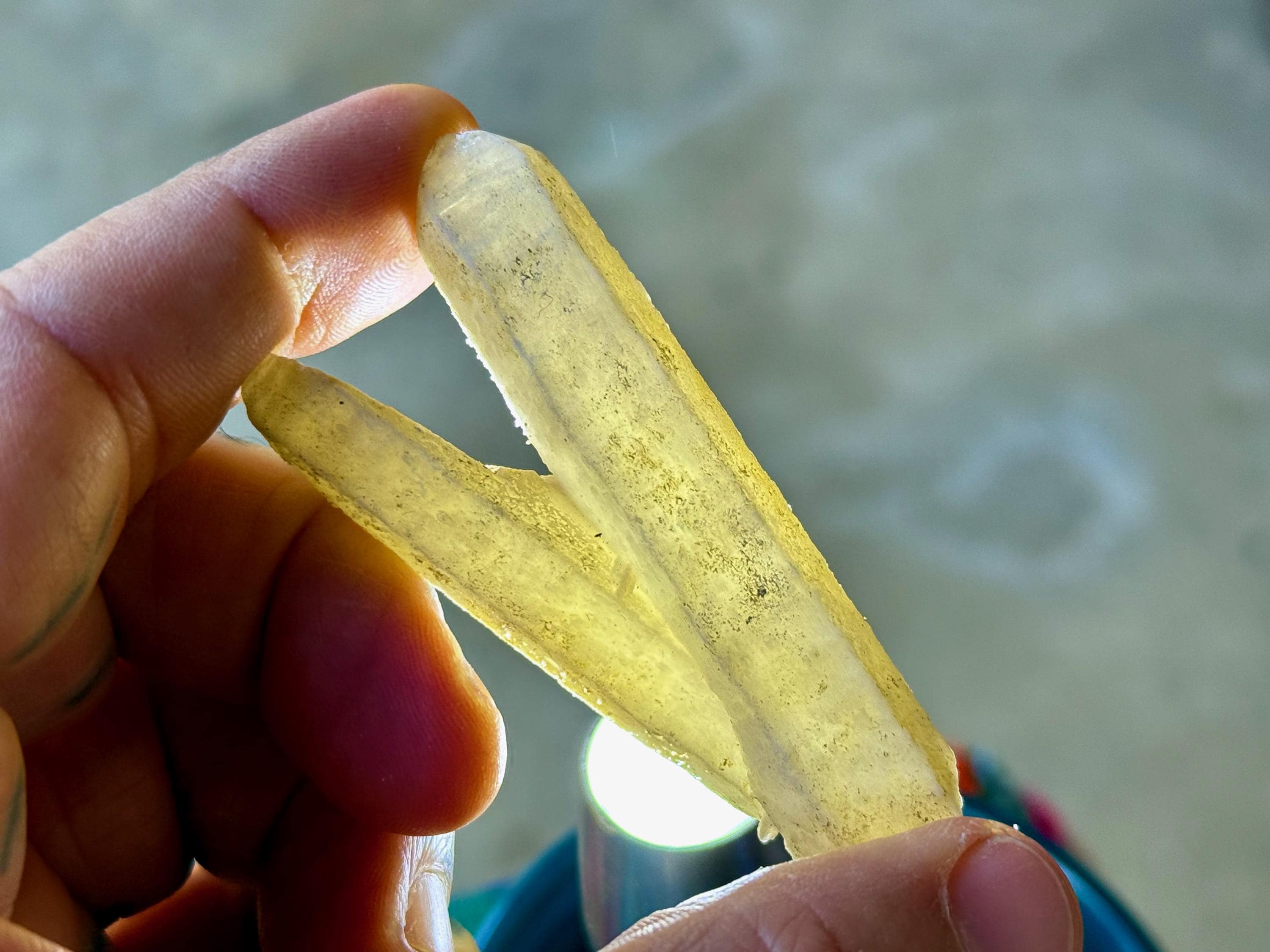 This unique Candle Quartz crystal features mild "candle quartz" textures on its exterior and a gray "frost" of Calicite. When backlit, we can see that it passes light beautifully (Photos 3-5).
