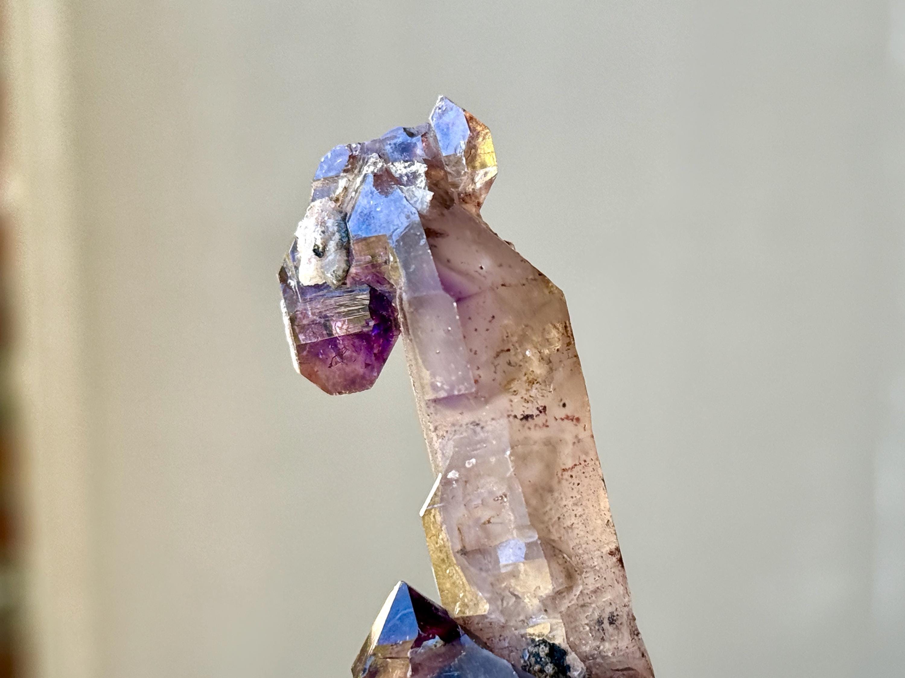 The primary growth on top is a marvelous Elestial formation, and the scepter "stem" protruding from the base is thick and elongated. What is quite special about this piece is the additional Amethyst growth at the bottom of the stem, which is beautifully terminated, making this a Double Terminated crystal.