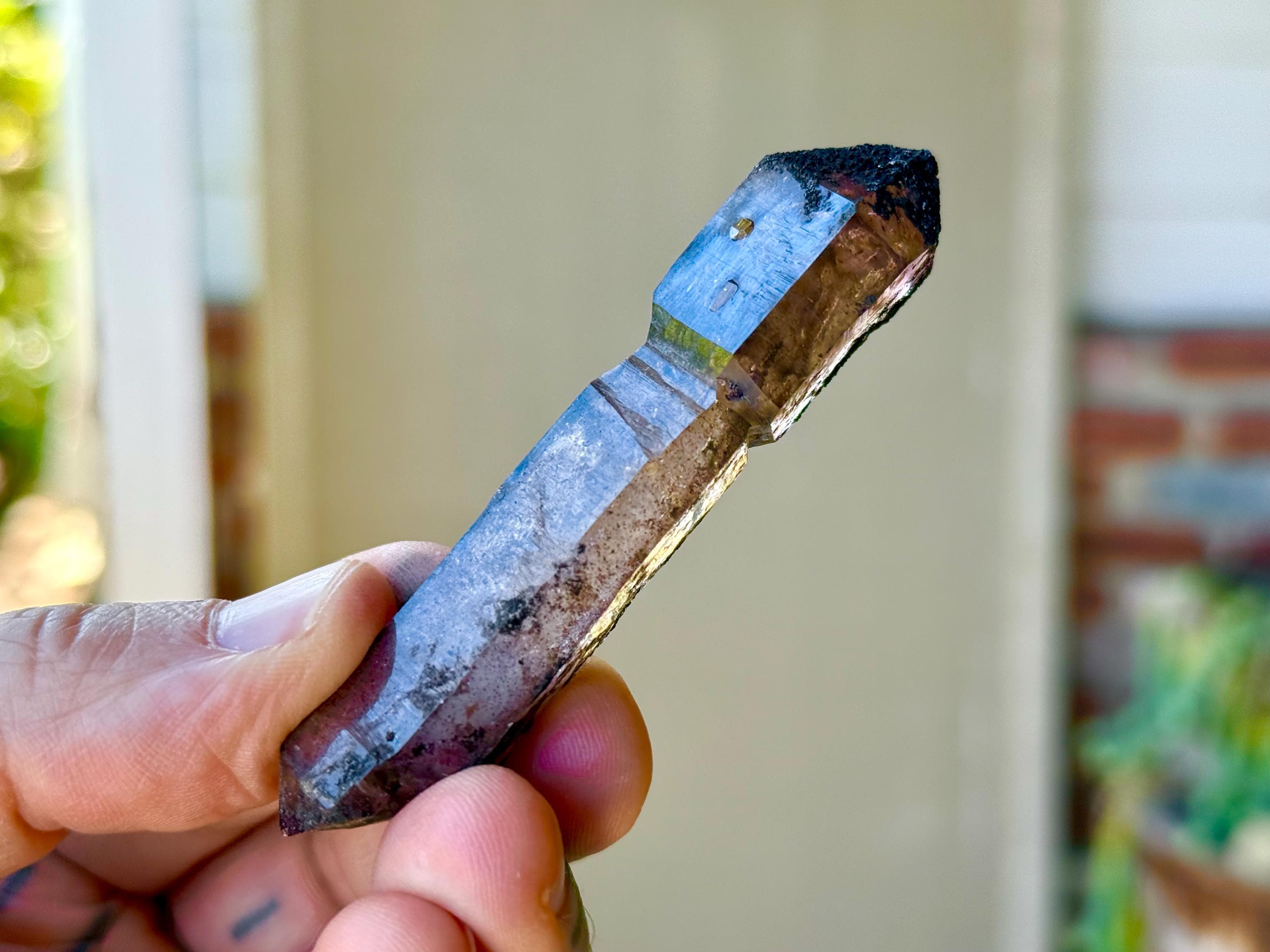 This crystal has a muted color that is partially due to some black Hematite inclusions on the exterior. However, when the light hits right, we can see the lovely smoky and pale purple color on the scepter "stem" and the darker purple hue on the primary growth at the top. When backlit, as in Photos 4-6, we can get a better sense of its color and translucency.