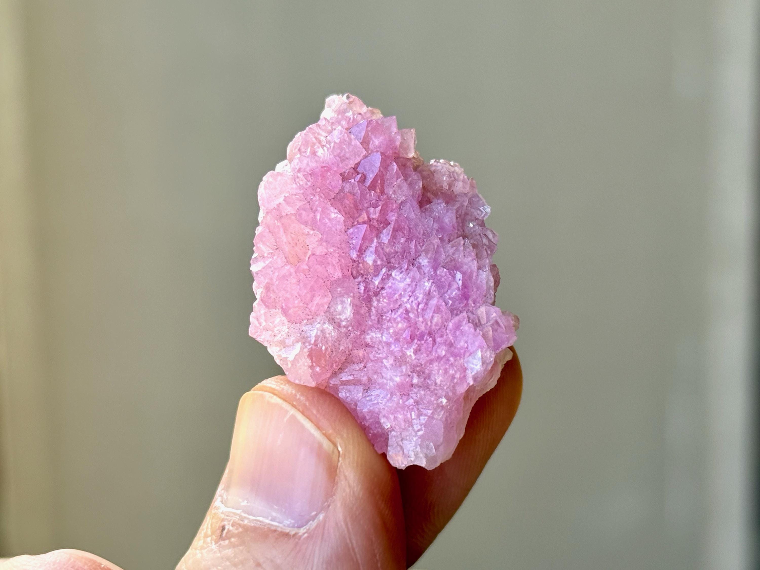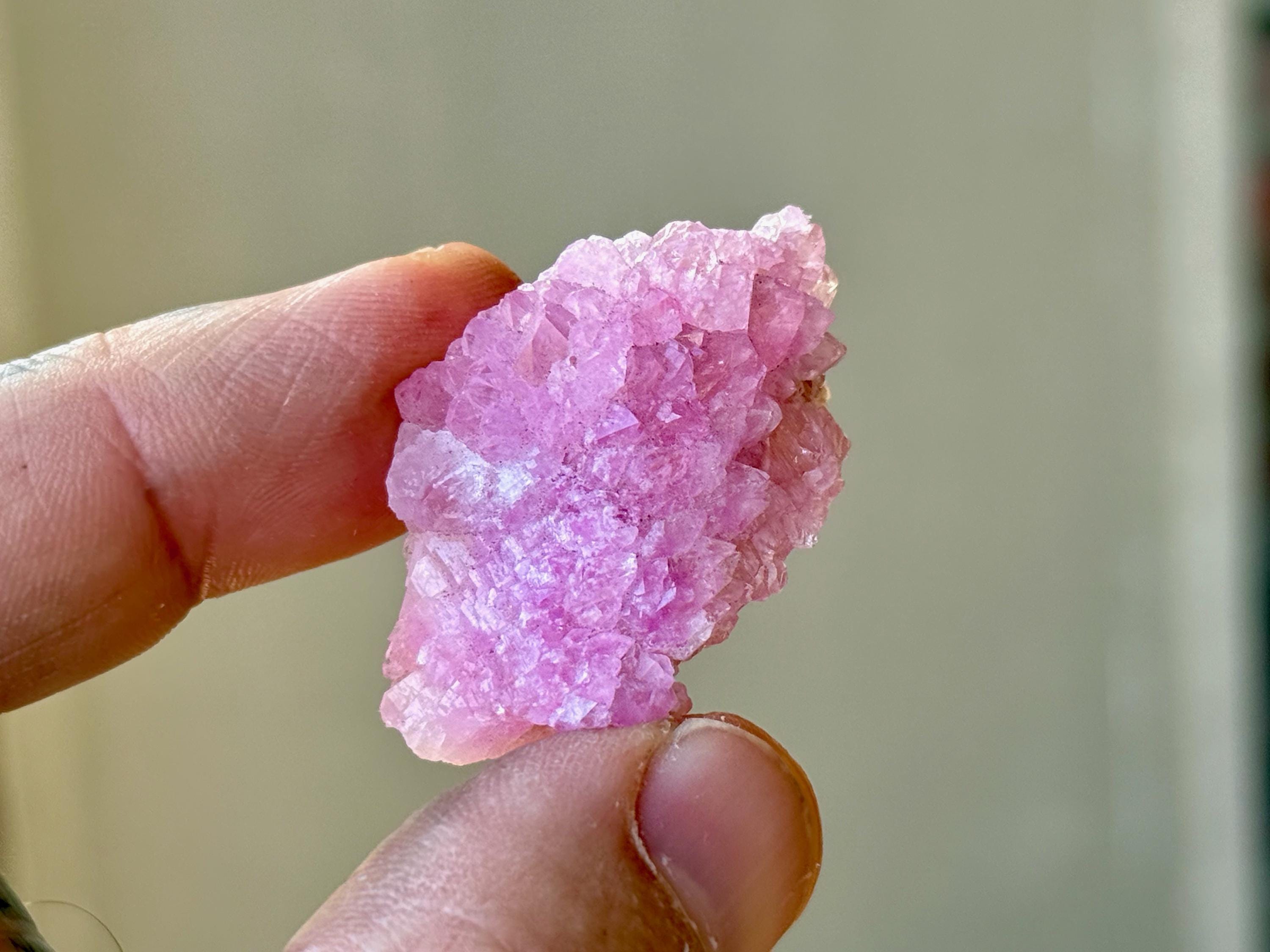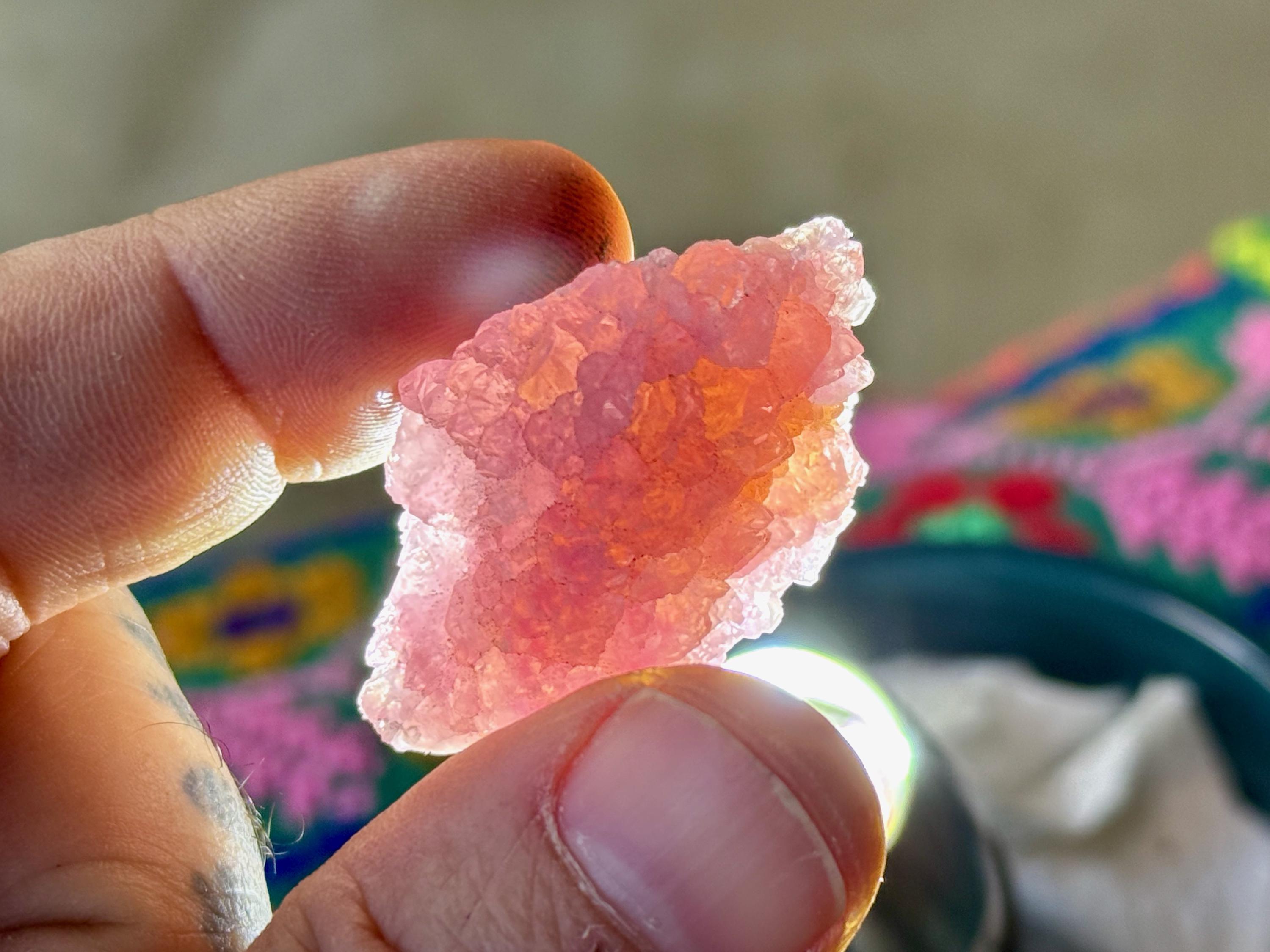 Exquisite luster and a juicy, vibrant pink color to this stunning Canga Rose Quartz in a crystallized formation. This piece is ENTIRELY Canga Rosa with no other matrix. When backlit, we can see just how well this piece passes light (Photos 3-4).