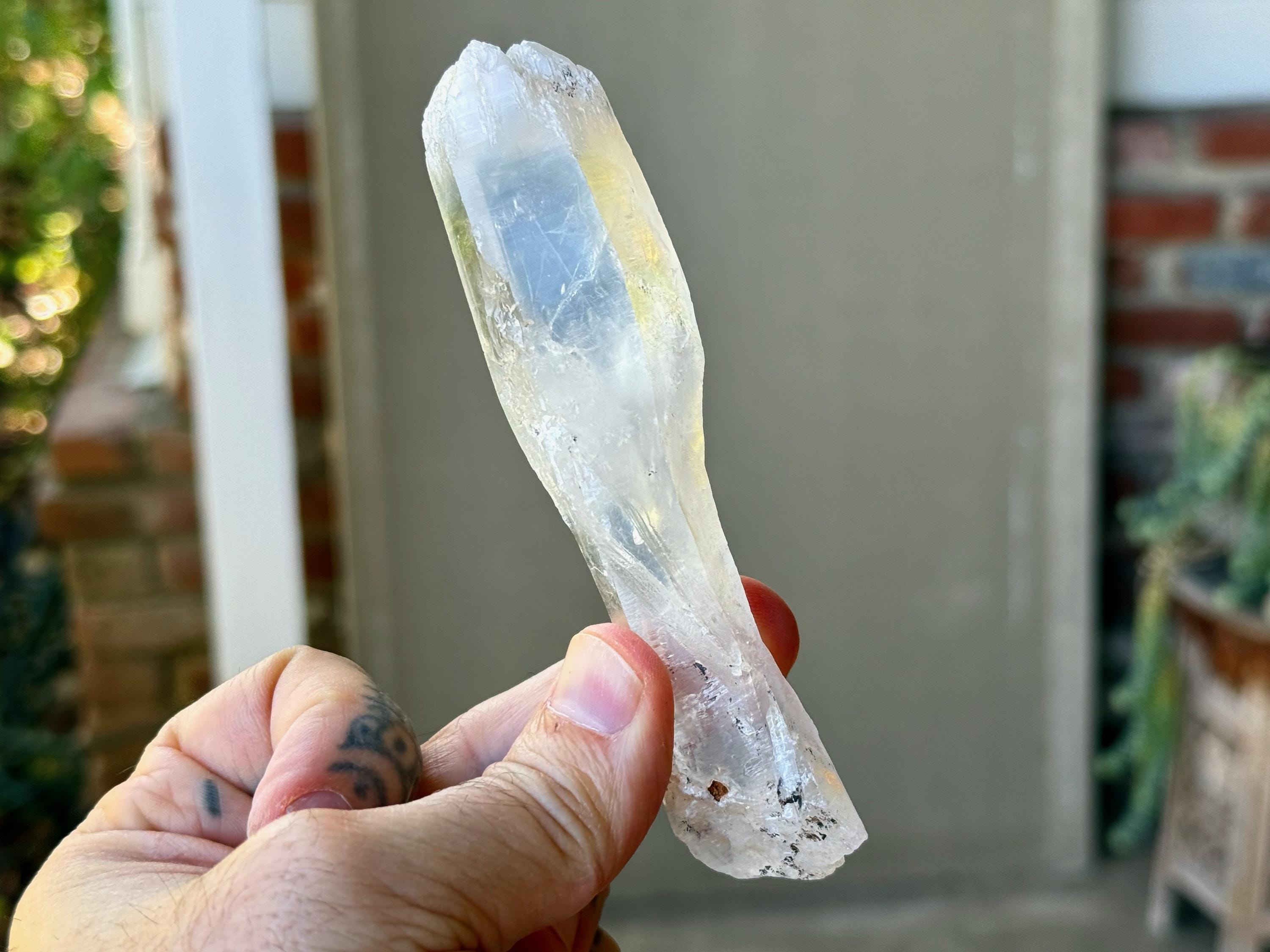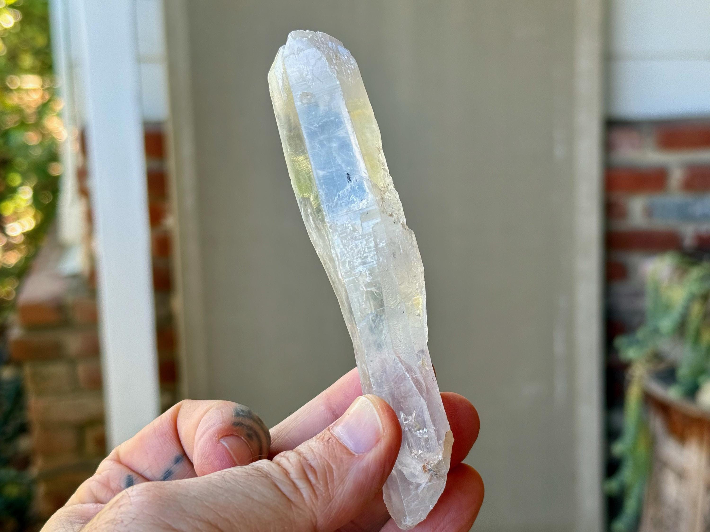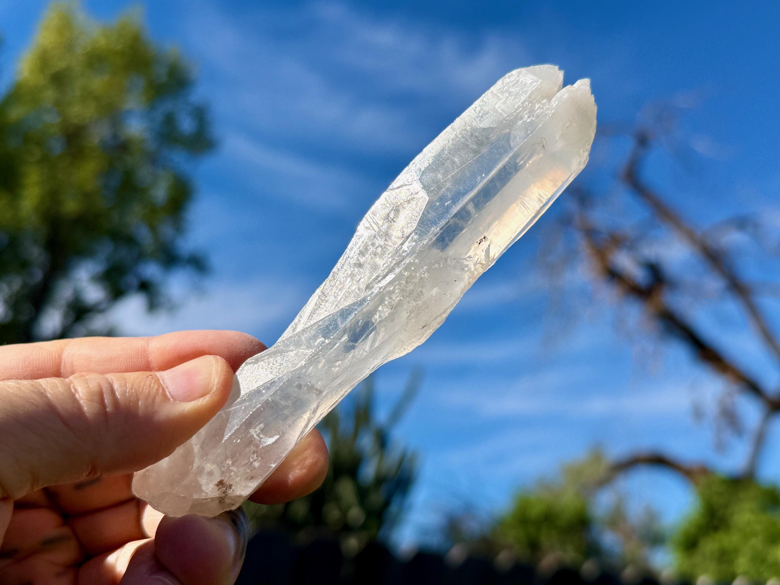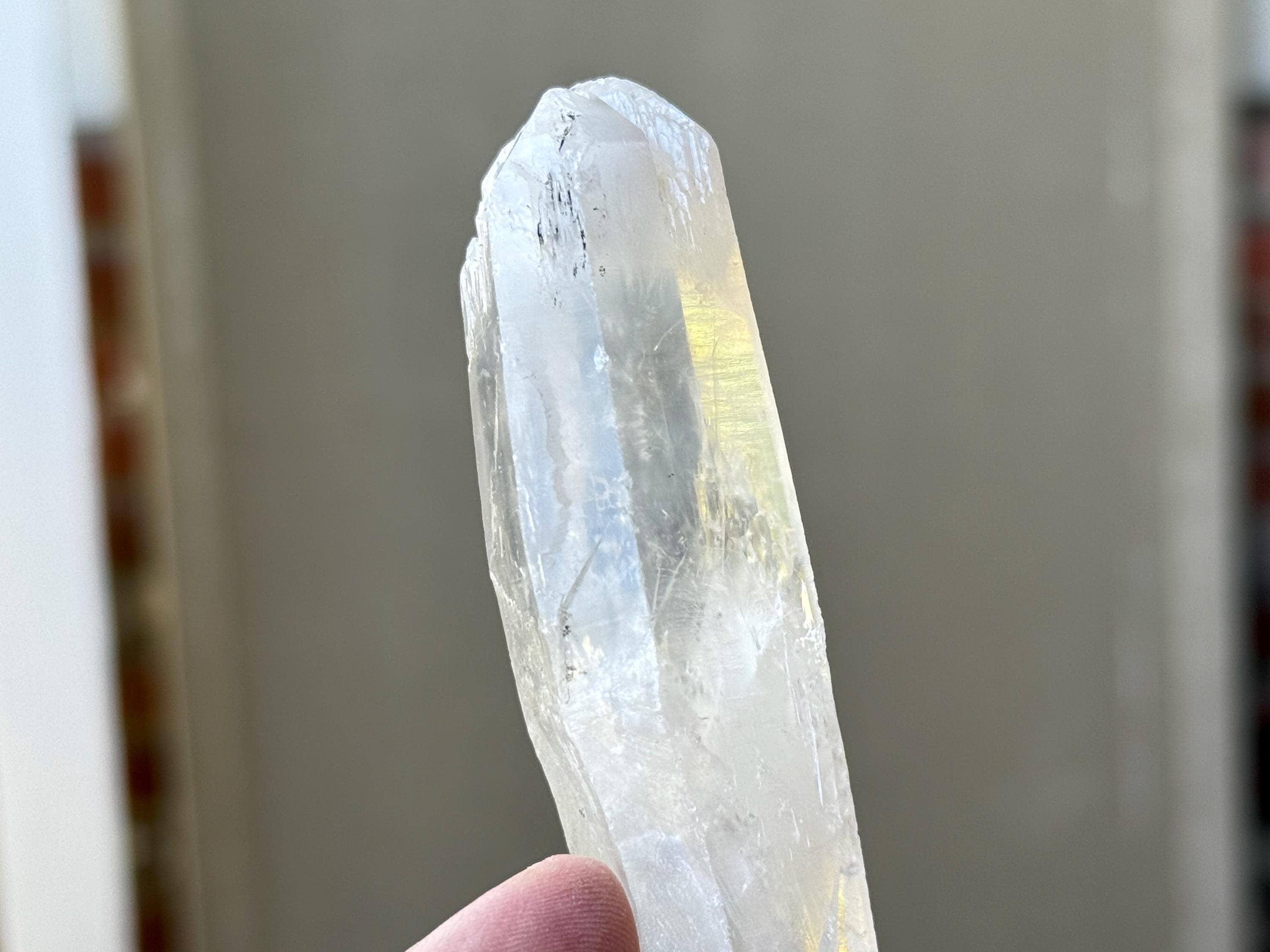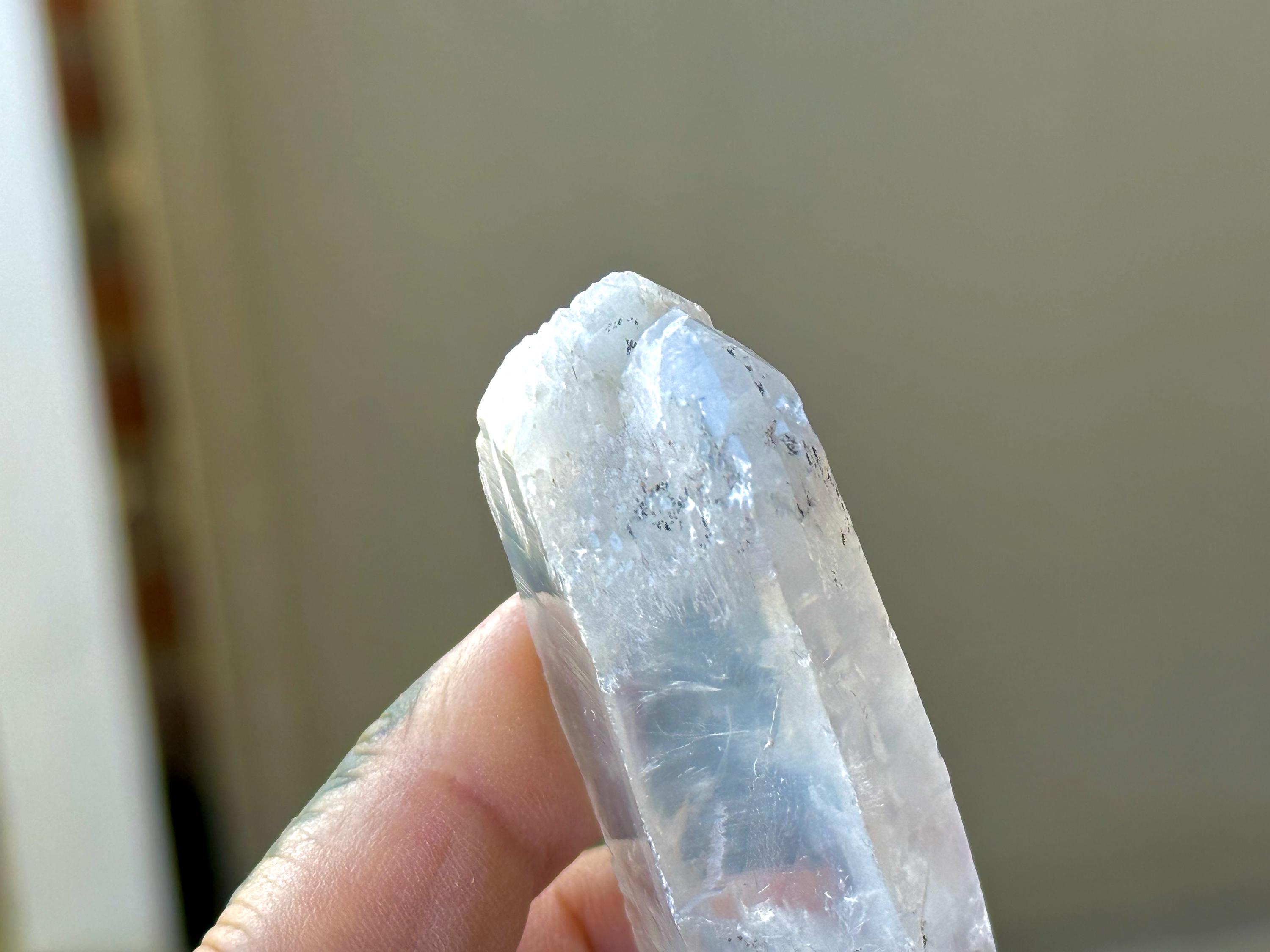 Beautiful luster and excellent clarity, with a bit of an ethereal complexion, to this nicely sized White Tipped Quartz with rich inclusions of Halloysite throughout. This piece features an elongated formation and has two bands of Halloysite inclusion, one at the center and one at the top. The top features a very cool etched termination (Photos 5-6). An awesome "wand" of a crystal!