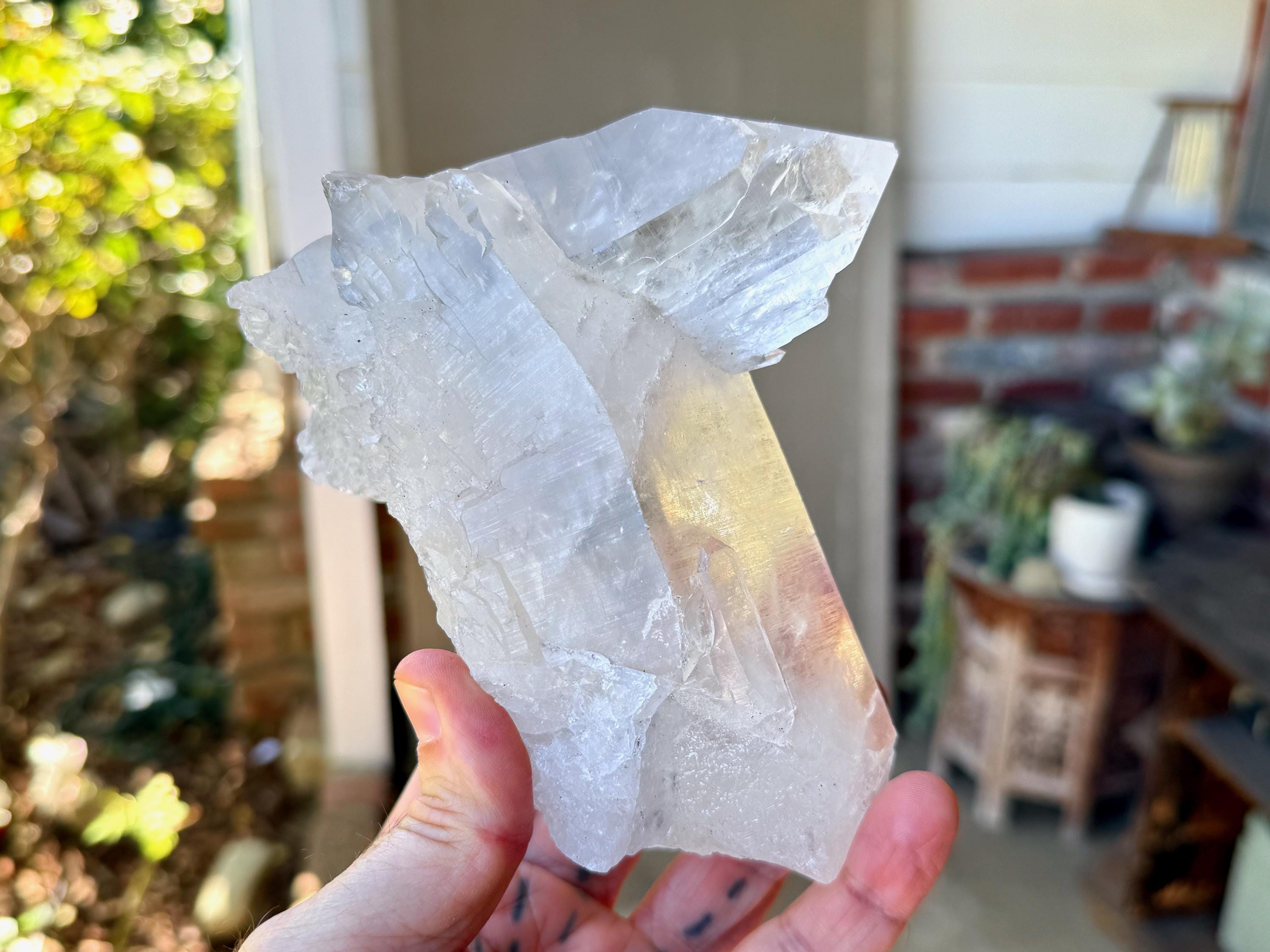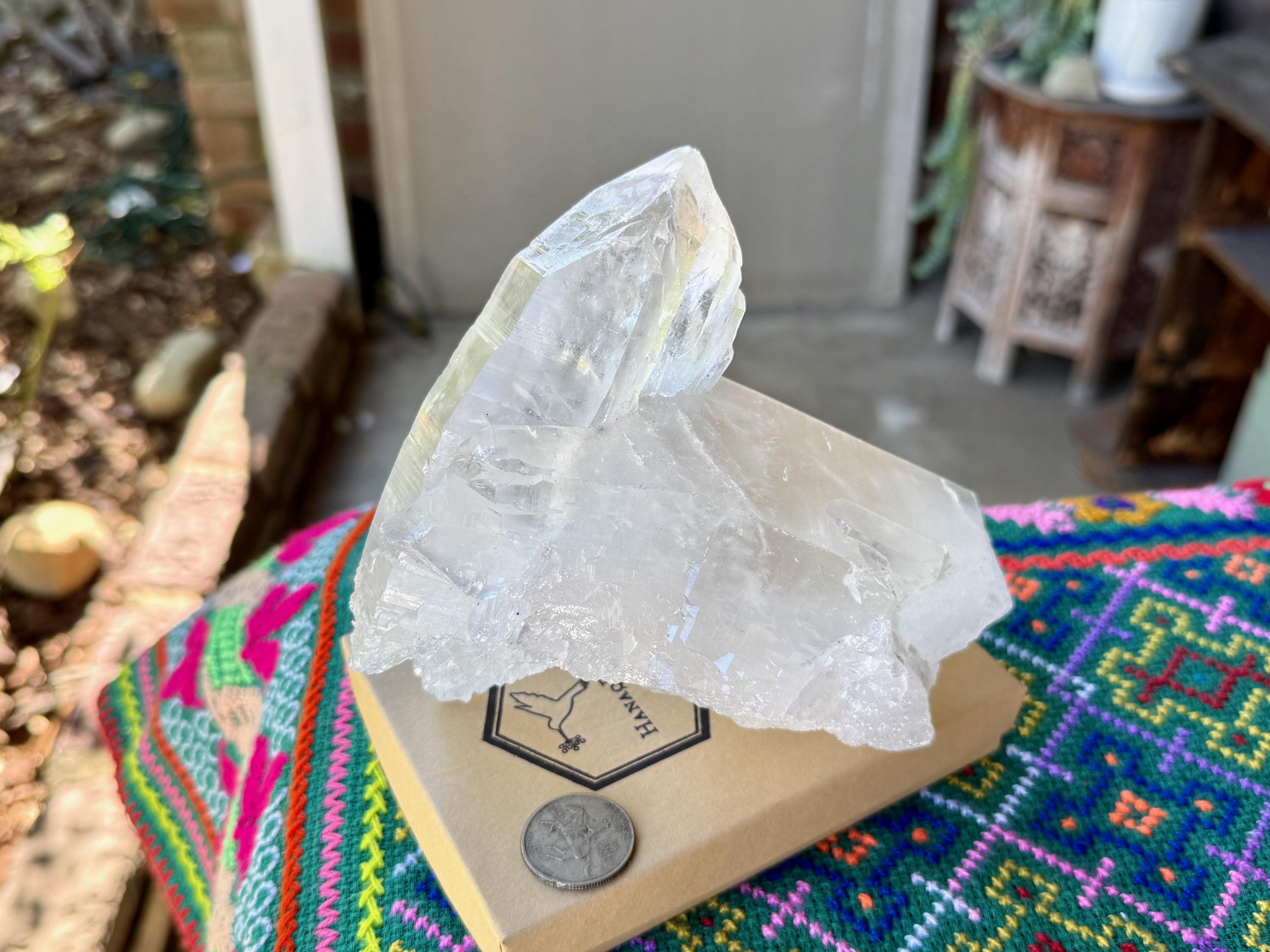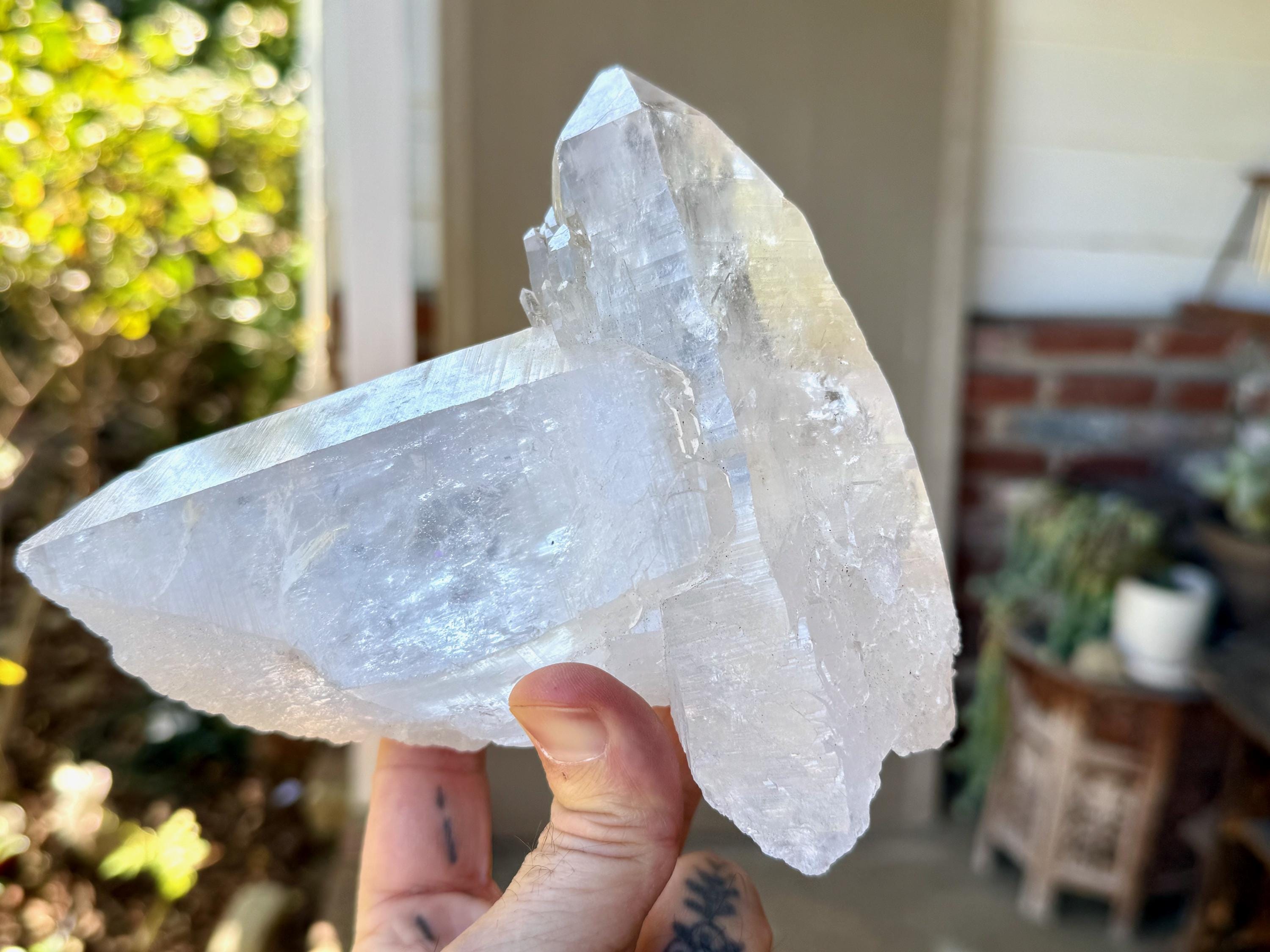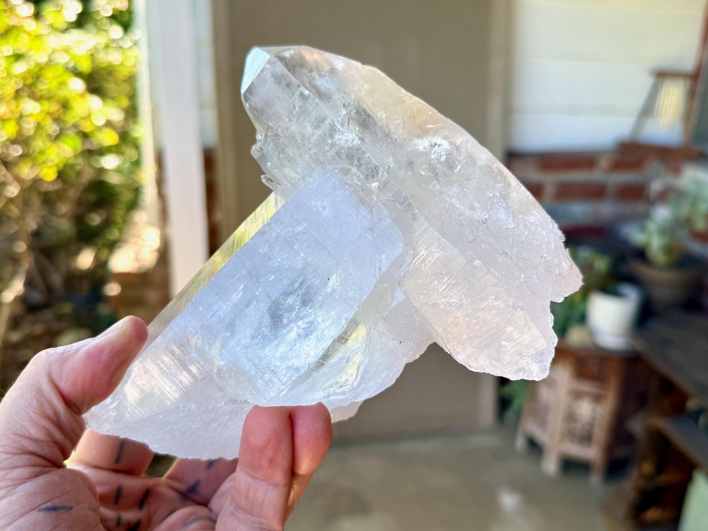 Gorgeous luster and marvelous clarity to this large and uniquely formed Lemurian Quartz crystal. This formation is a bit of a "tomahawk", with a large Lemurian crystal set atop and embedded into a second large Lemurian Quartz crystal at its top. This is an entirely natural formation!