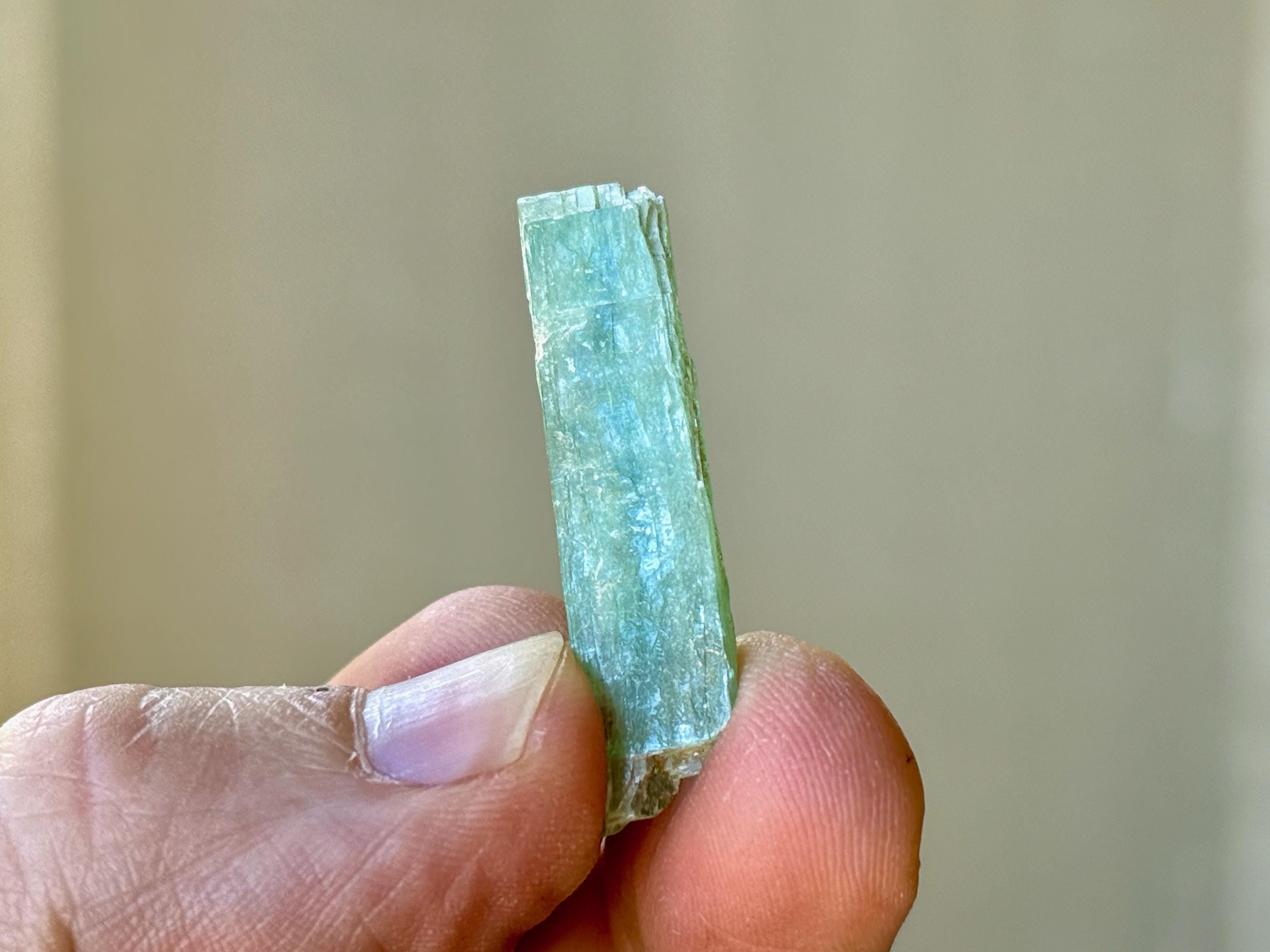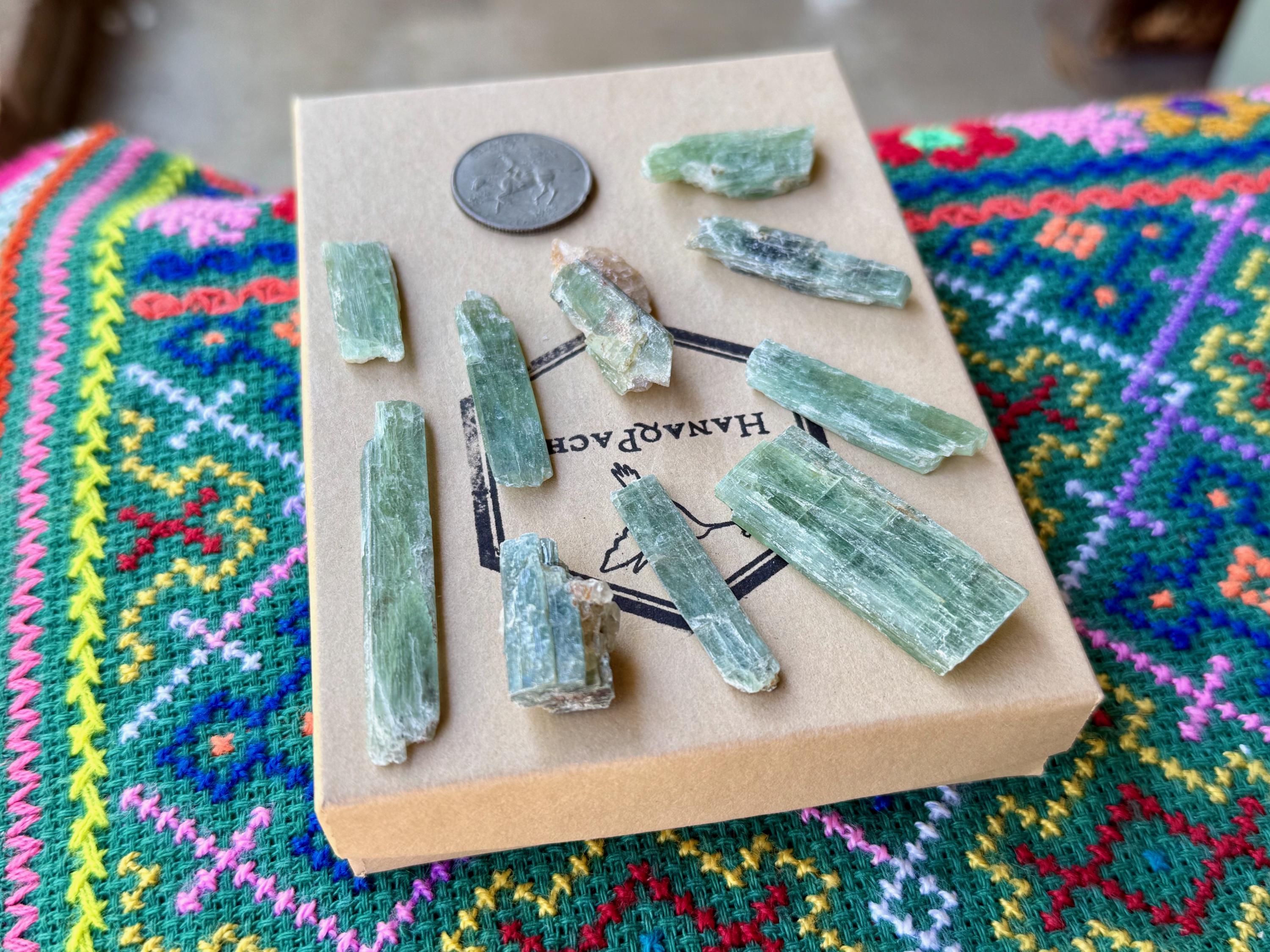 A very nice collection of these old find Green Kyanite crystals with vibrant green hues. These crystals pass light beautifully when backlit (as pictured) and are all natural formations.