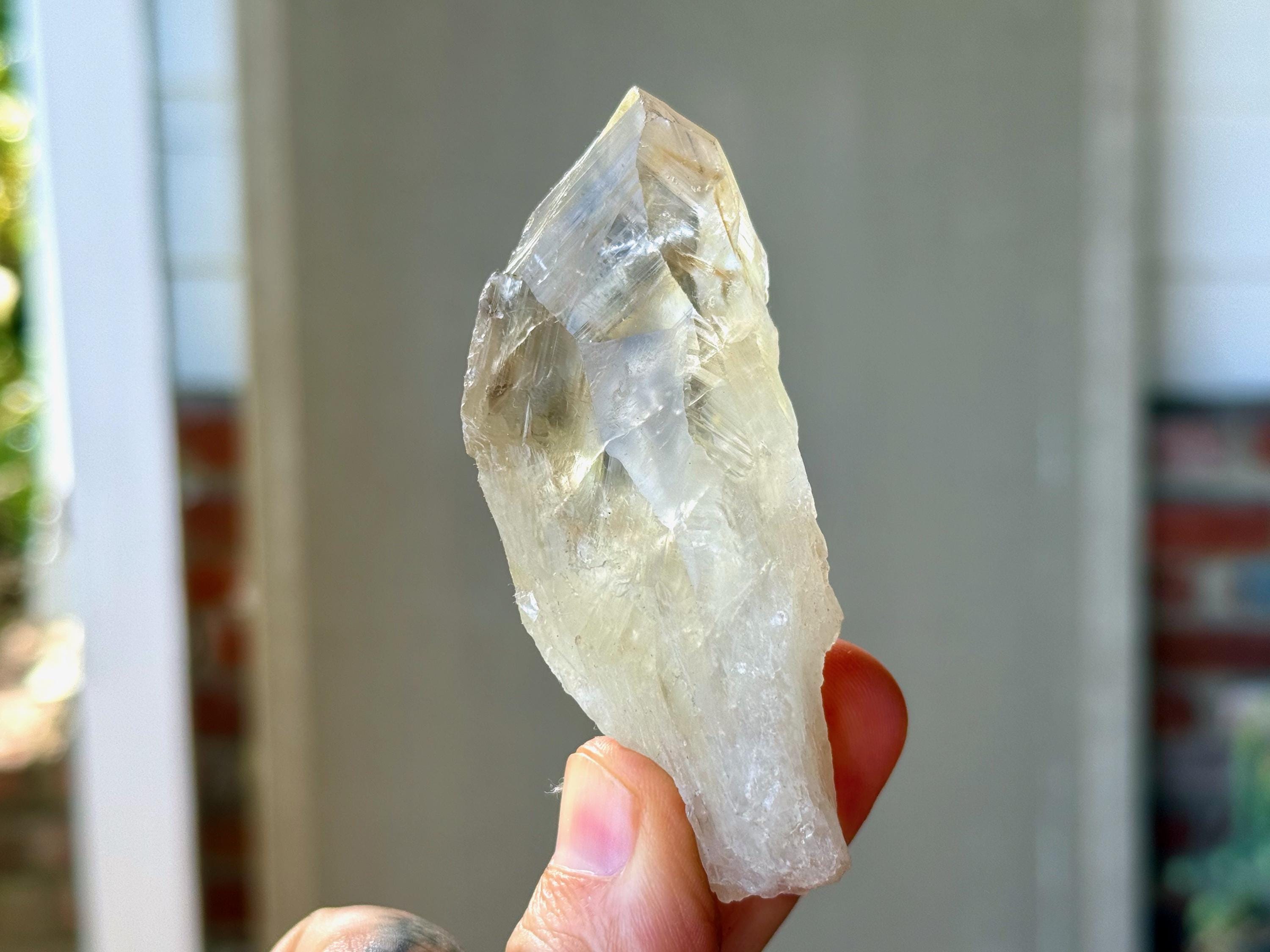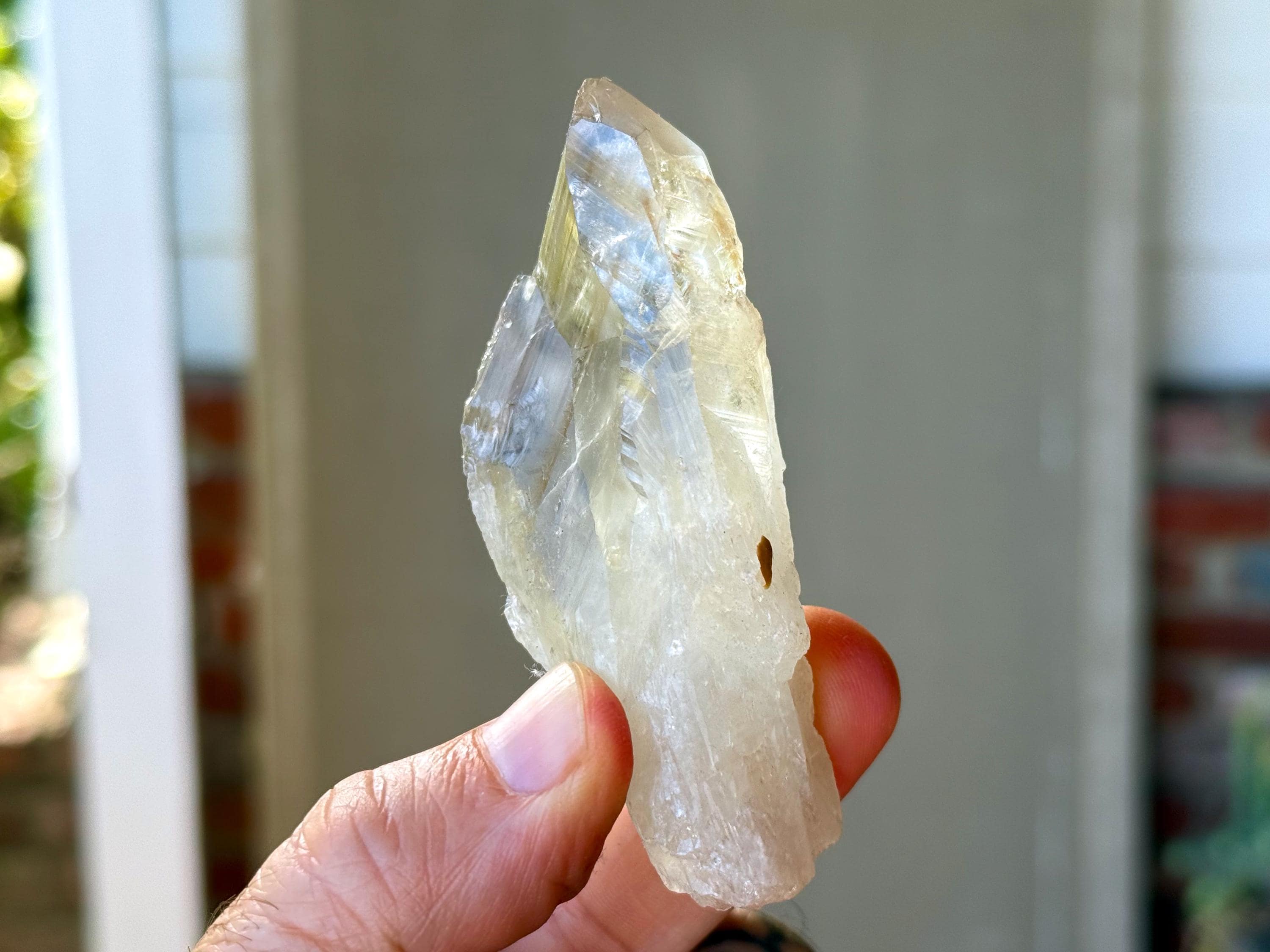 Superb clarity and brilliant luster to this Powellite Phantom Quartz in an elongated "root" formation, with unique, textural contact imprints covering its body. This crystal has a *very* mild tinge of golden color, indicating some possible Citrine inclusion.