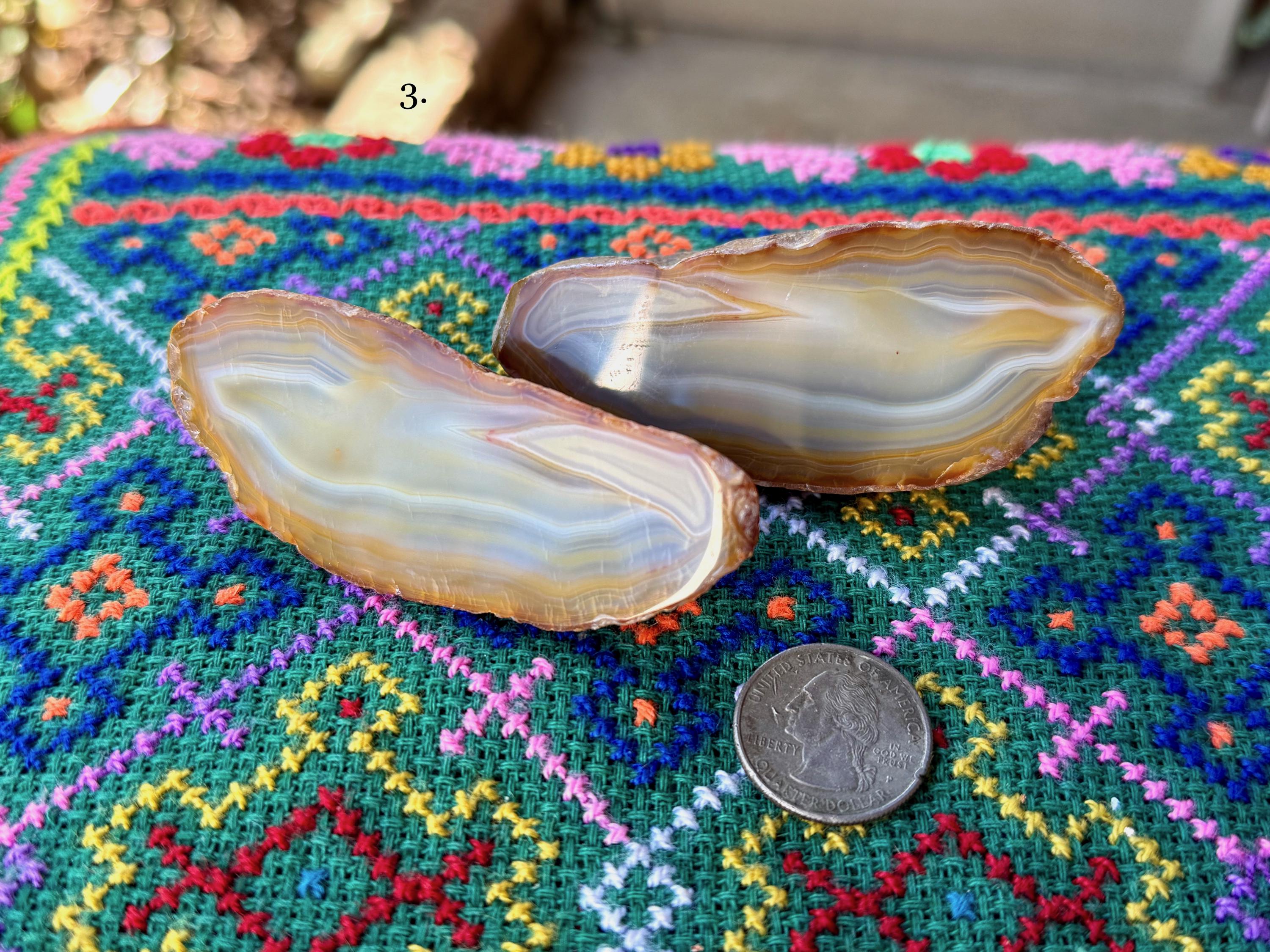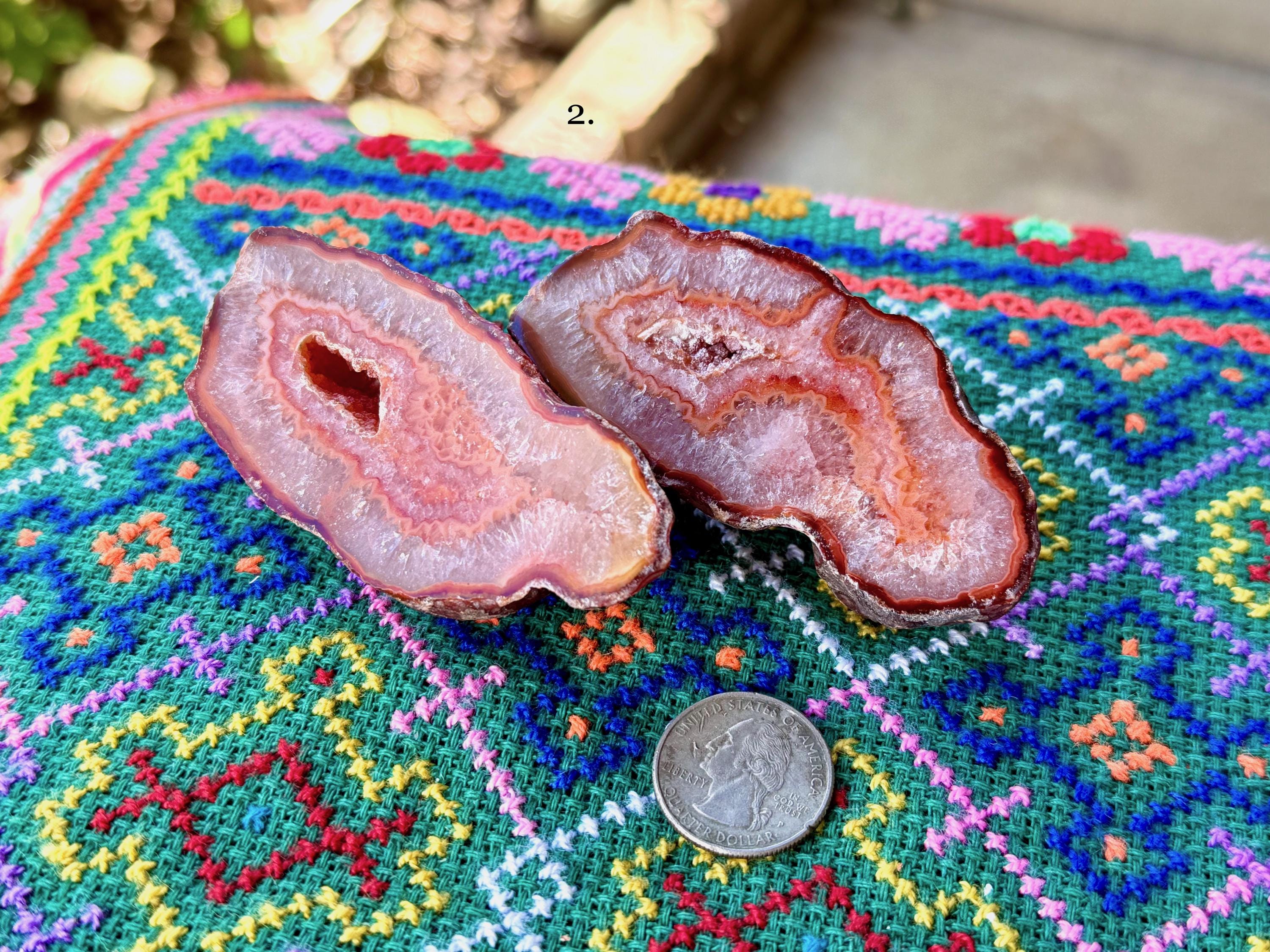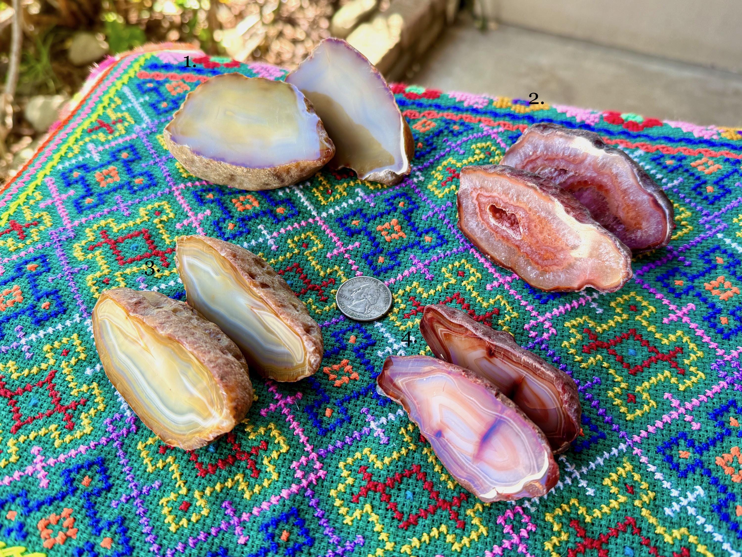 Each individual agate is between 3" - 3.5" (7.5 cm - 9 cm) tall and weighs between 64g - 231g (per halve).