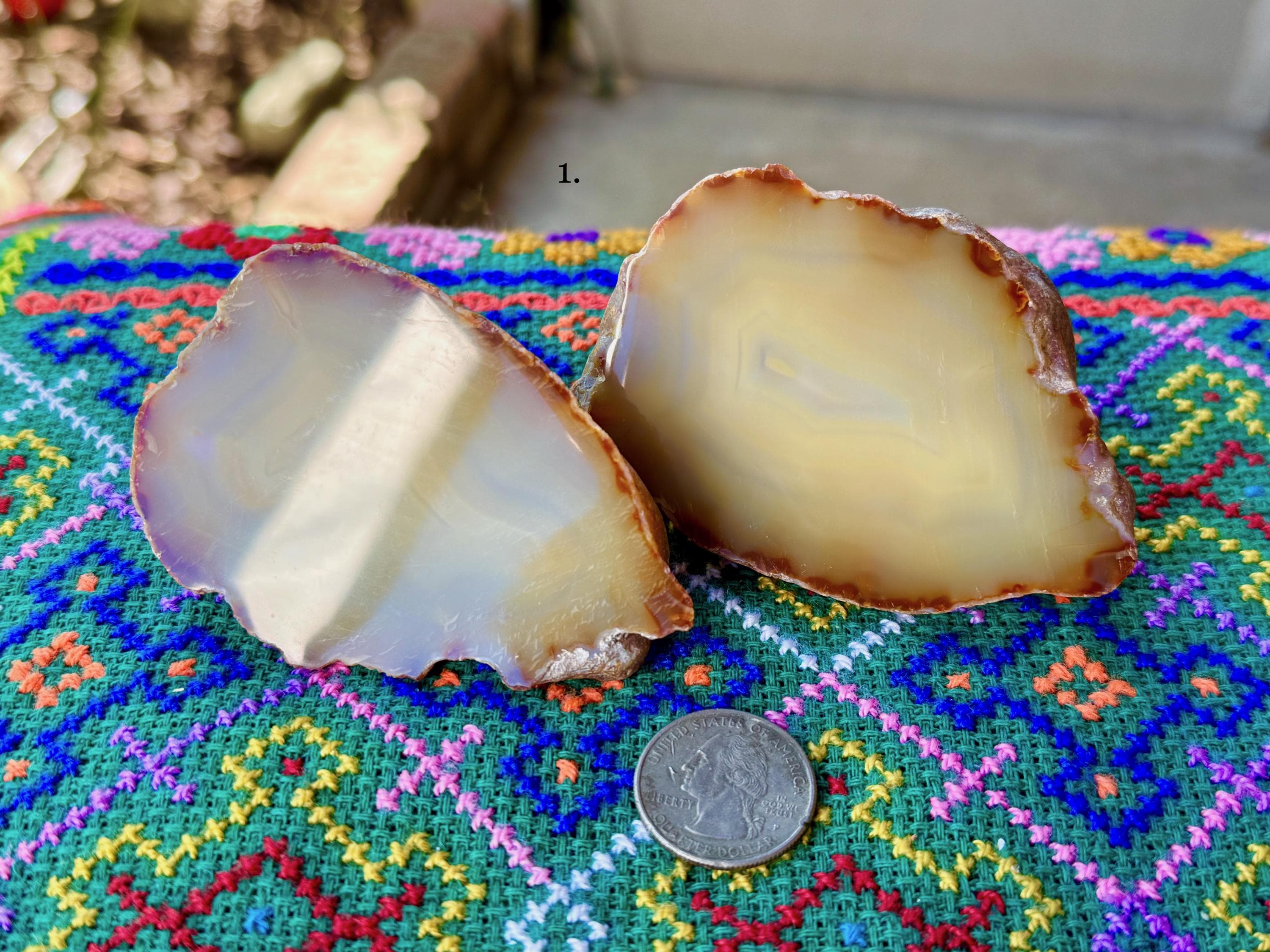 These are actually each single Carnelian nodules that have been split down the center and have had their broad faces polished. Carnelian inspires courage and promotes positive, empowered life choices.