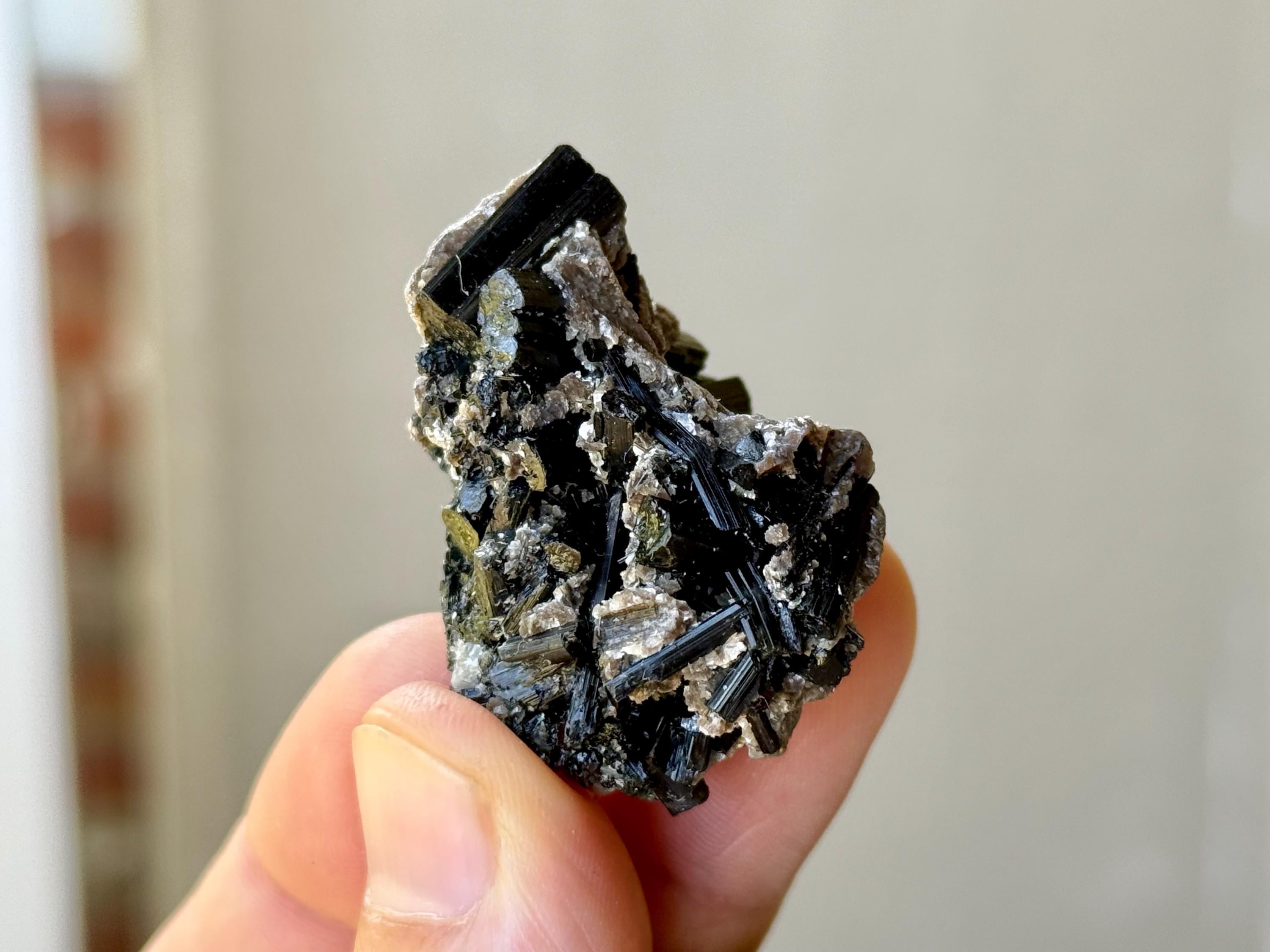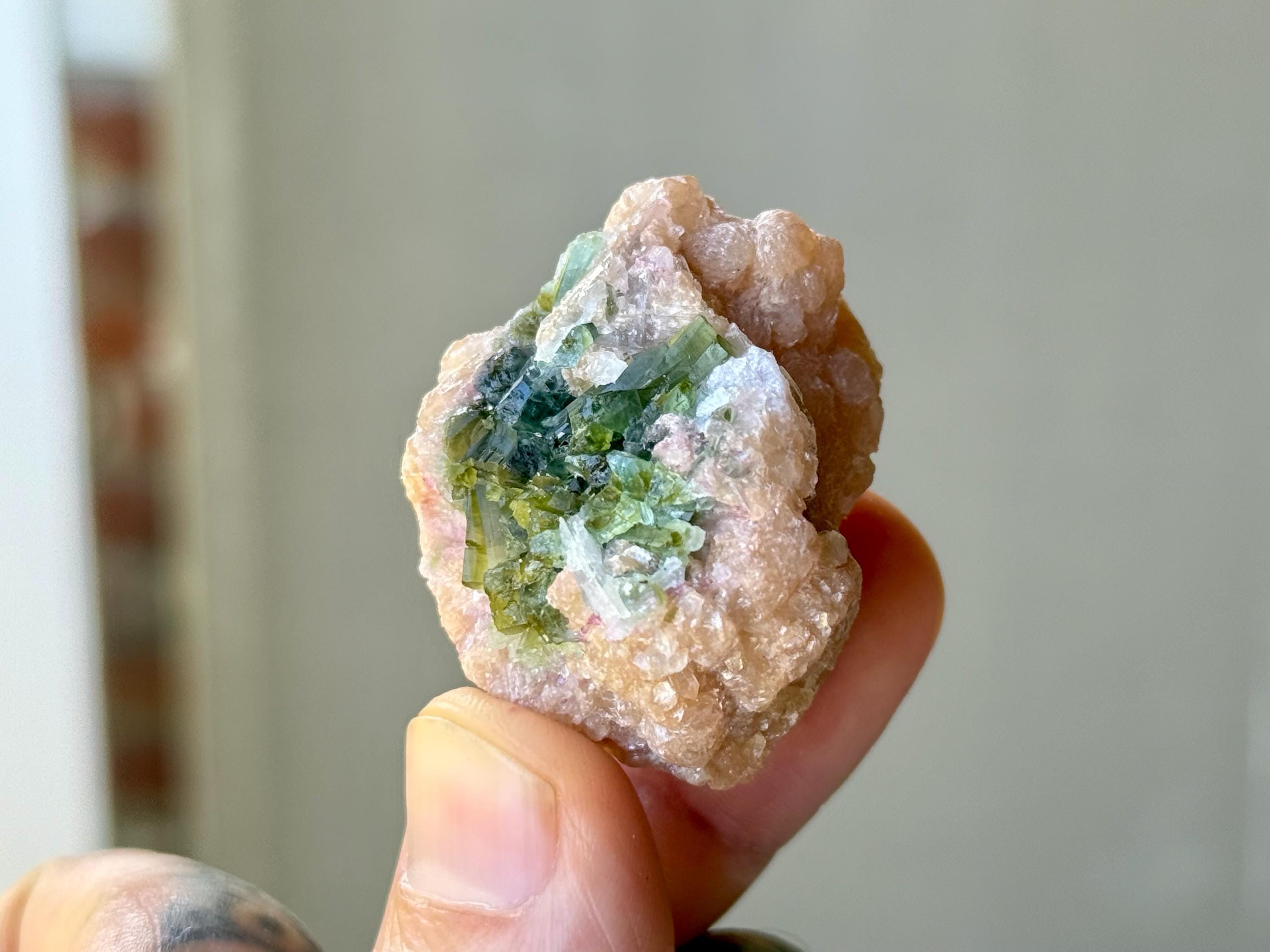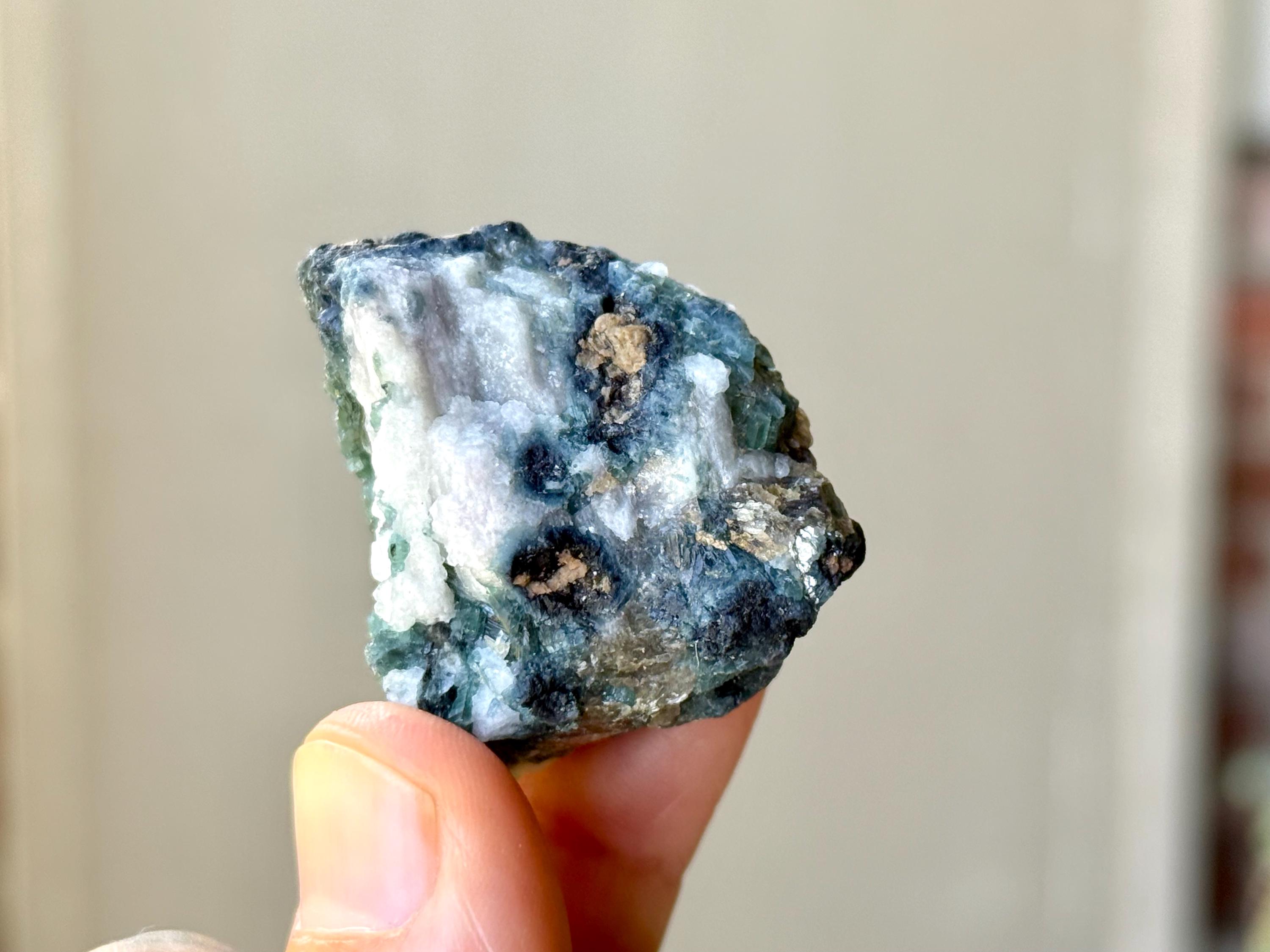 A beautiful lot of Unicorn Stone Quartz featuring vibrant inclusions of Green Tourmaline (and one with Pink, one with Blue Tourmaline), Lepidolite, Albite and Golden Mica. These crystals possess fabulous luster and vibrant color. When backlit, we can see just how gemmy and translucent the tourmaline inclusions are.