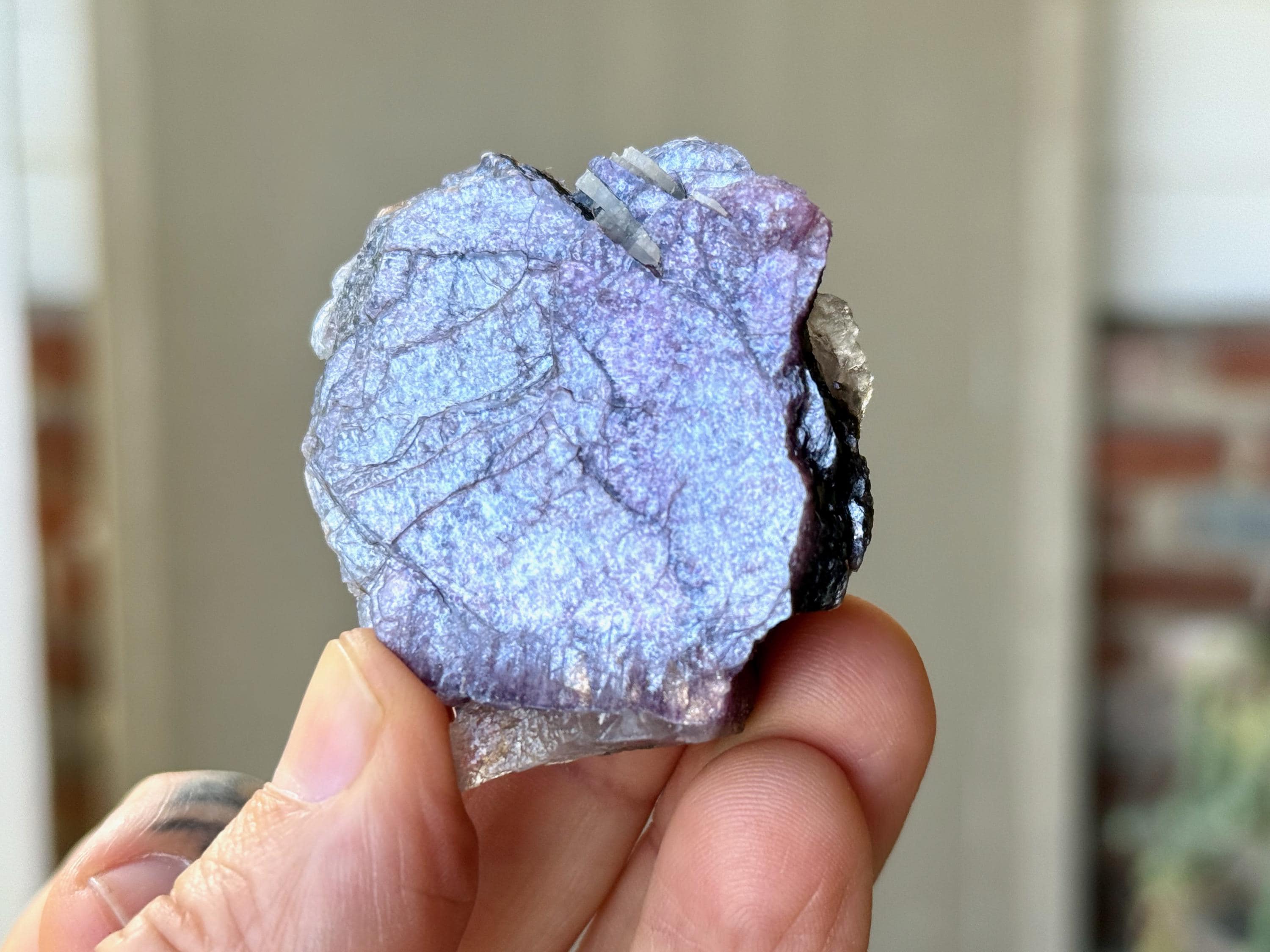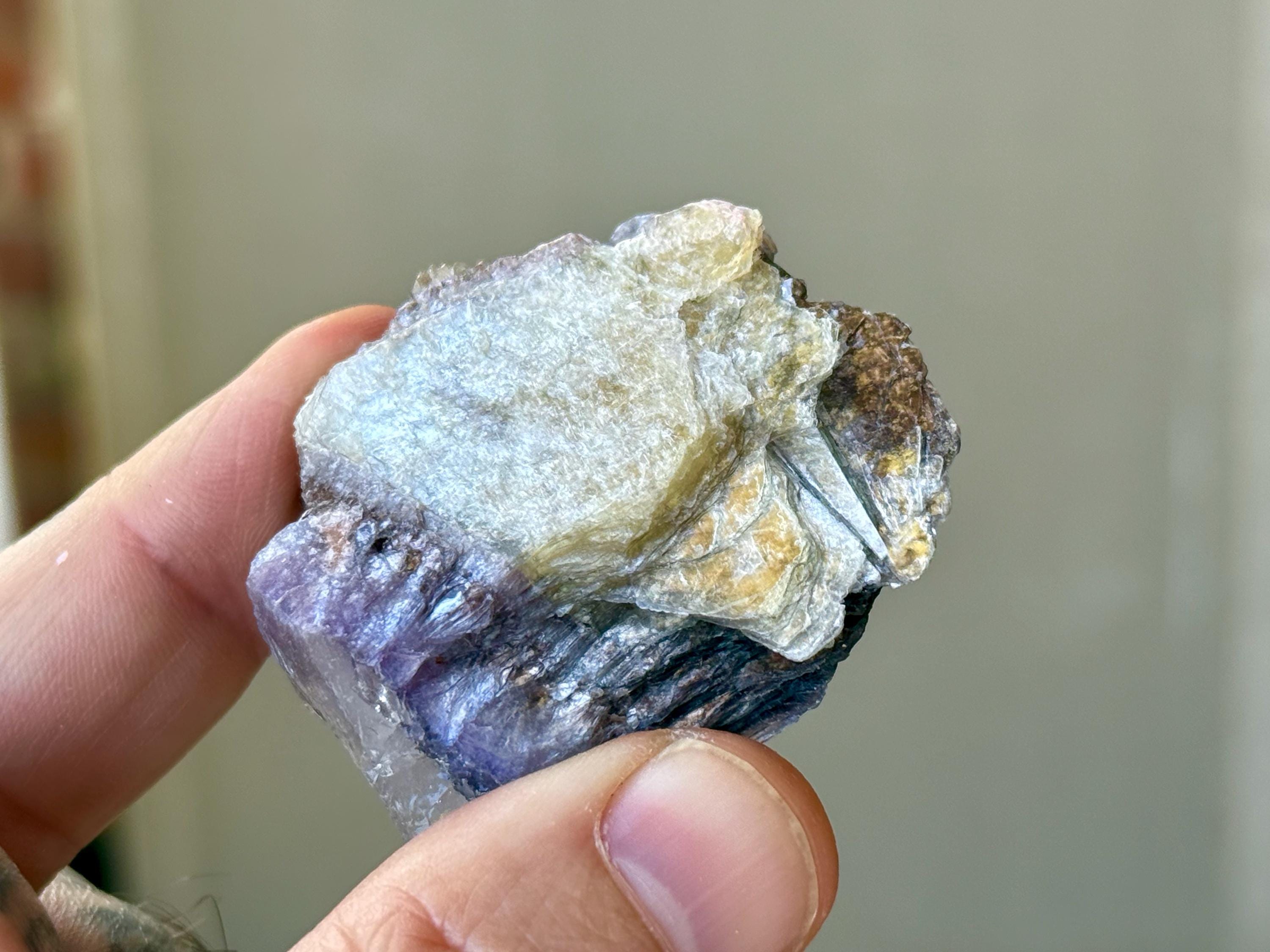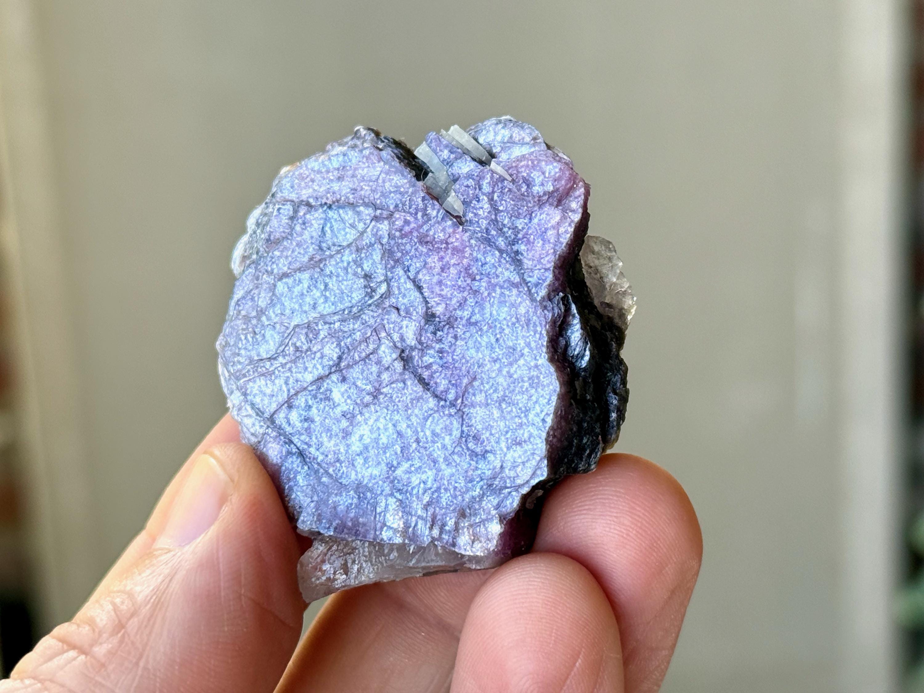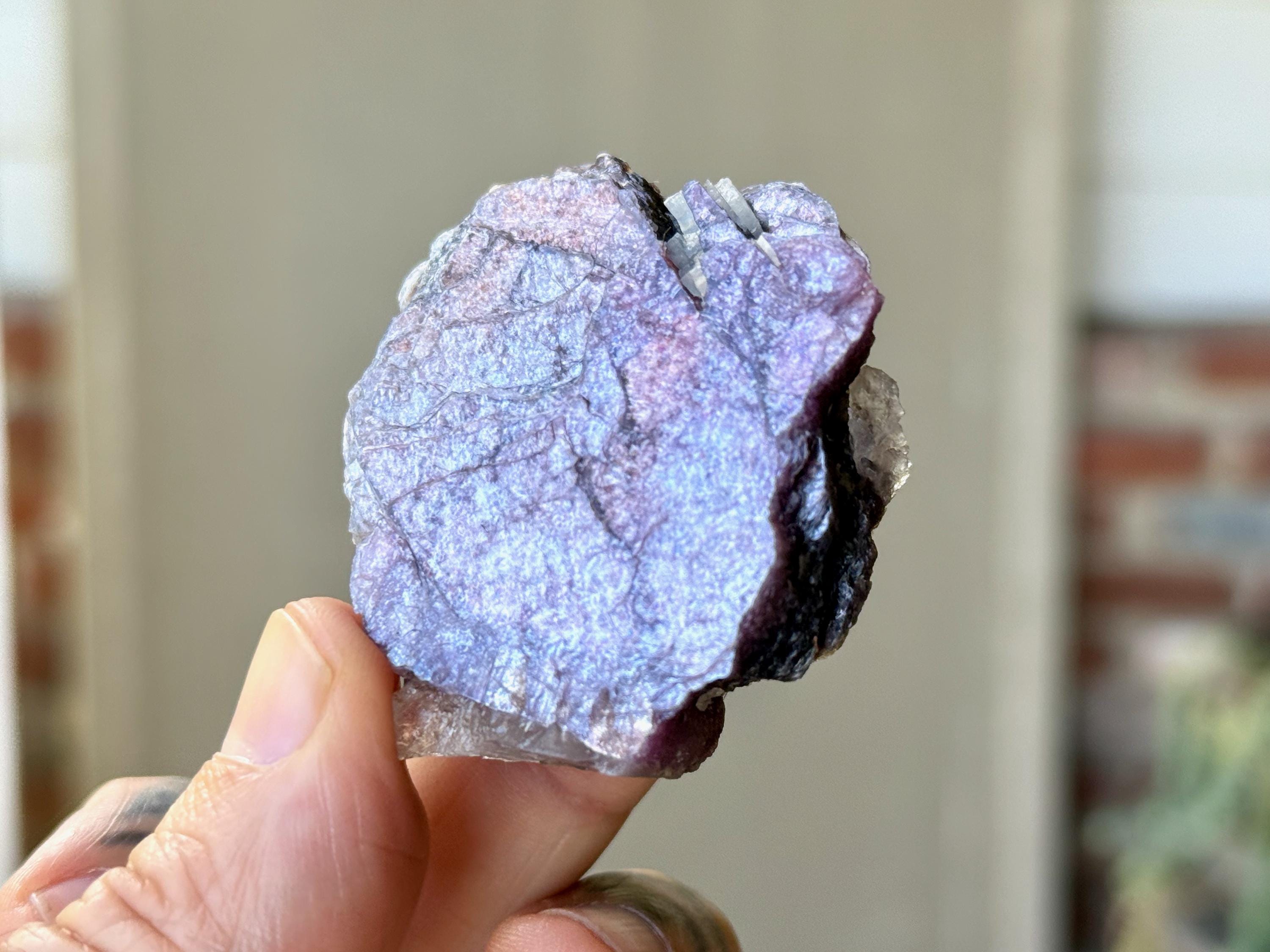 A sparkling, metallic complexion to this unique Bicolor Lepidolite crystal with a broad "plate" formation. This crystal features a combination of vibrant purple Lepidolite, with an embedded layer of silvery Lepidolite on one side. It's one of the only pieces from this find that has this bicolor look.