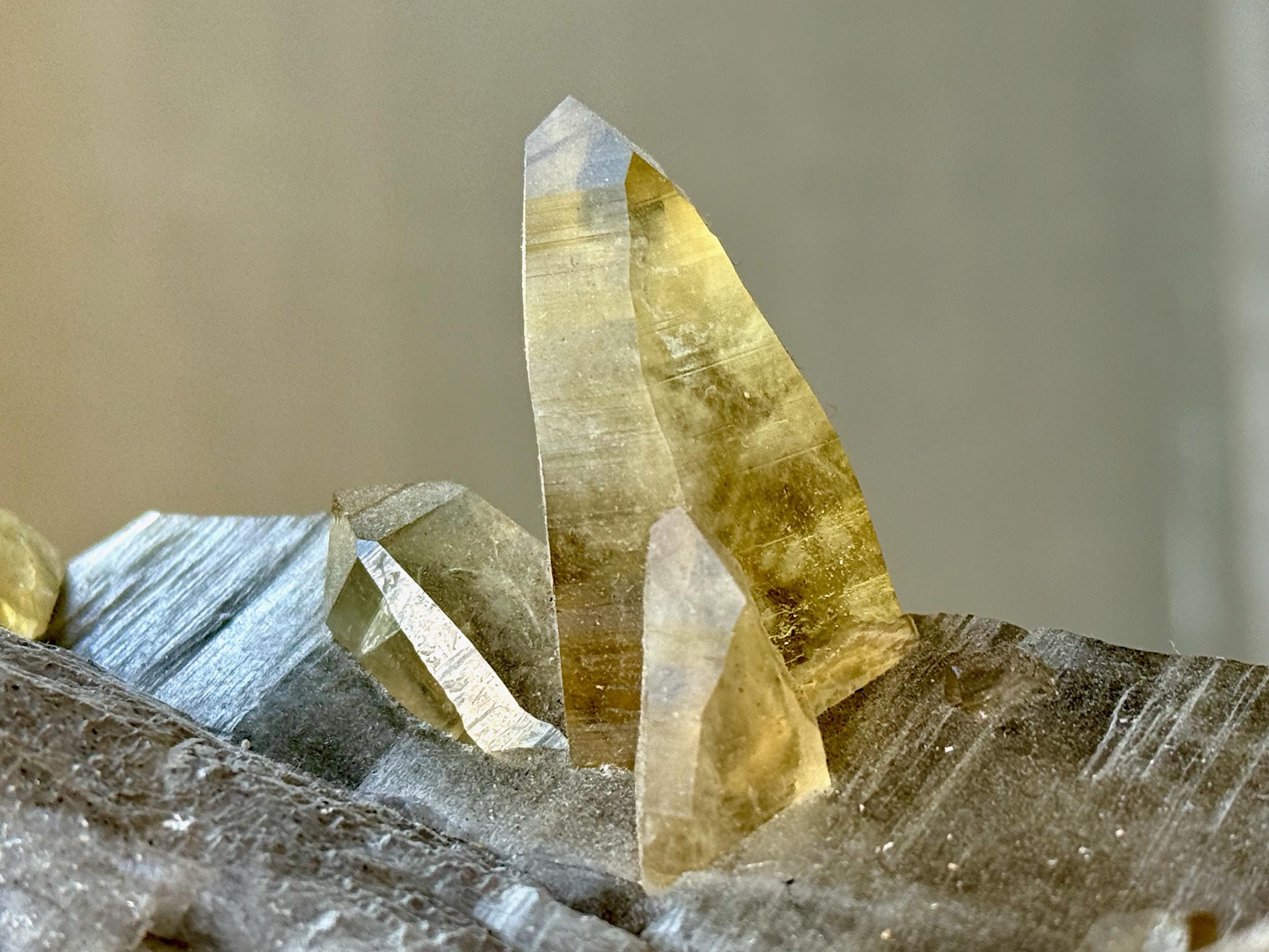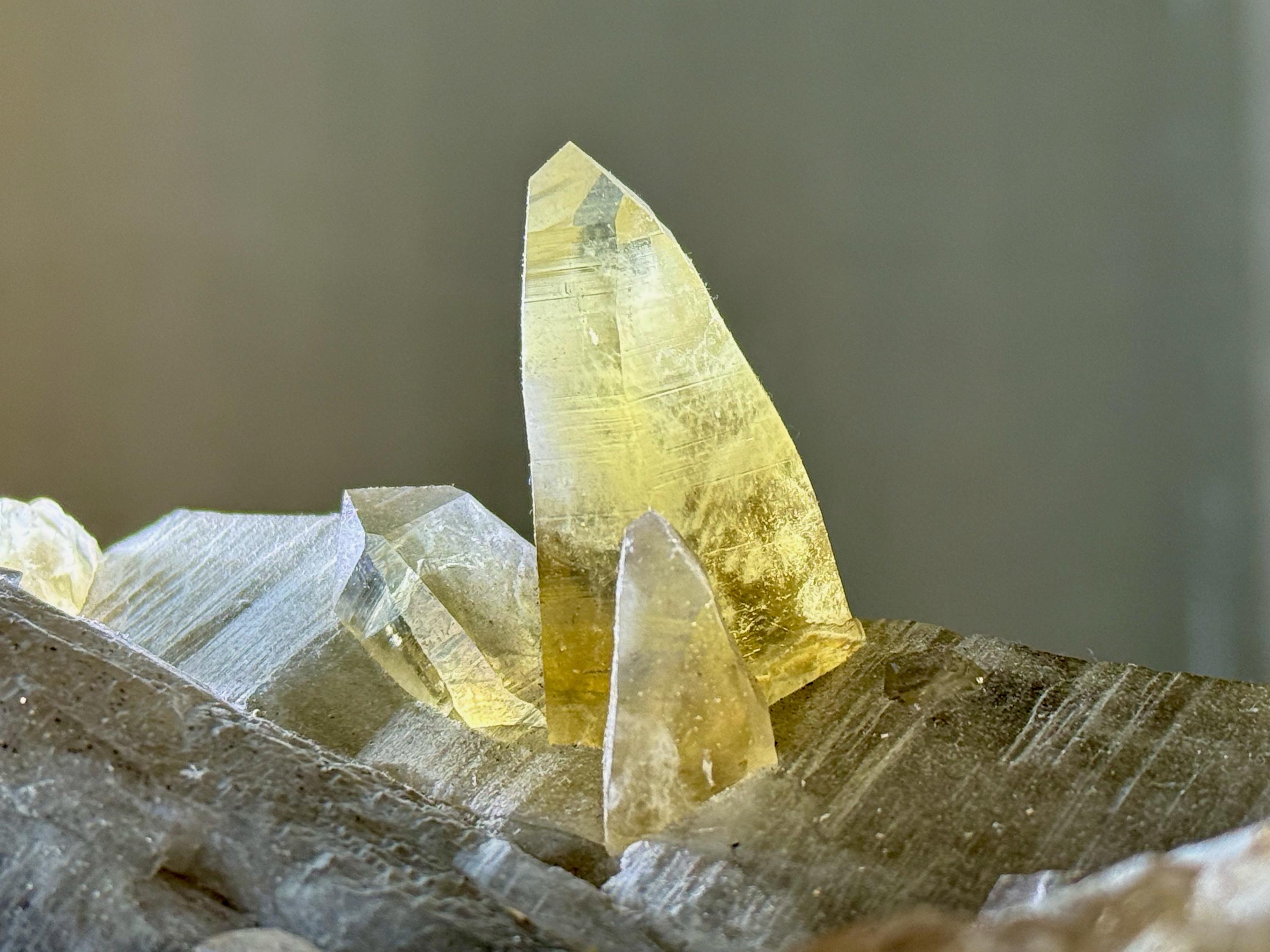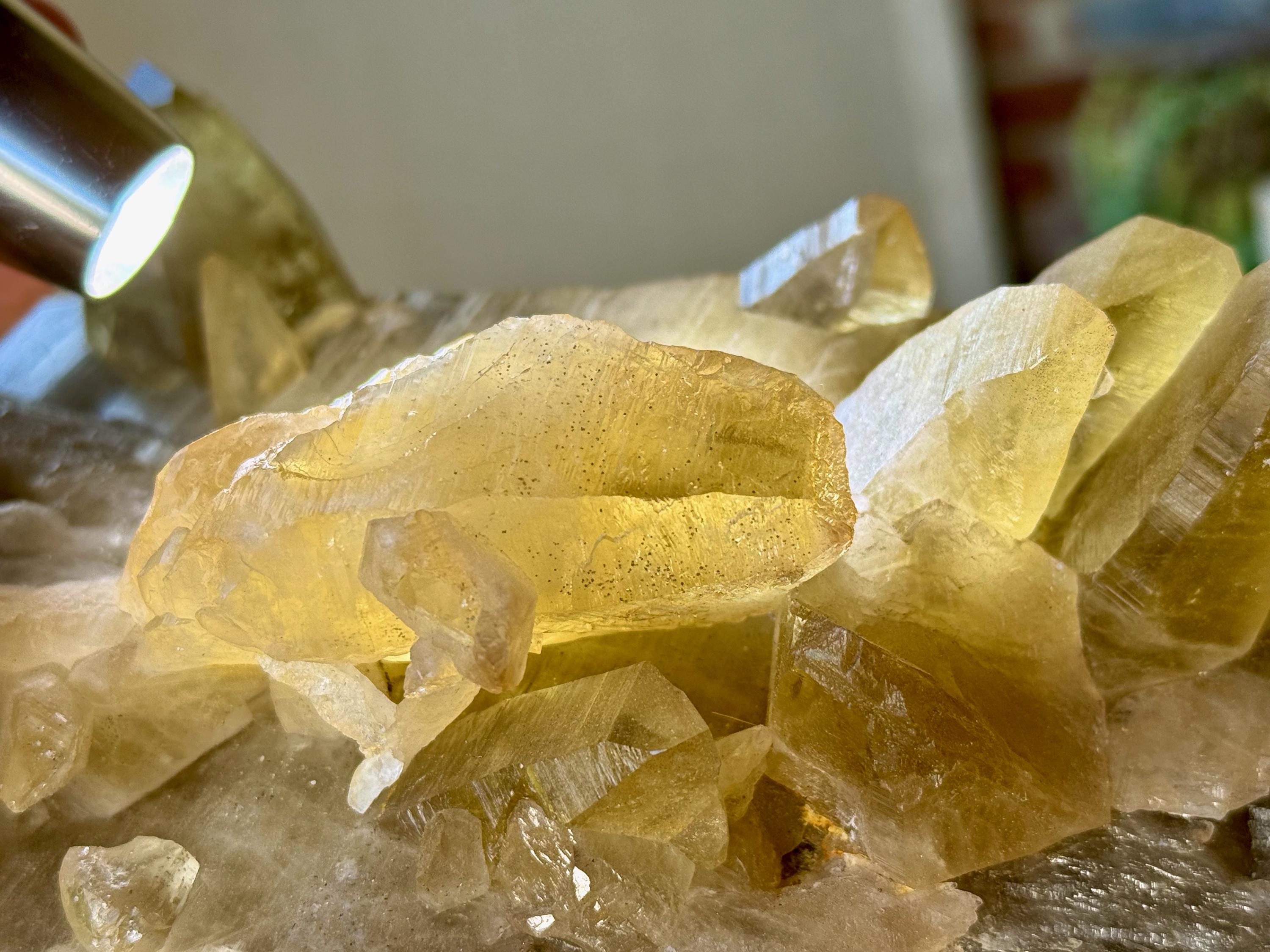 The most beautiful aspect of this crystal is the multiple individual Tessin Citrine points sprouting out from this primary crystal. These vibrantly golden and clear crystals have Lemurian striations and can be seen in Photos 5-9, and we can even see some Record Keepers on one of the main facets! When we backlight these crystals, as we've done in some of these photos, their color and brilliance becomes even more apparent.