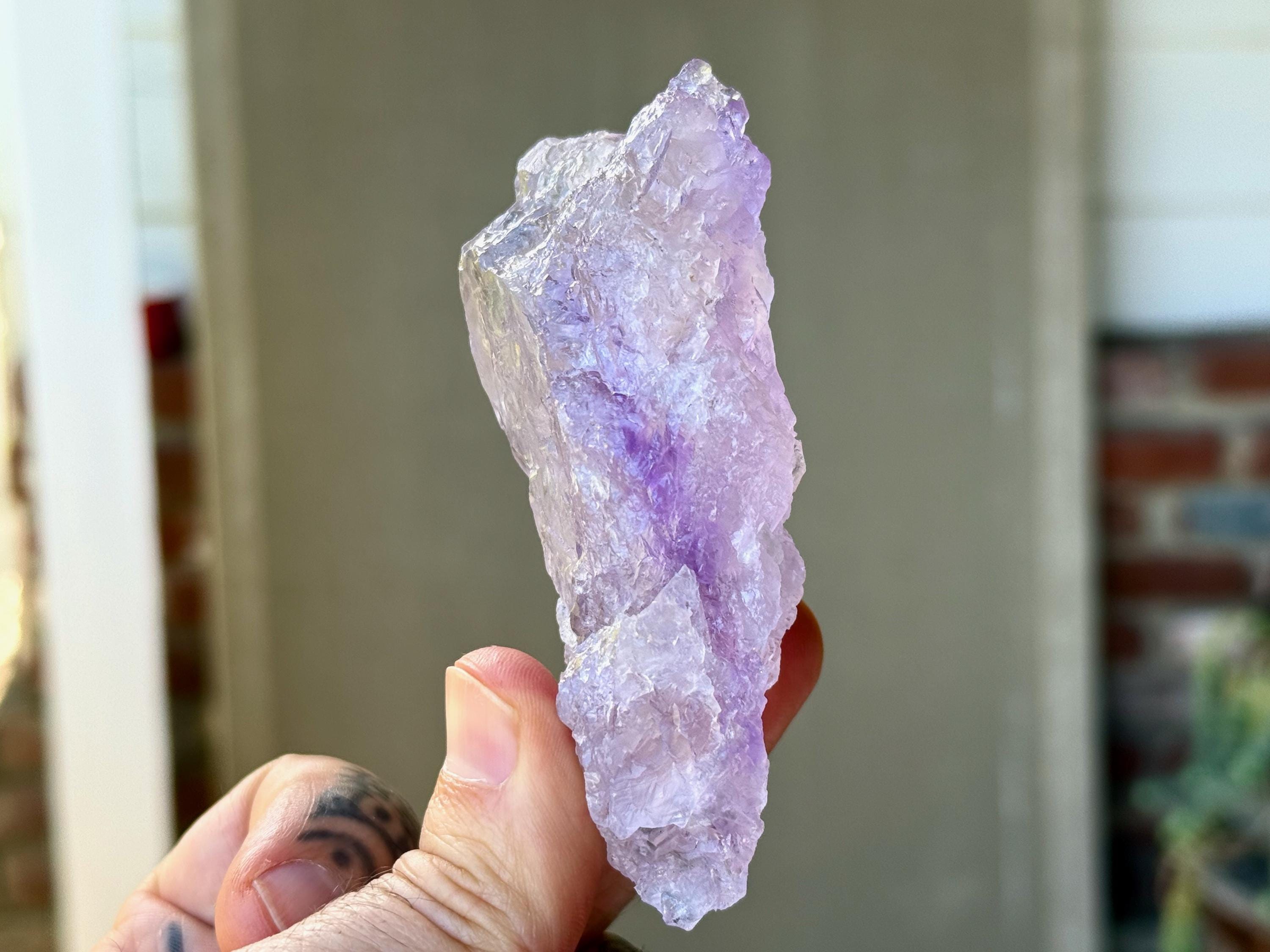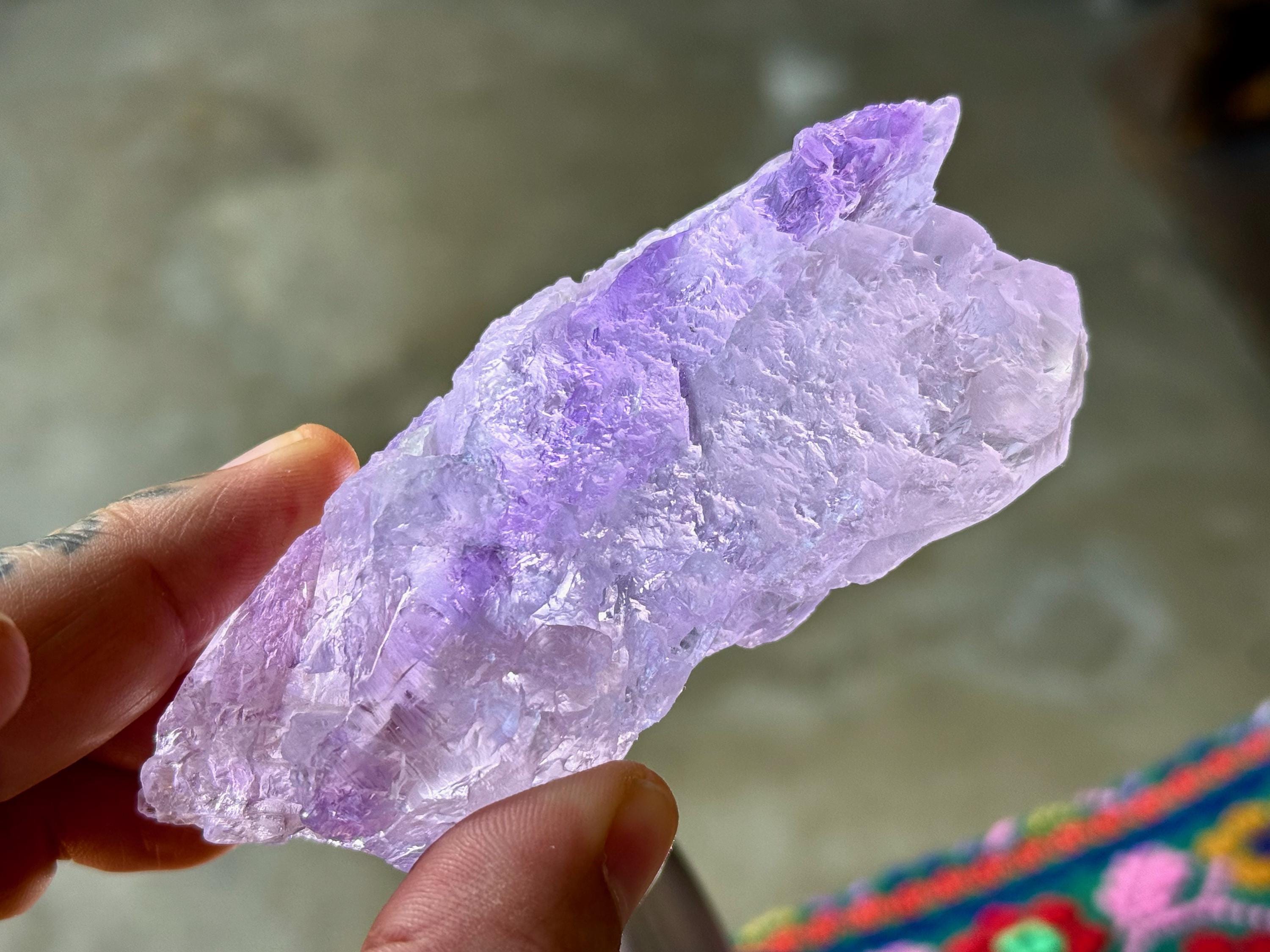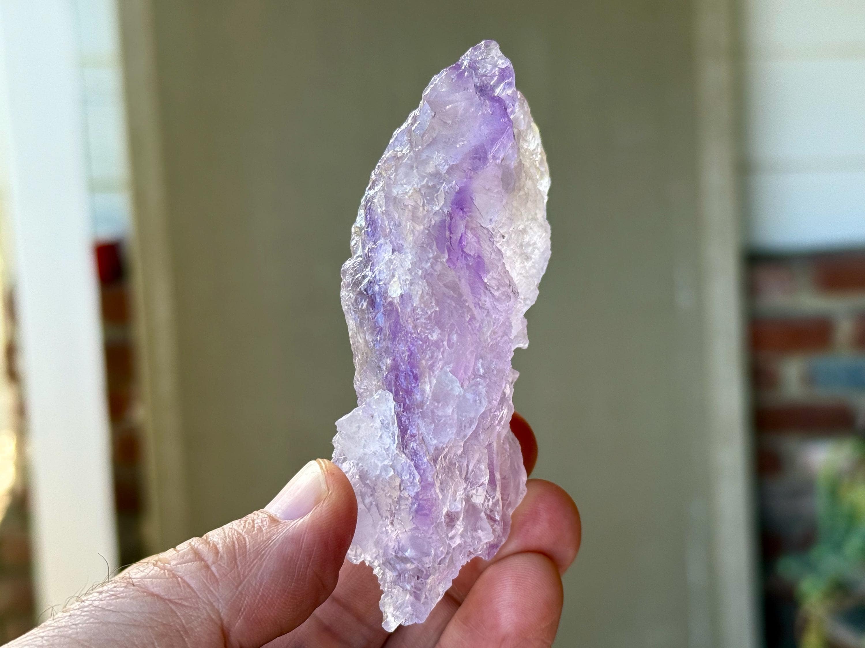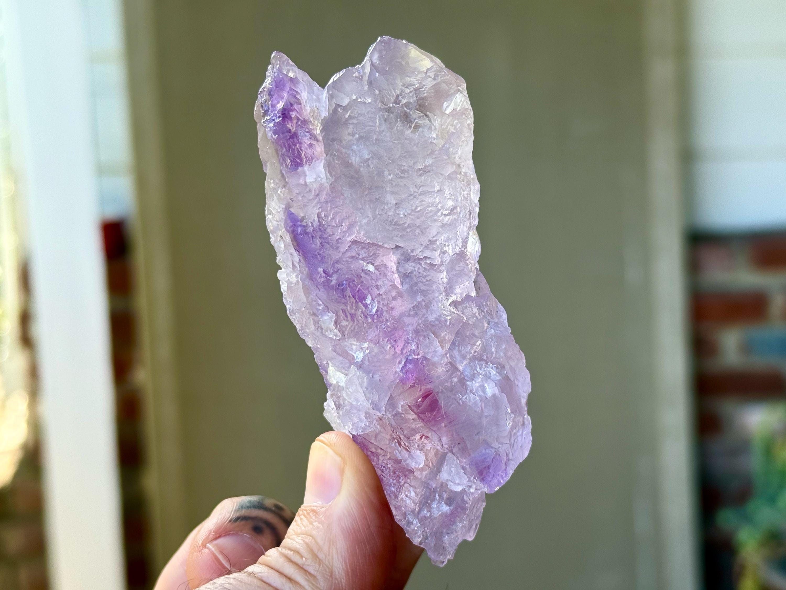 Superb, hydrothermal textures cover every inch of this lovely Dissolution Amethyst crystal with a gentle lilac hue and a darker purple stripe down the center. When backlit, this crystal truly lights up brilliantly (Photos 3-5).
