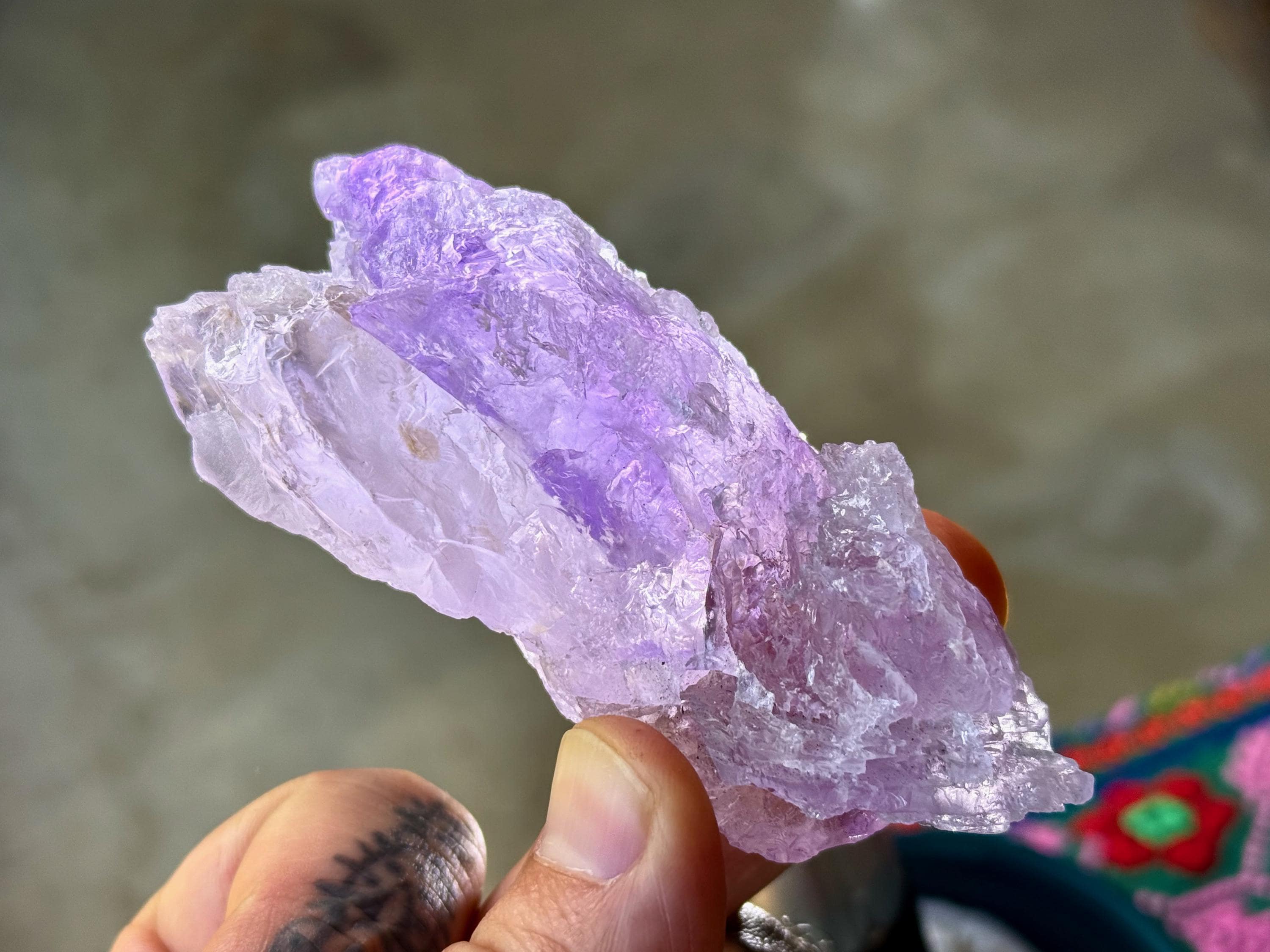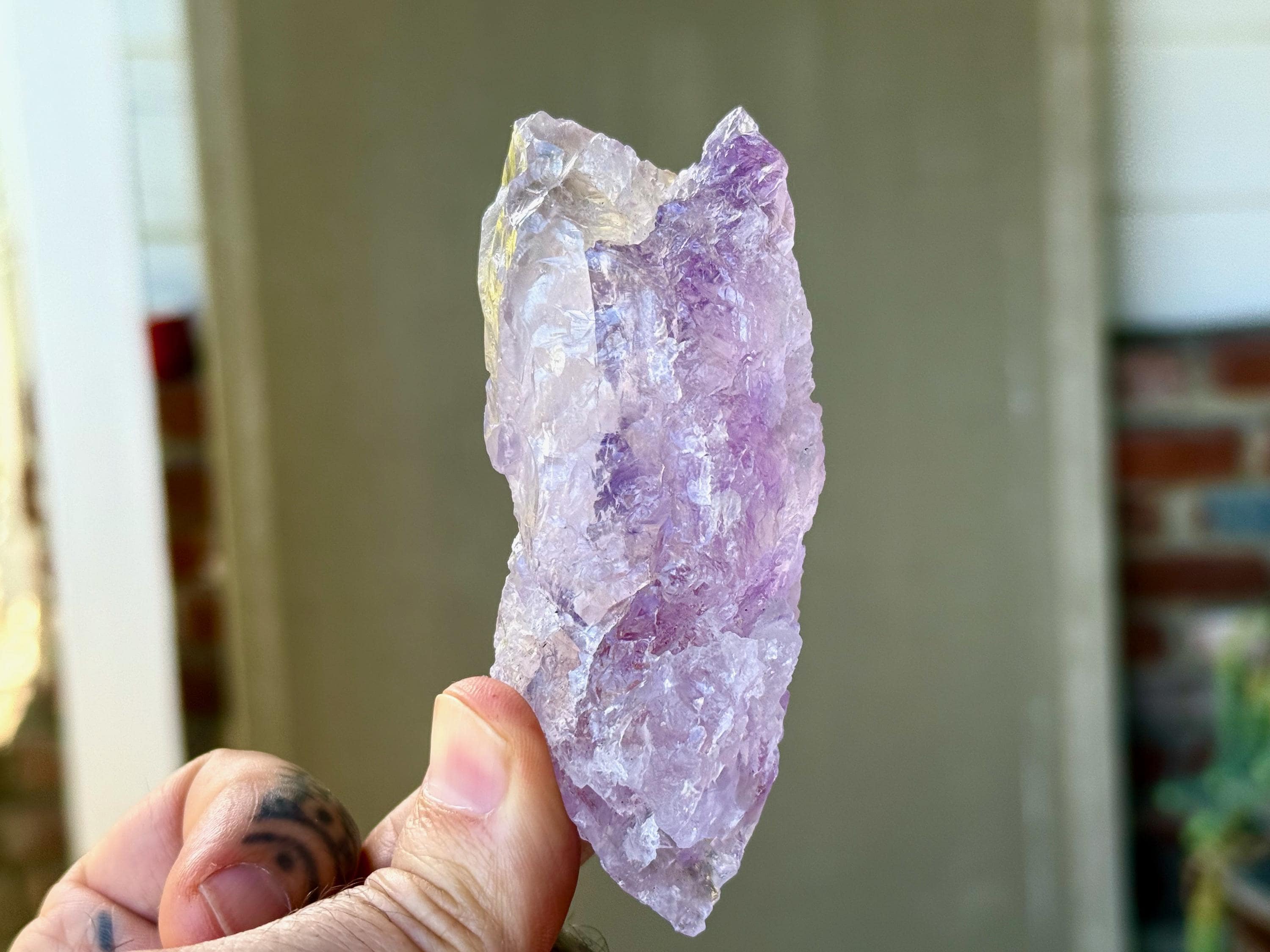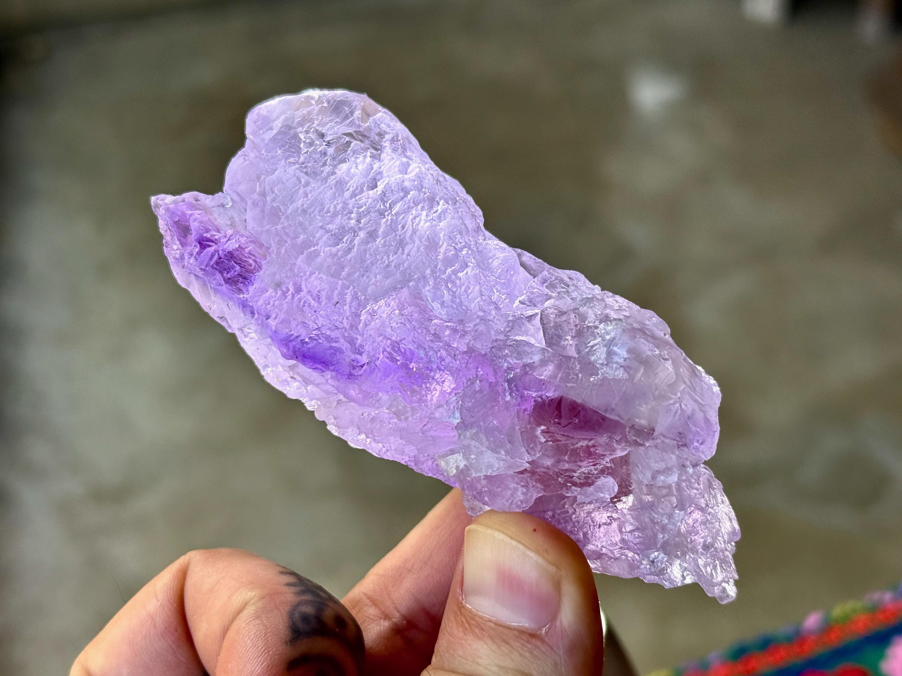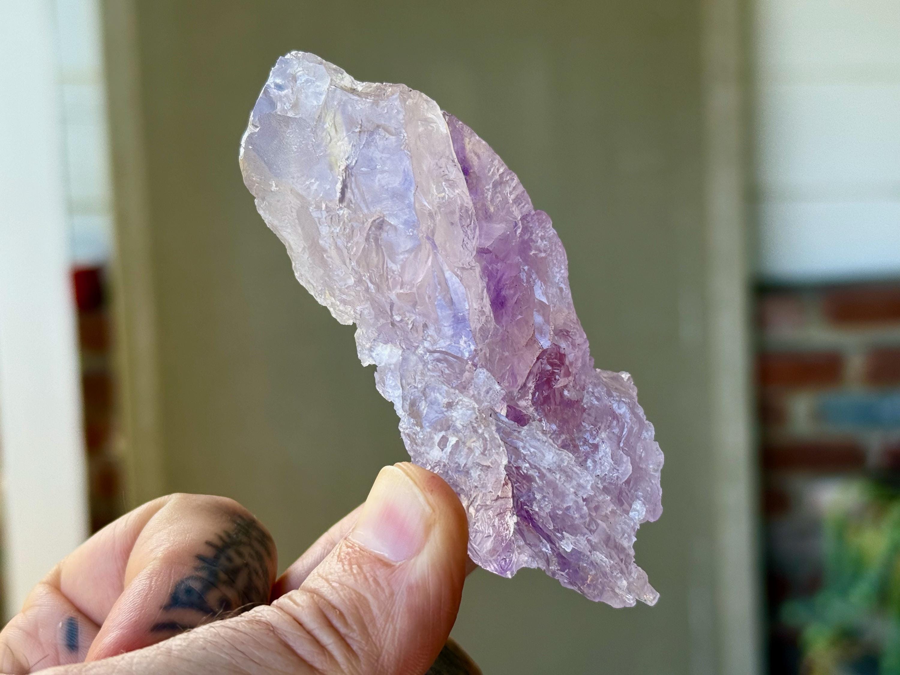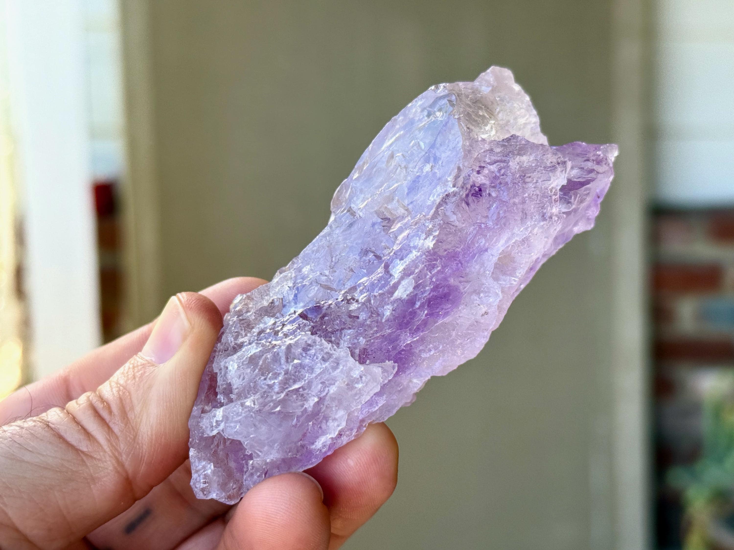 Superb, hydrothermal textures cover every inch of this lovely Dissolution Amethyst crystal with a gentle lilac hue and a darker purple stripe down the center. When backlit, this crystal truly lights up brilliantly (Photos 3-5).