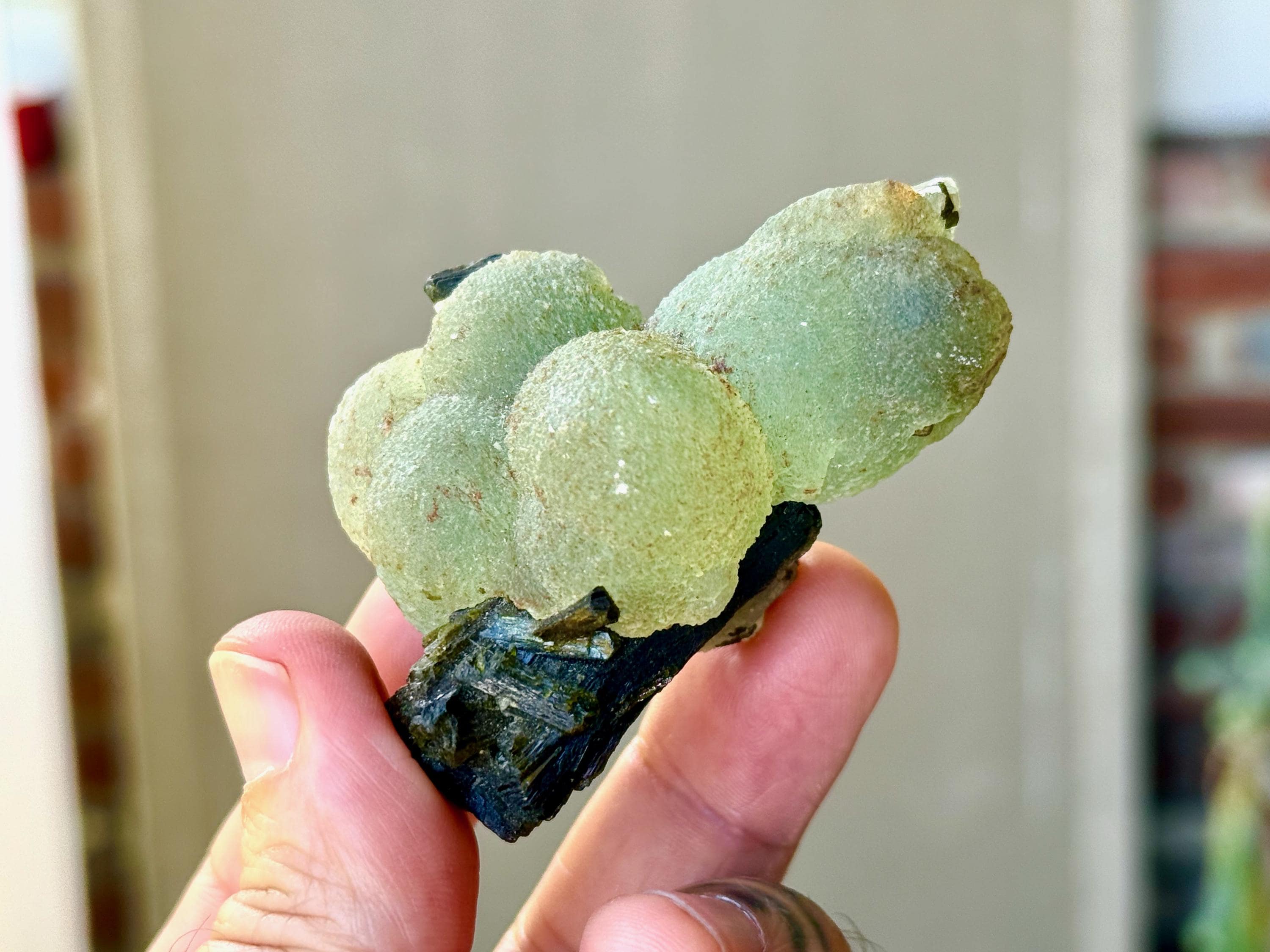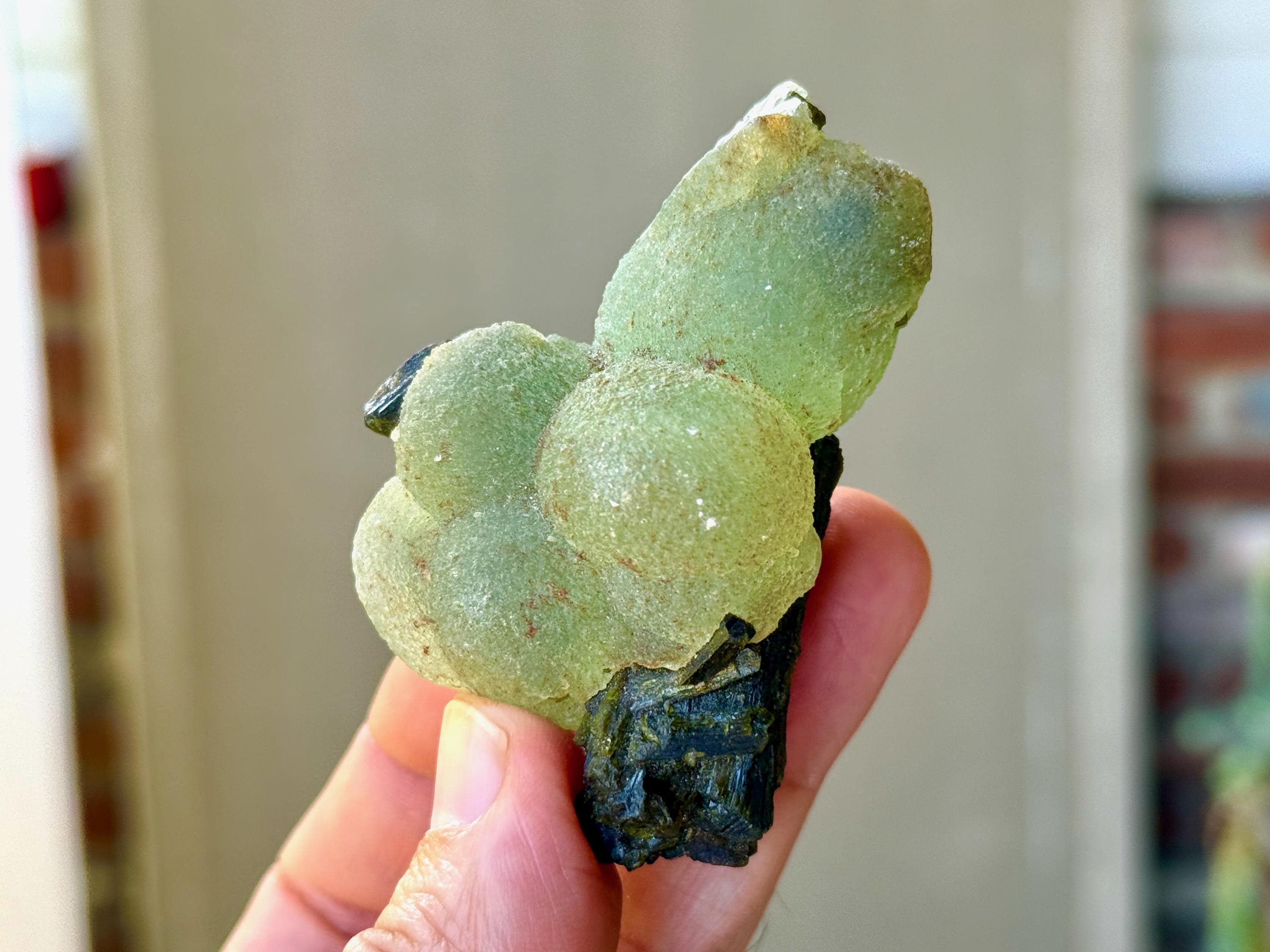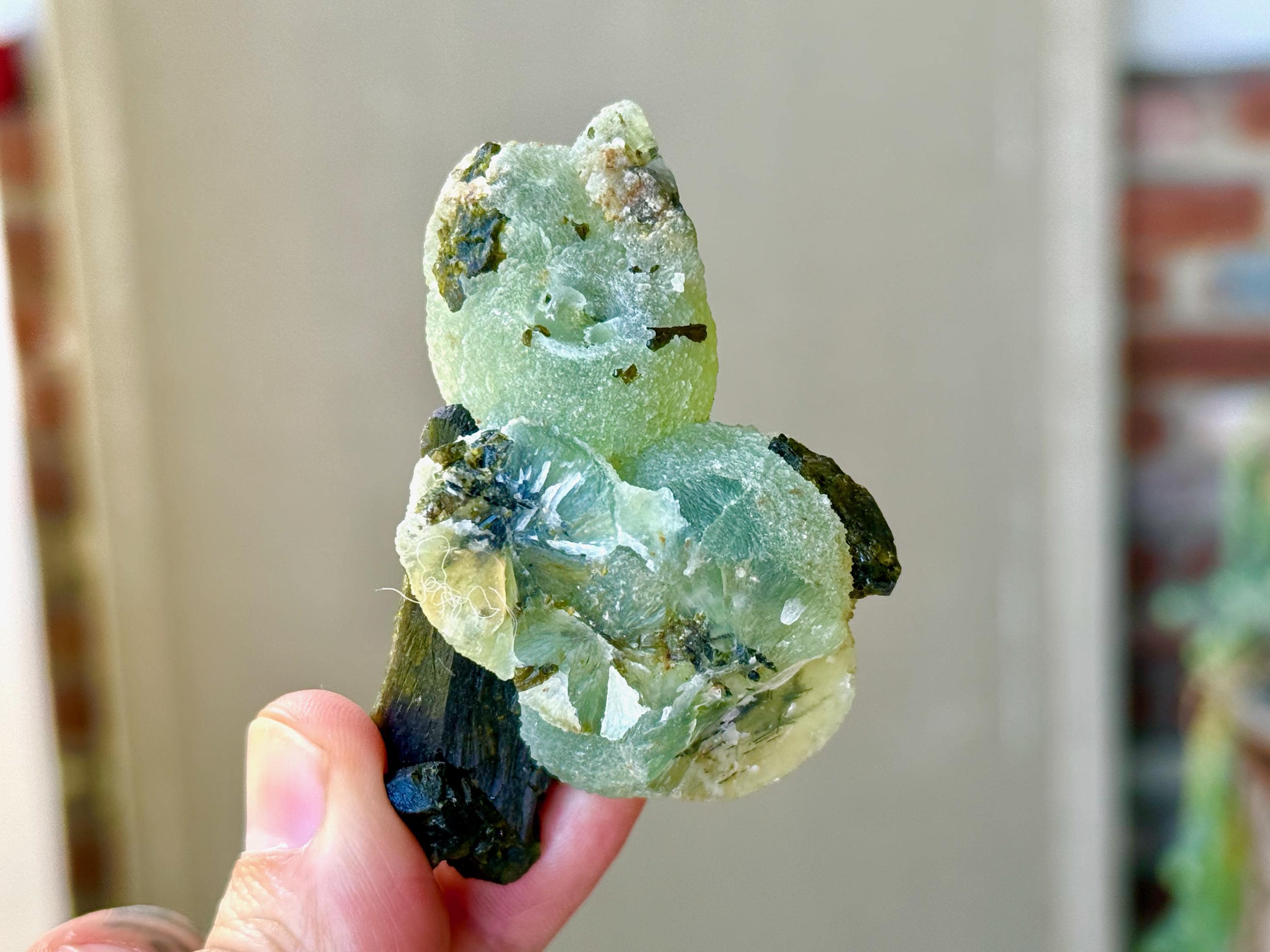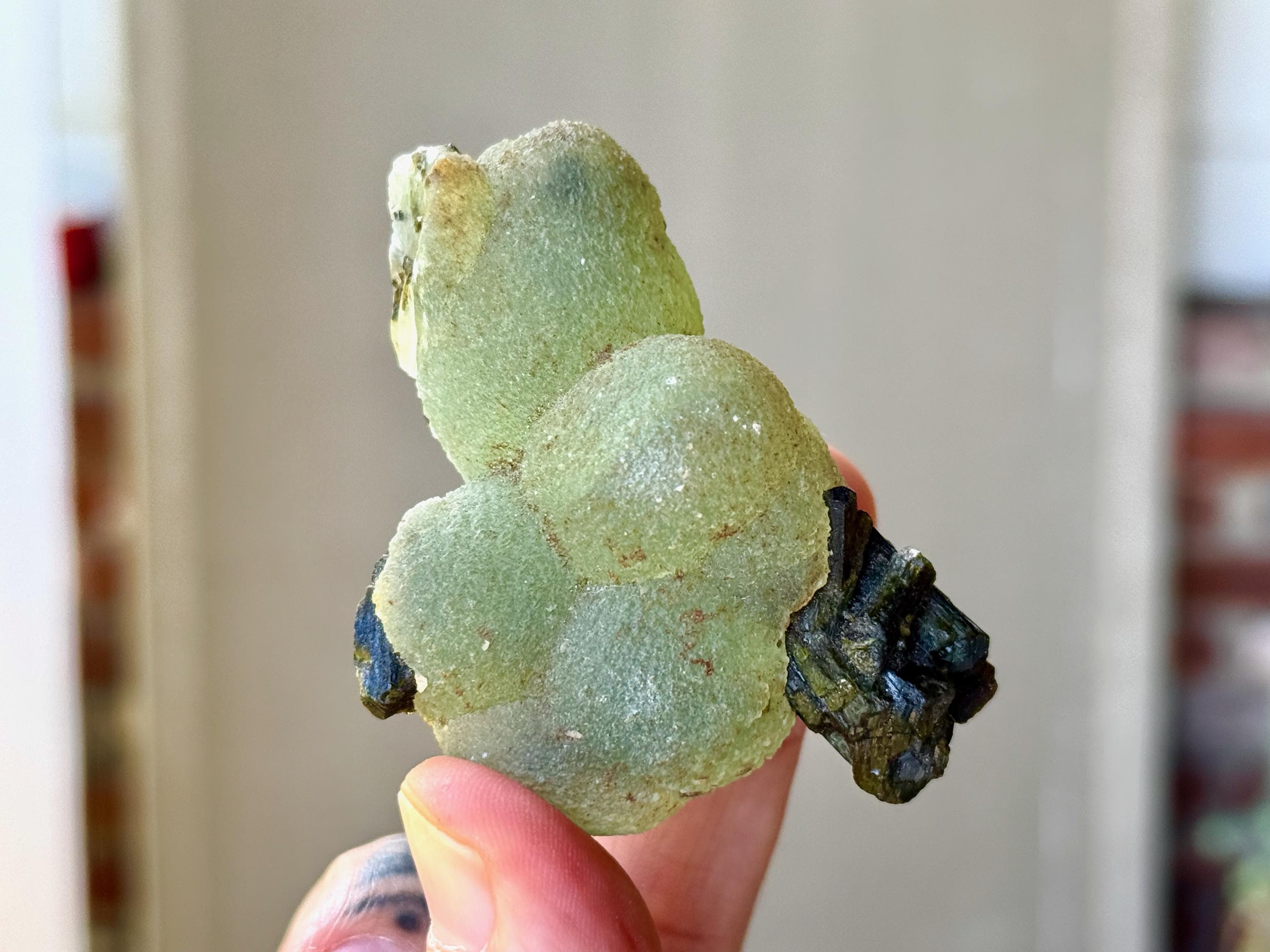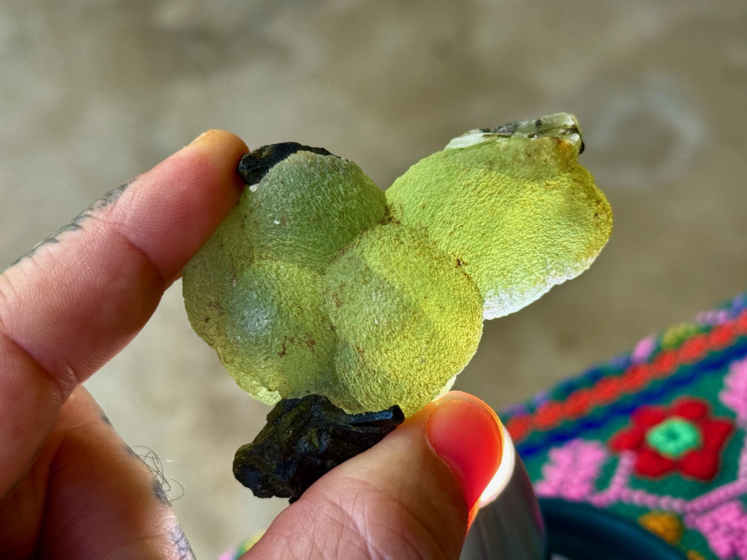 This is a vibrantly colored Prehnite with a beautiful botryoidal formation, like a green cloud! There is a large inclusion of dark Green Epidote embedded within. What is great about this piece is that for as large and thick as it is, it still passes light very well when backlit (Photos 1, 3-5). It also kind of has a natural "bottom" to it so it will sit nicely for display. Gorgeous piece!