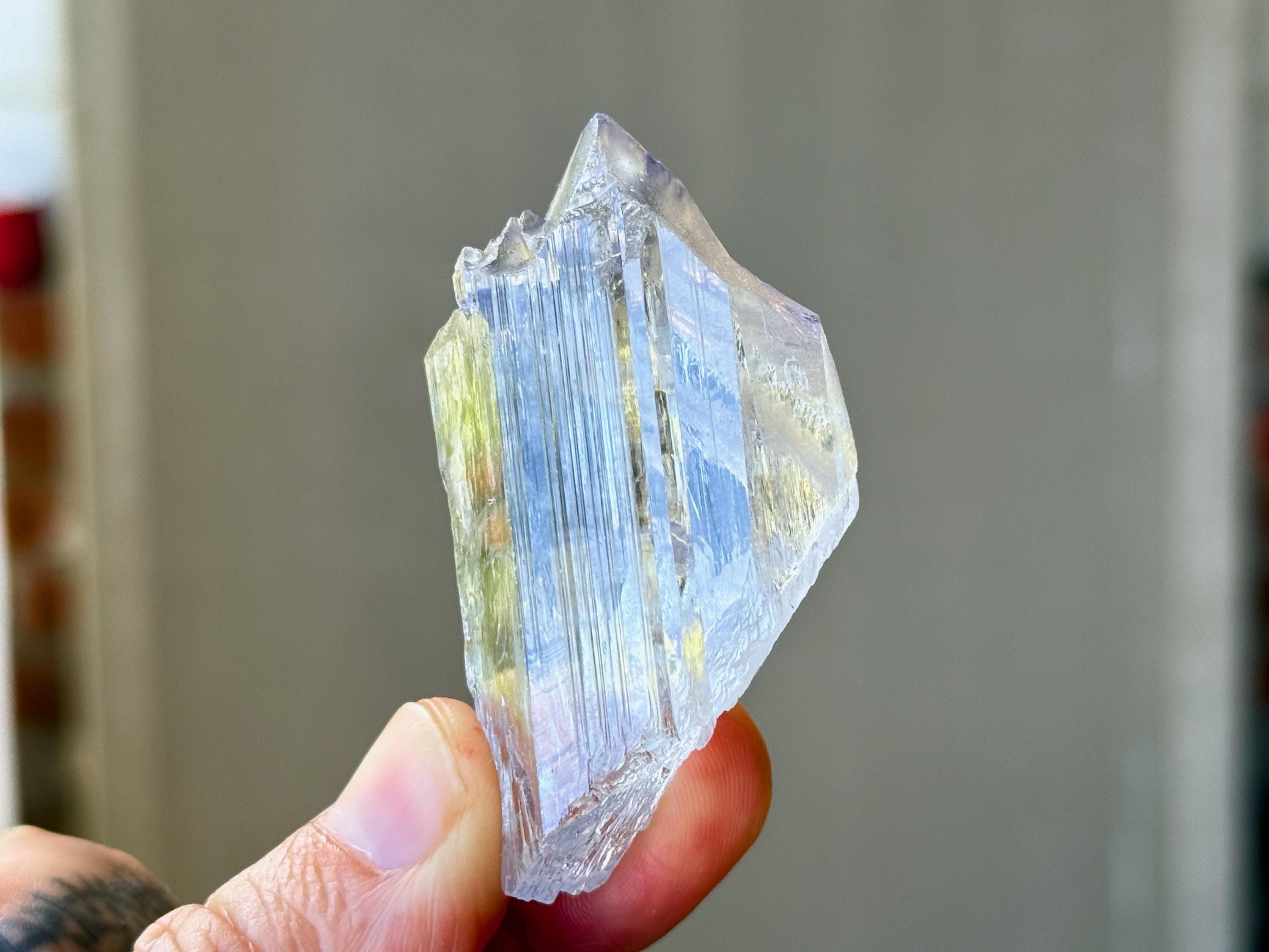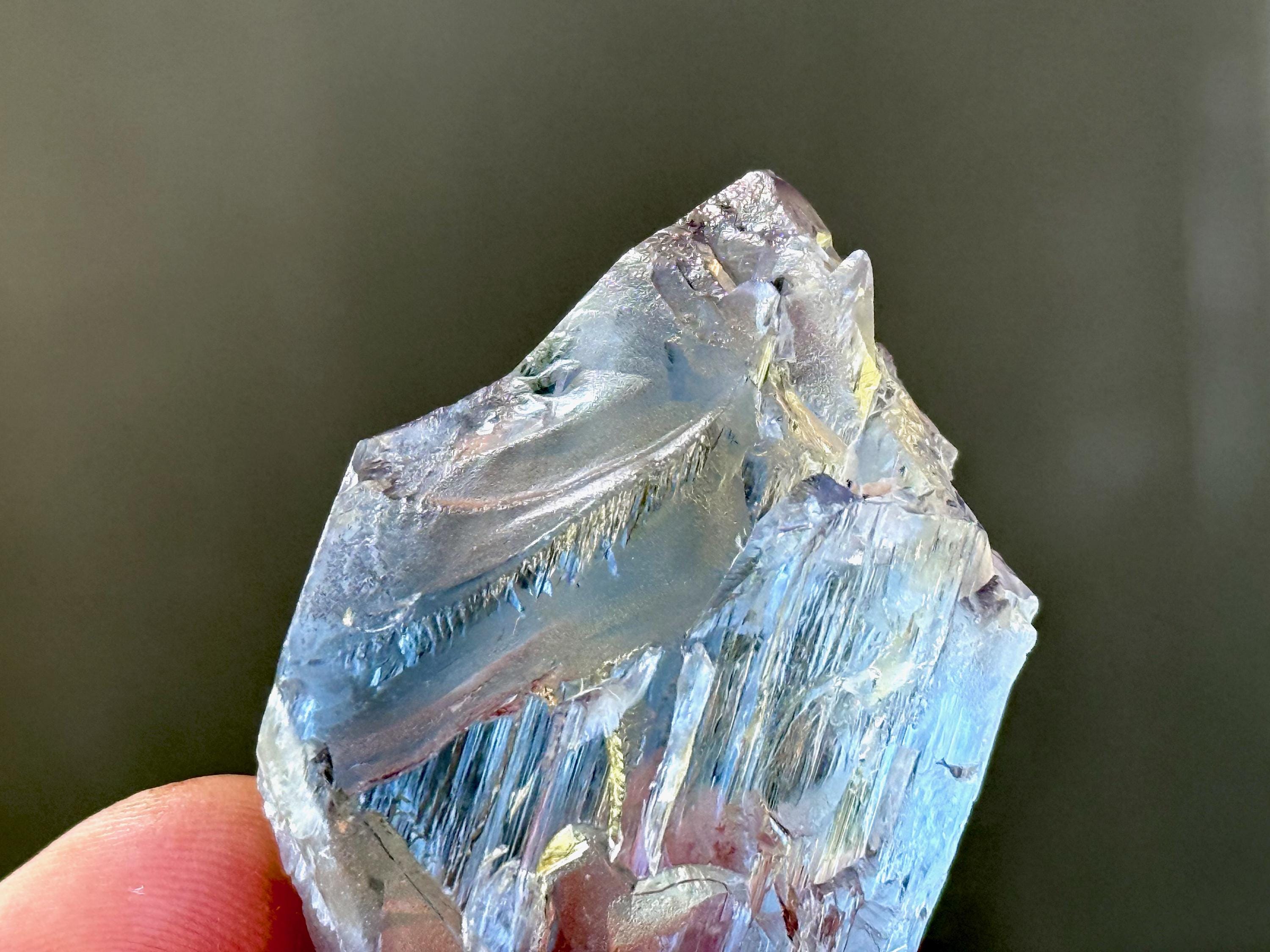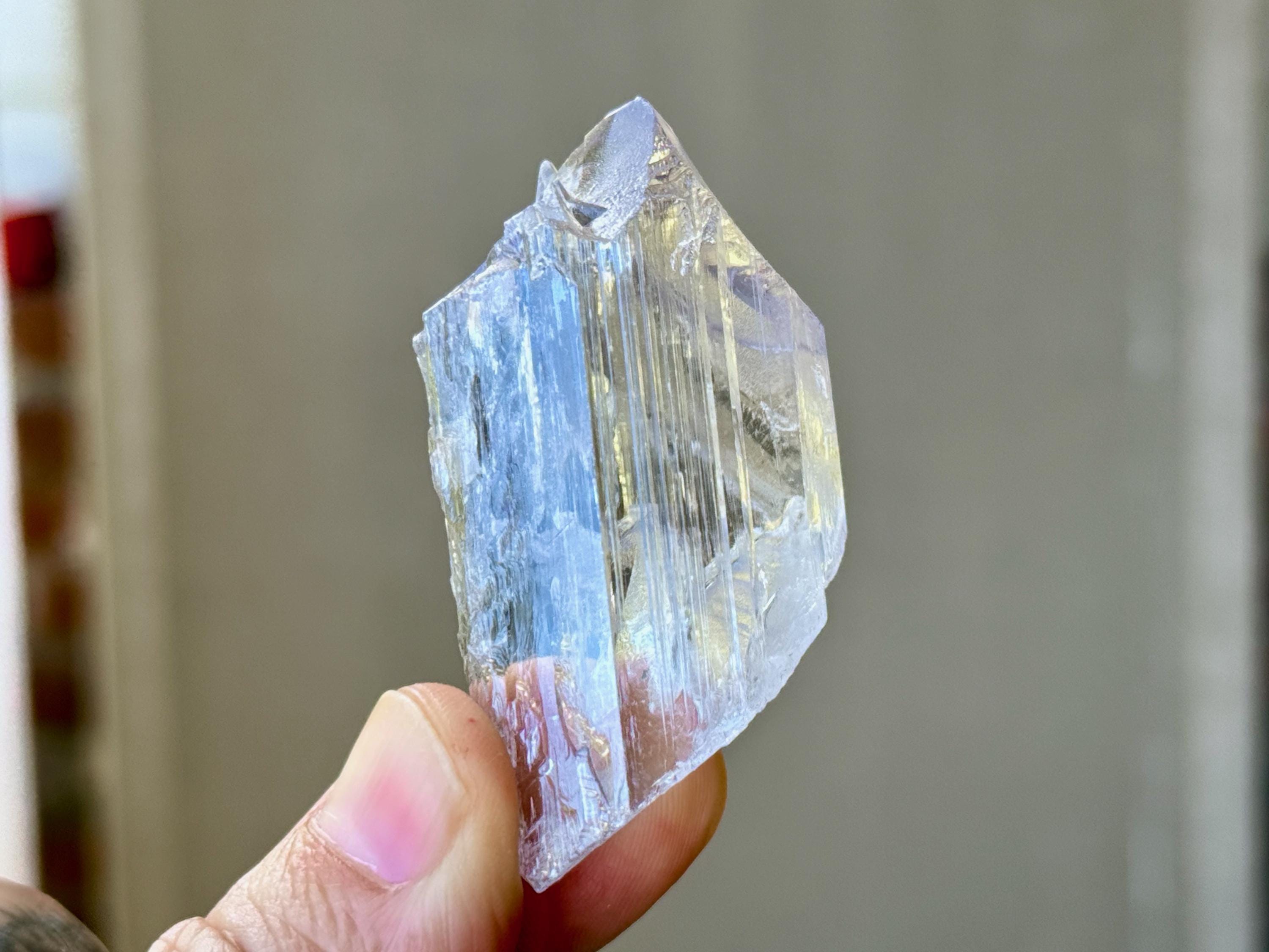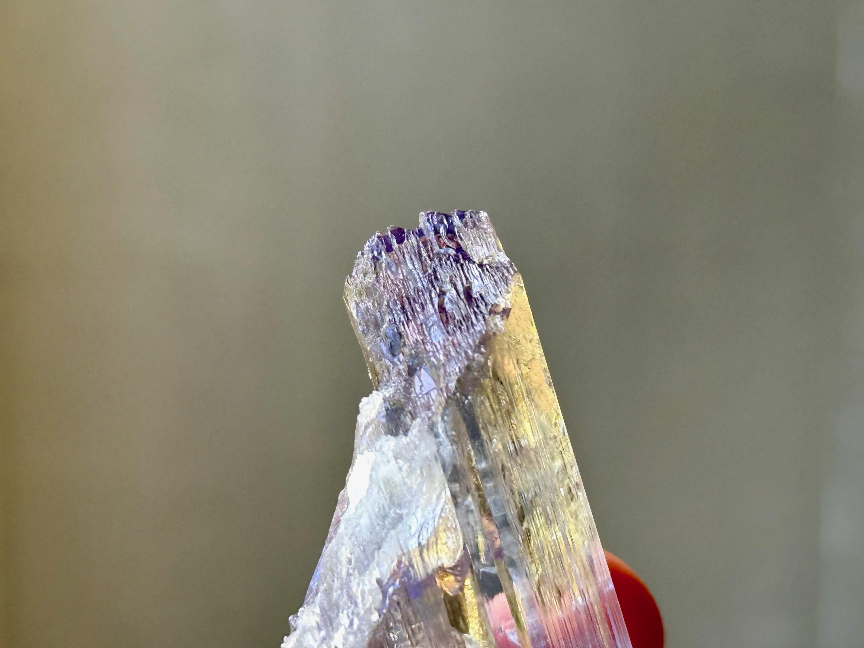This is an exceptional, glassy and water-clear Kunzite crystal that is almost colorless aside from a very subtle tinge of pale purple hue. The color will change a bit in as you tilt the angle, and we can see the darker purple color when we view the bottom termination (Photo 6).