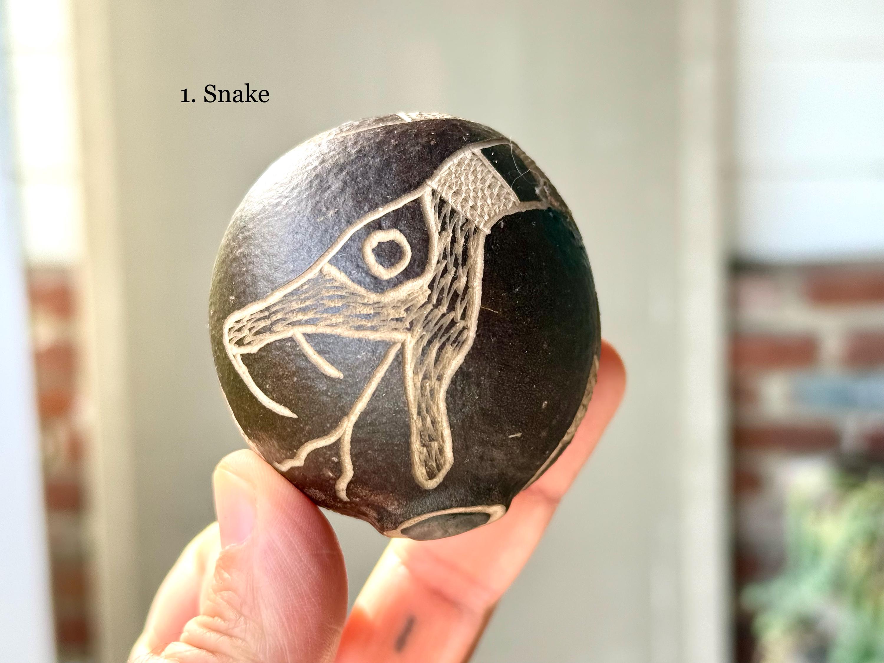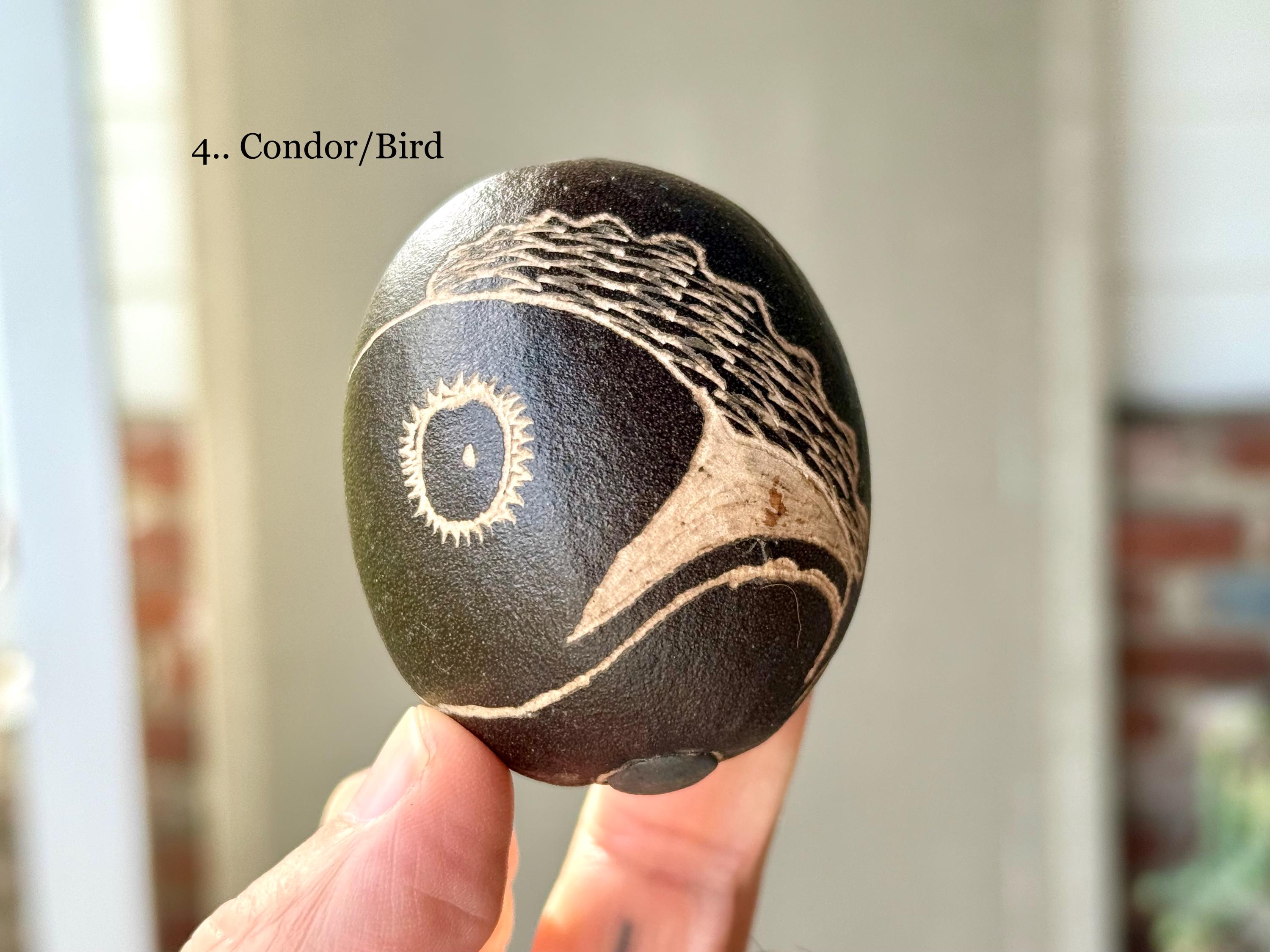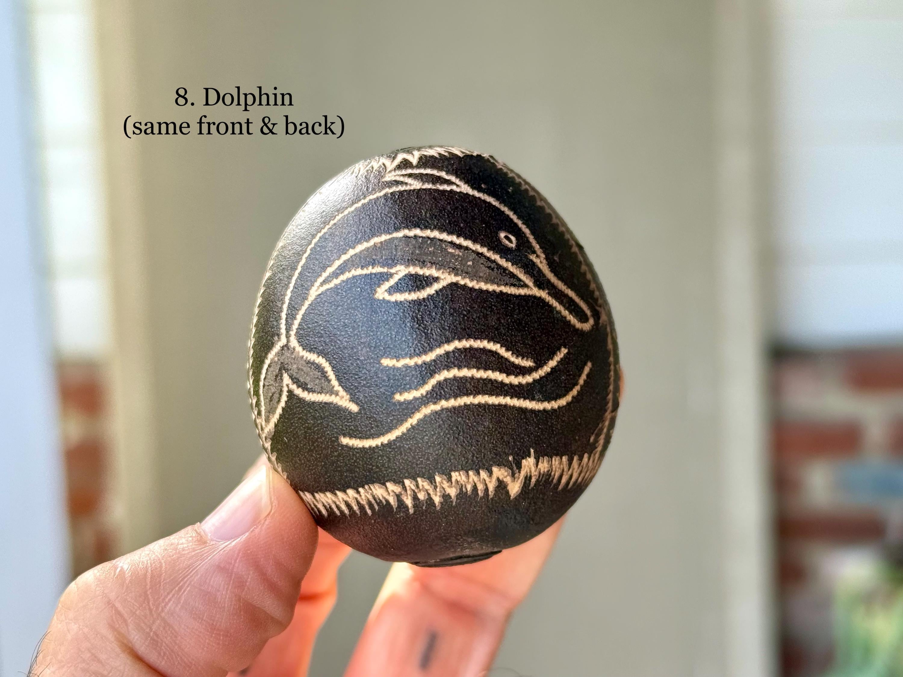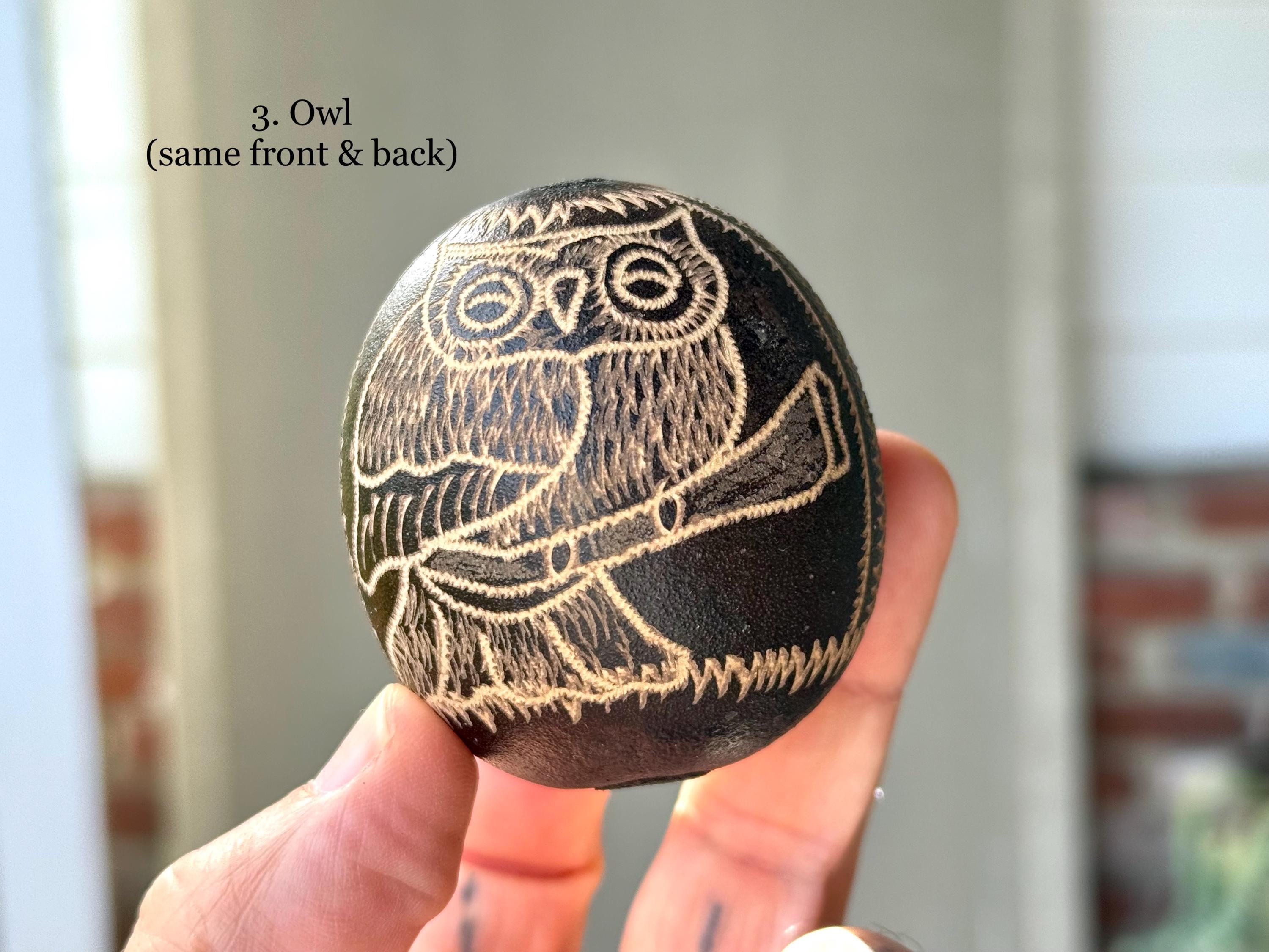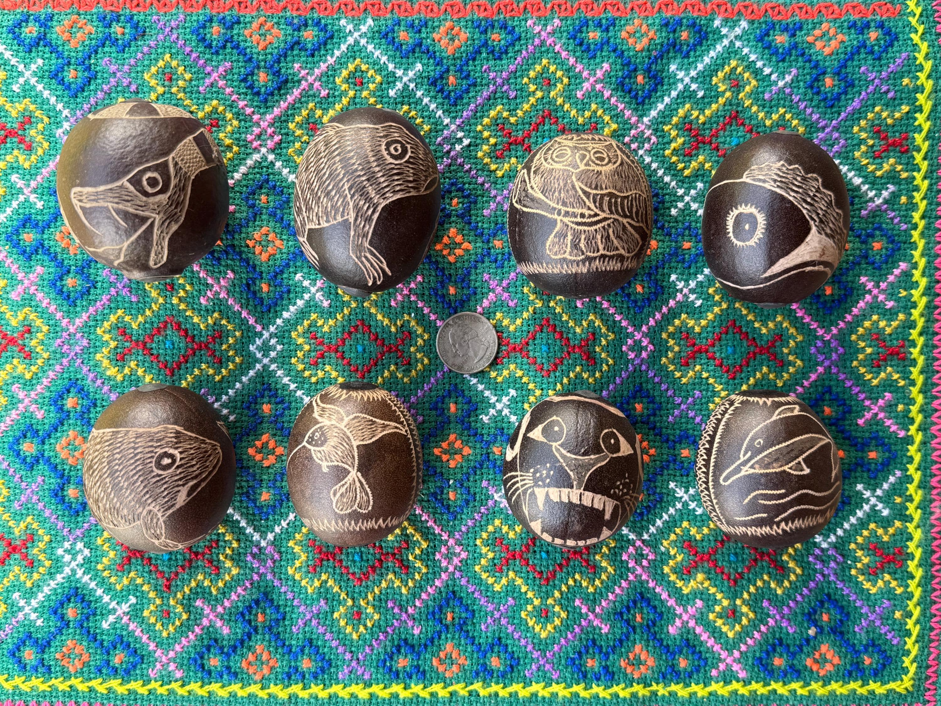 These adorable rattles/egg shakers were handcrafted from natural gourds collected from the rainforest floor. They are filled with seeds and/or beads and hand etched in a variety of designs. The sound is gentle, quiet and pleasant — more bassy and muted than the traditional plastic egg shakers found in music shops. They are ideal for accompanying quiet music and singing in or out of ceremony.