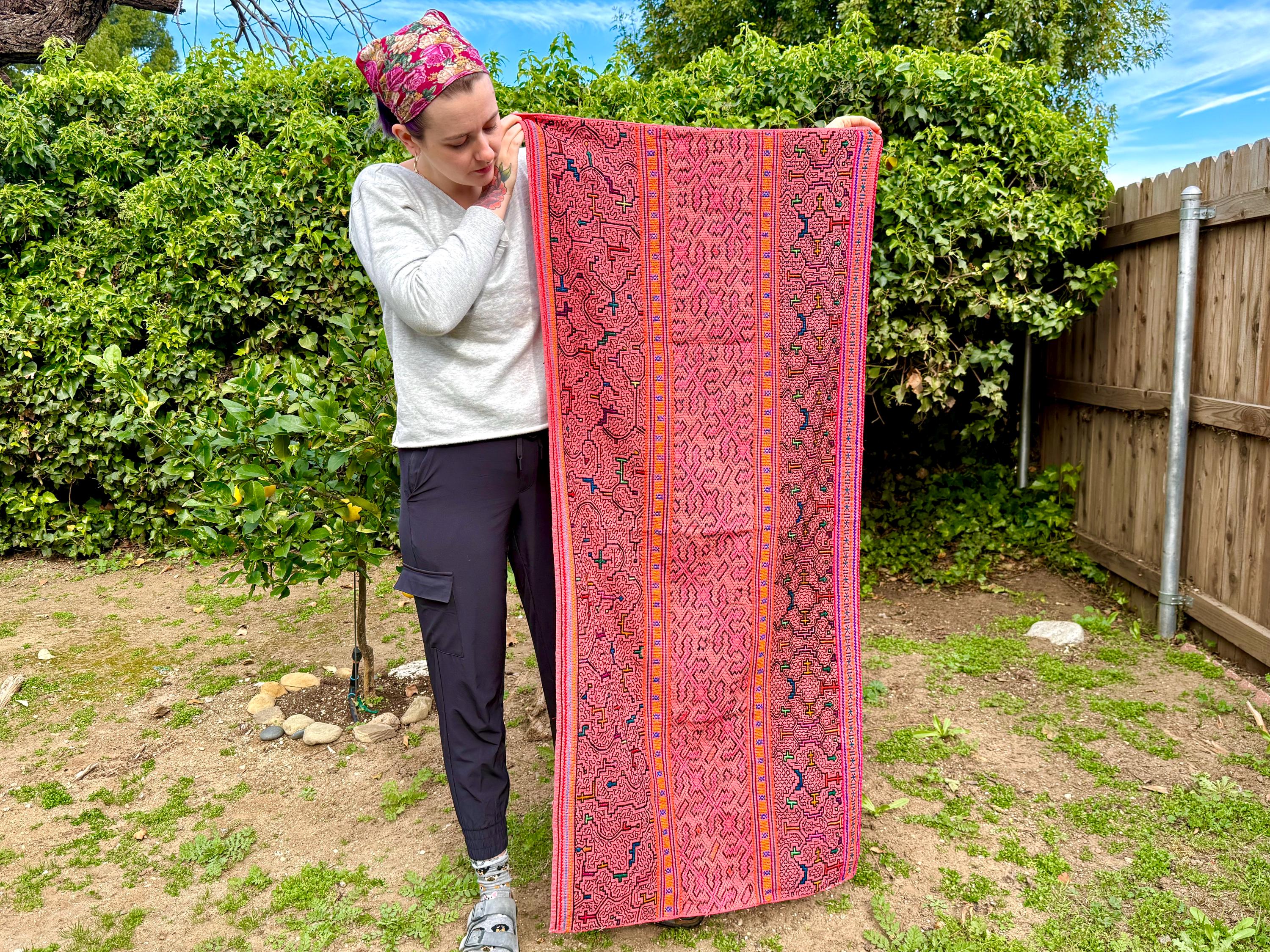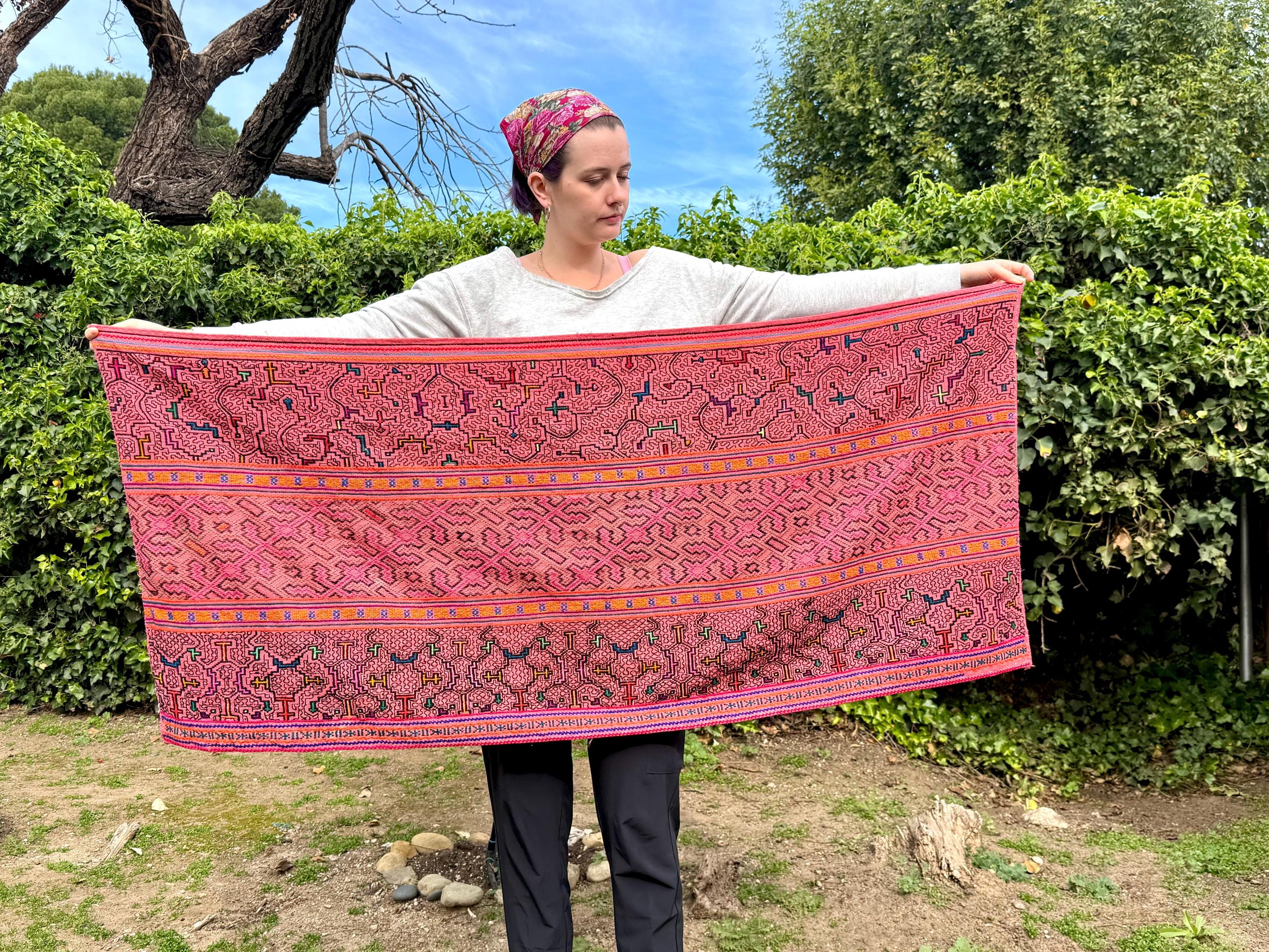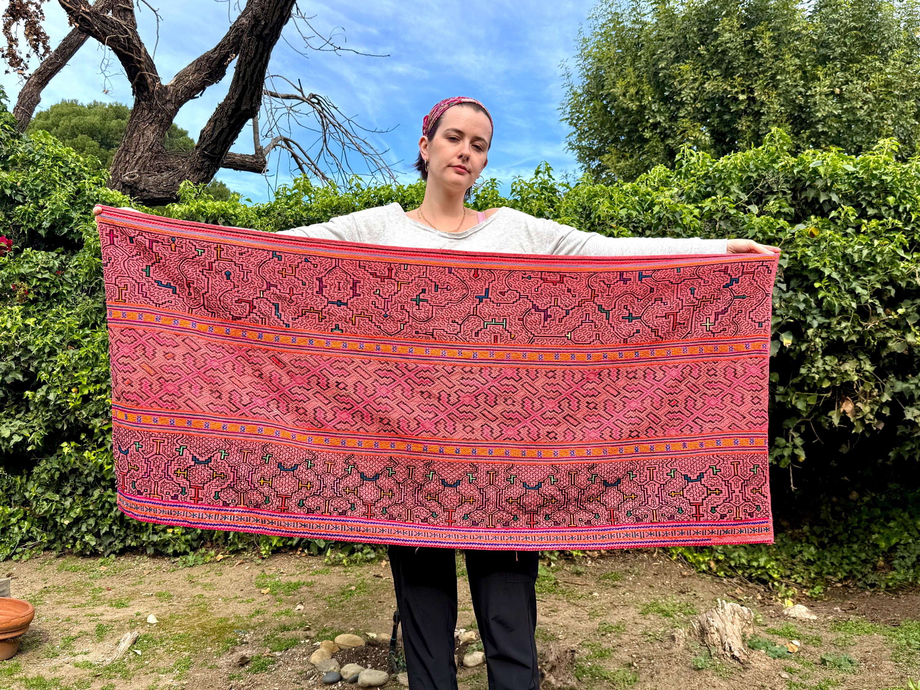 This is one of the largest manta cloths we currently have available, spanning right around 5 feet long! It is a classic Shipibo kene pattern that is beautifully done!