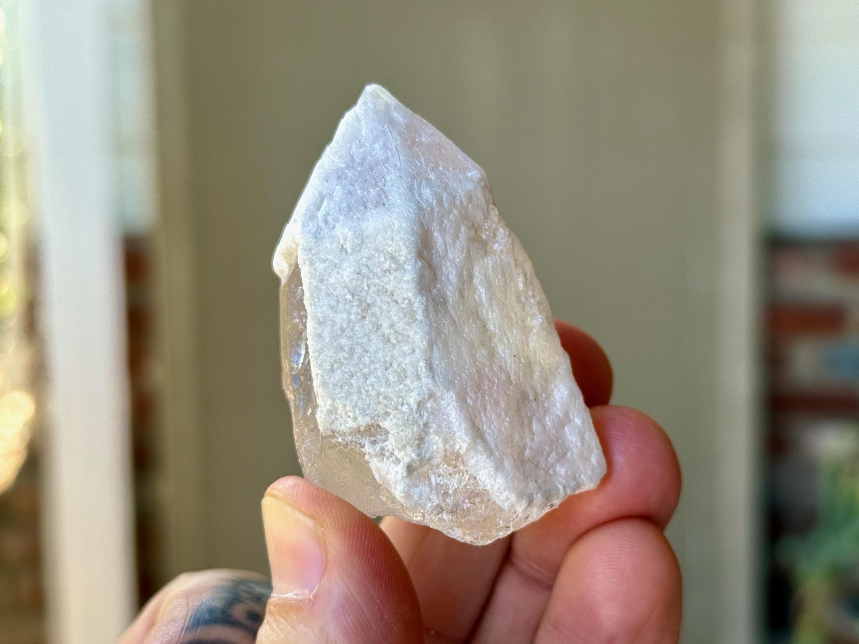 A frosty, snow covered Lemurian with icy luster! This crystal is enrobed in white frost over its main facet area and most of its body. In the one area that is not frosted, we can see portions of the lustrous, mildly pink and water clear quartz peeking out from beneath. Excellent termination as well.