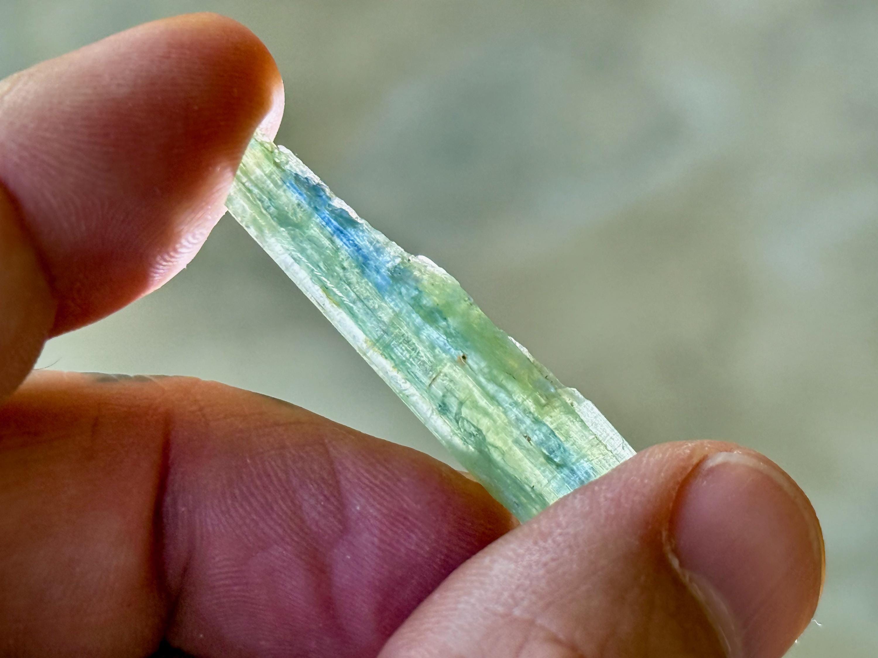 A very nice collection of these old find Green Kyanite crystals with vibrant green hues. This is a great lot, as some of these pieces reveal blue "stripes" down the center when backlit (see Photos 4-8).