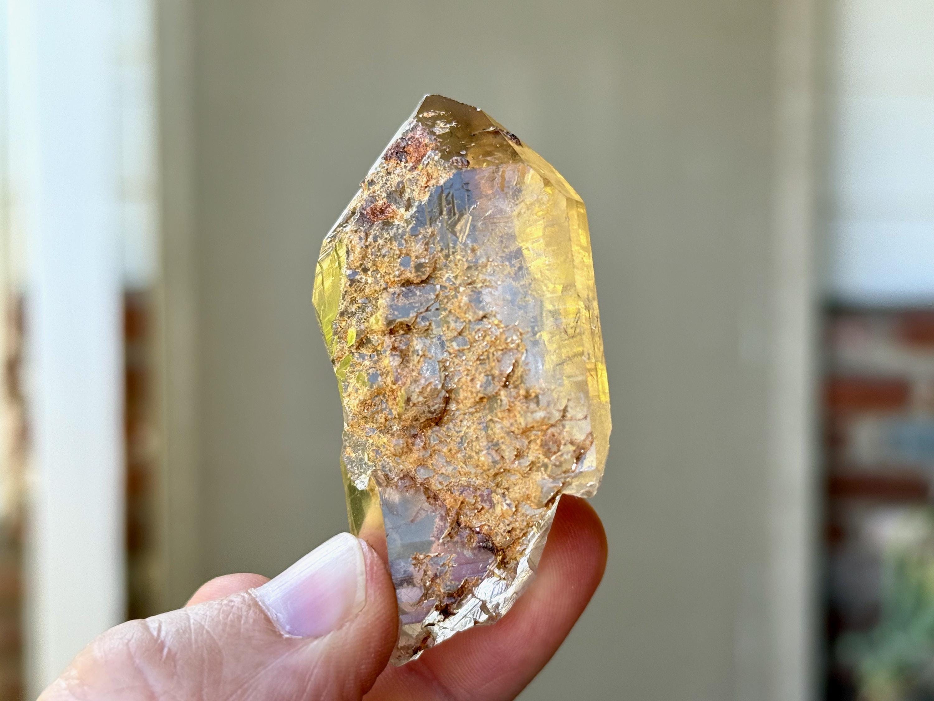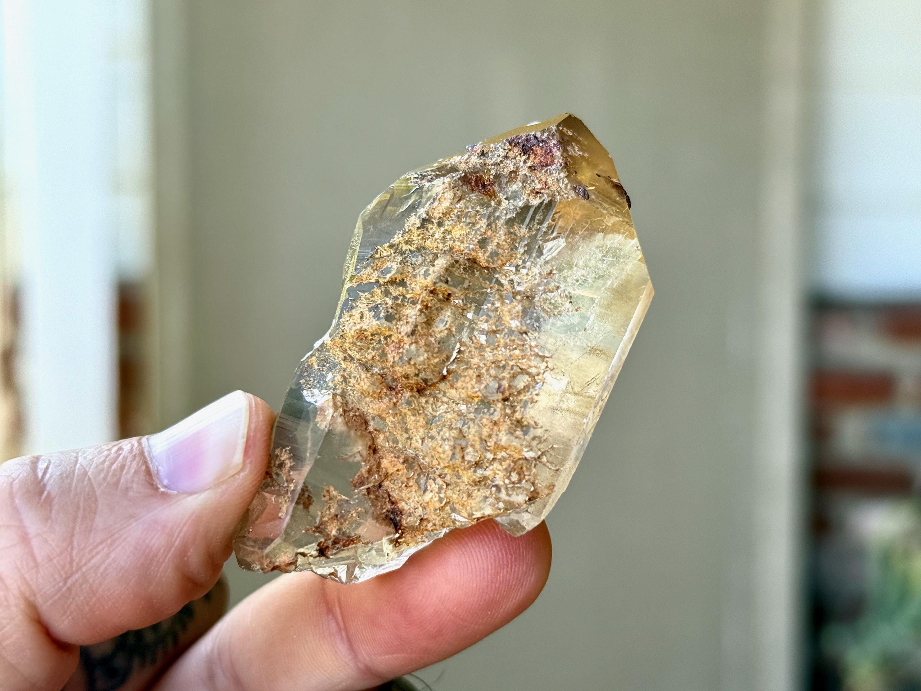 Outstanding quality to this water-clear Citrine Quartz crystal with a rich golden color and superb luster. This crystal possesses broad sides, and embedded into one of them are sandy Lodolite inclusions.