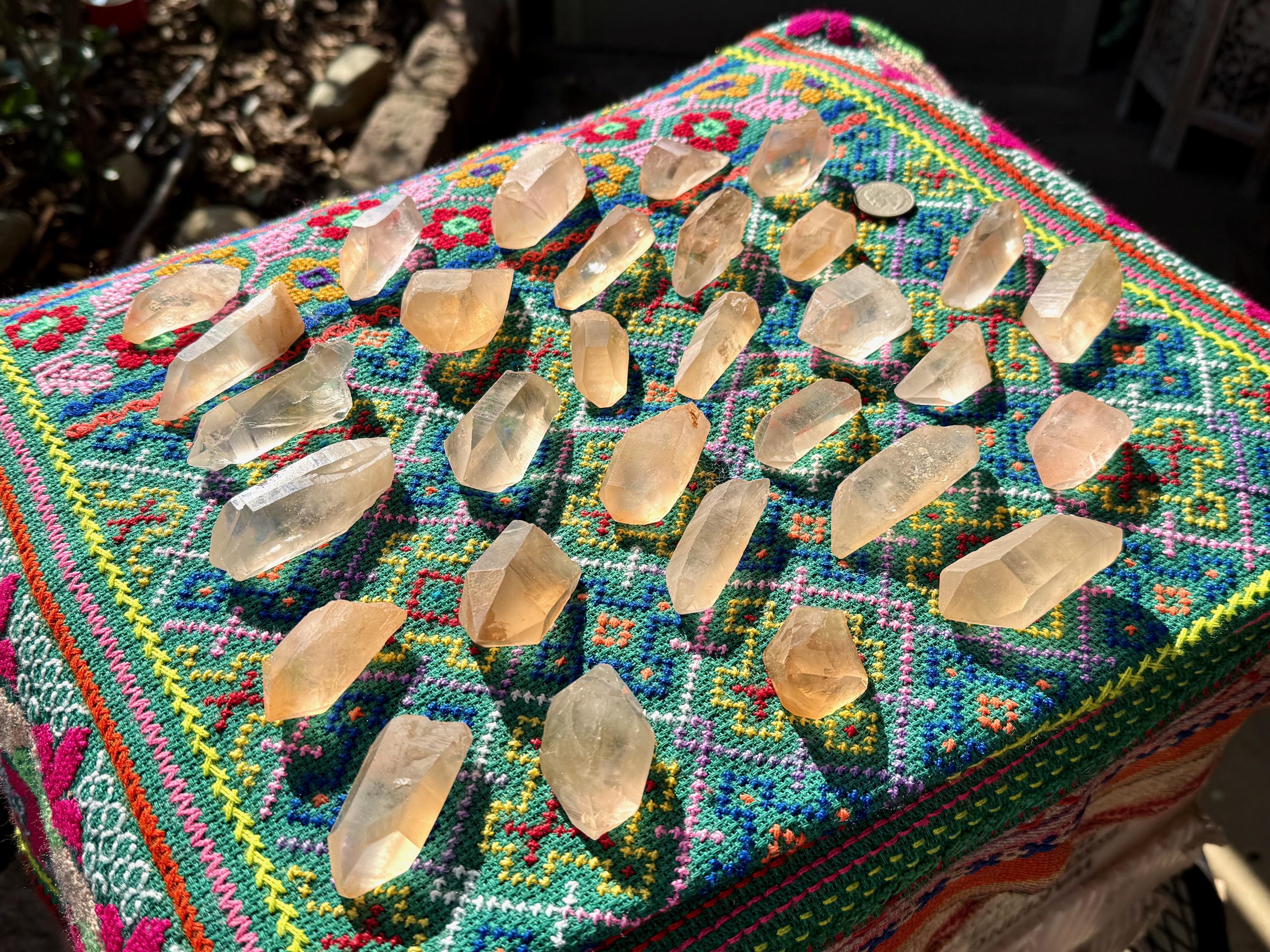 These vibrant Tangerine Lemurian Quartz crystals possess wonderful clarity and a variety of hues, with some being deeply saturated with orange and tangerine color, and others being mildly tinged with these hues. Many (though not all) possess Lemurian striations on their sides. A variety of formations are included here, including several Double Terminated crystals.
