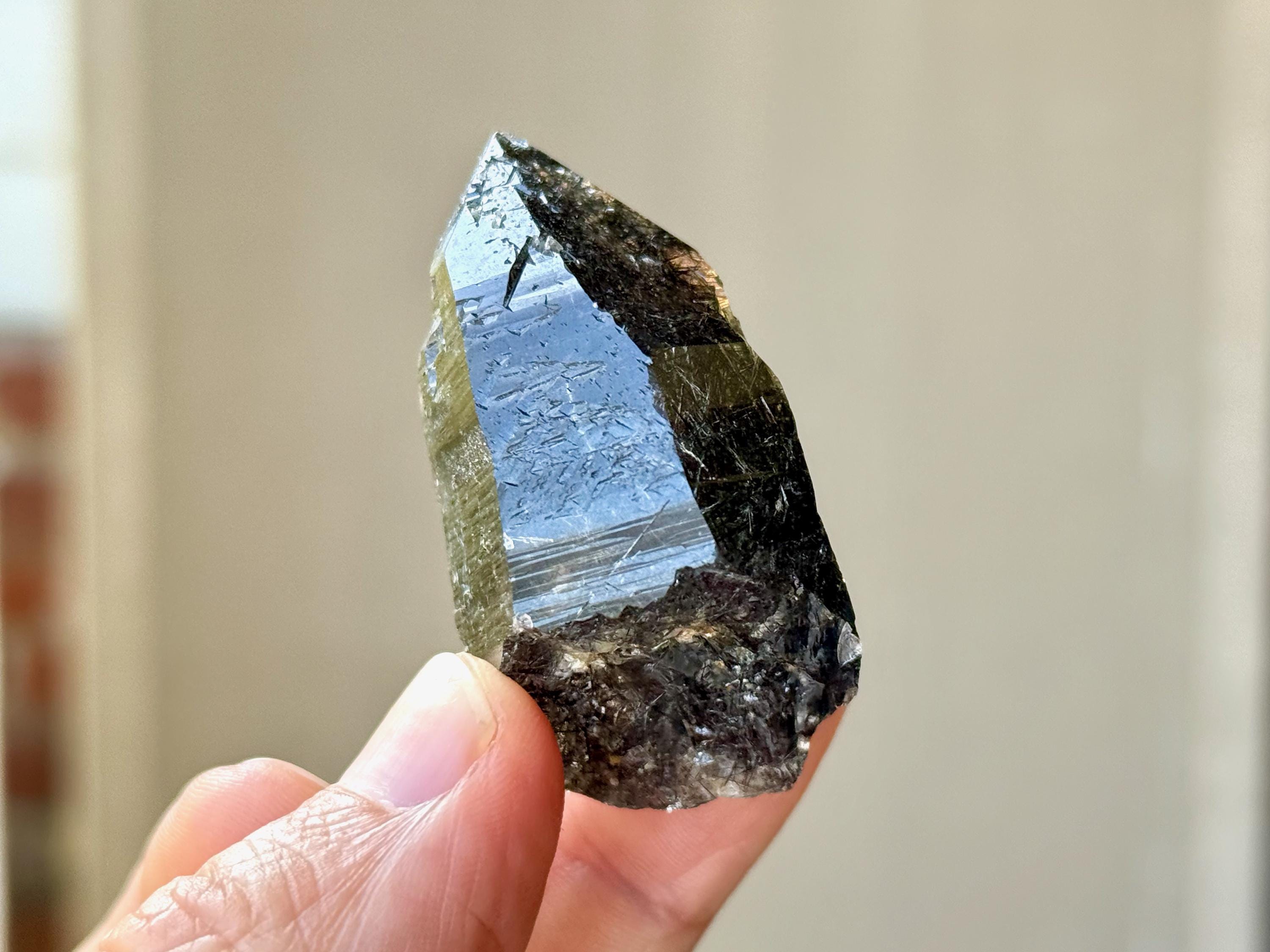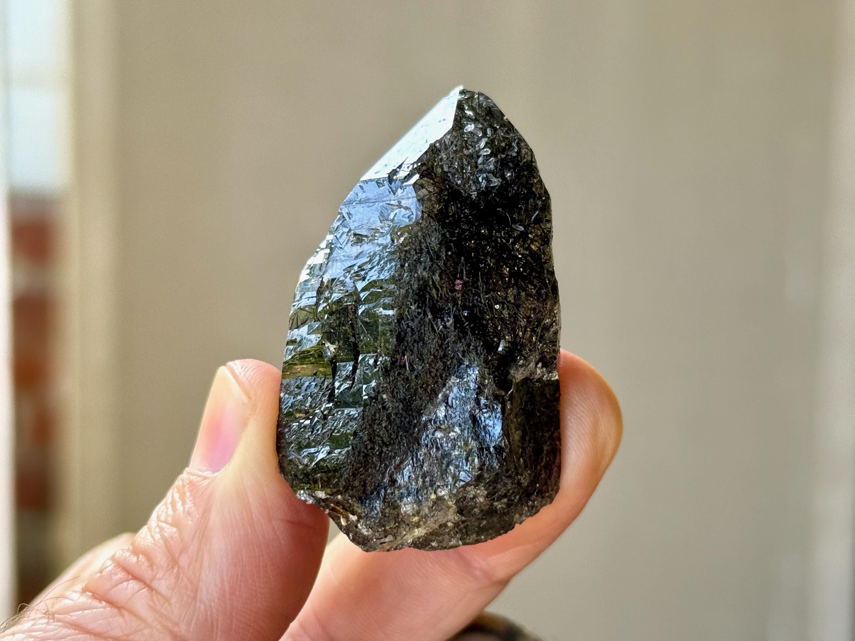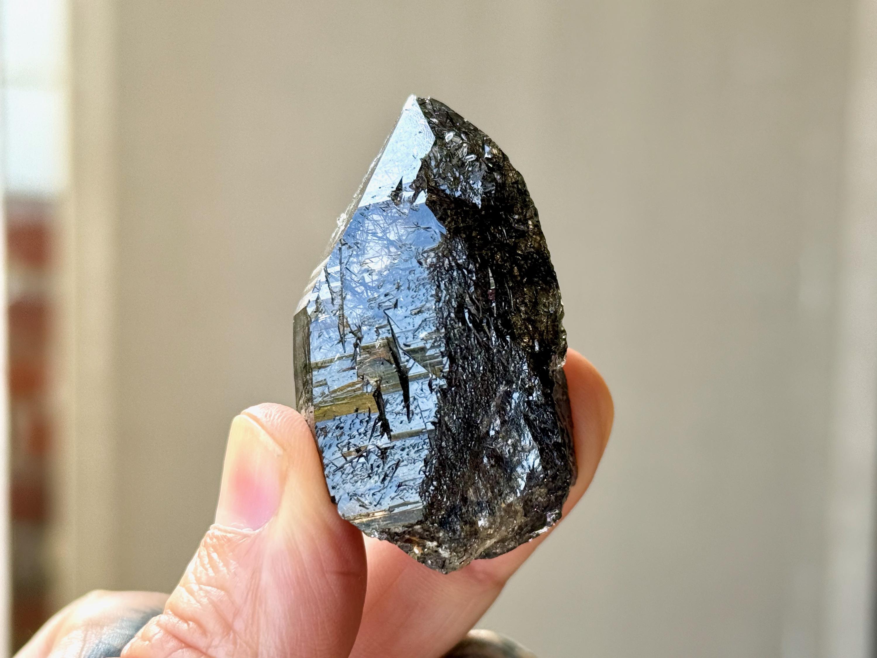 Superb quality to this darkly lustrous Cathedral Quartz crystal filled with Black Tourmaline inclusions! This crystal exhibits a traditional point formation with beautiful etched cathedral textures on its sides. When backlit, as in Photos 4-7, we can see just how well it passes light, and get a sense for the the multitude of individual Black Tourmaline "needles" within.