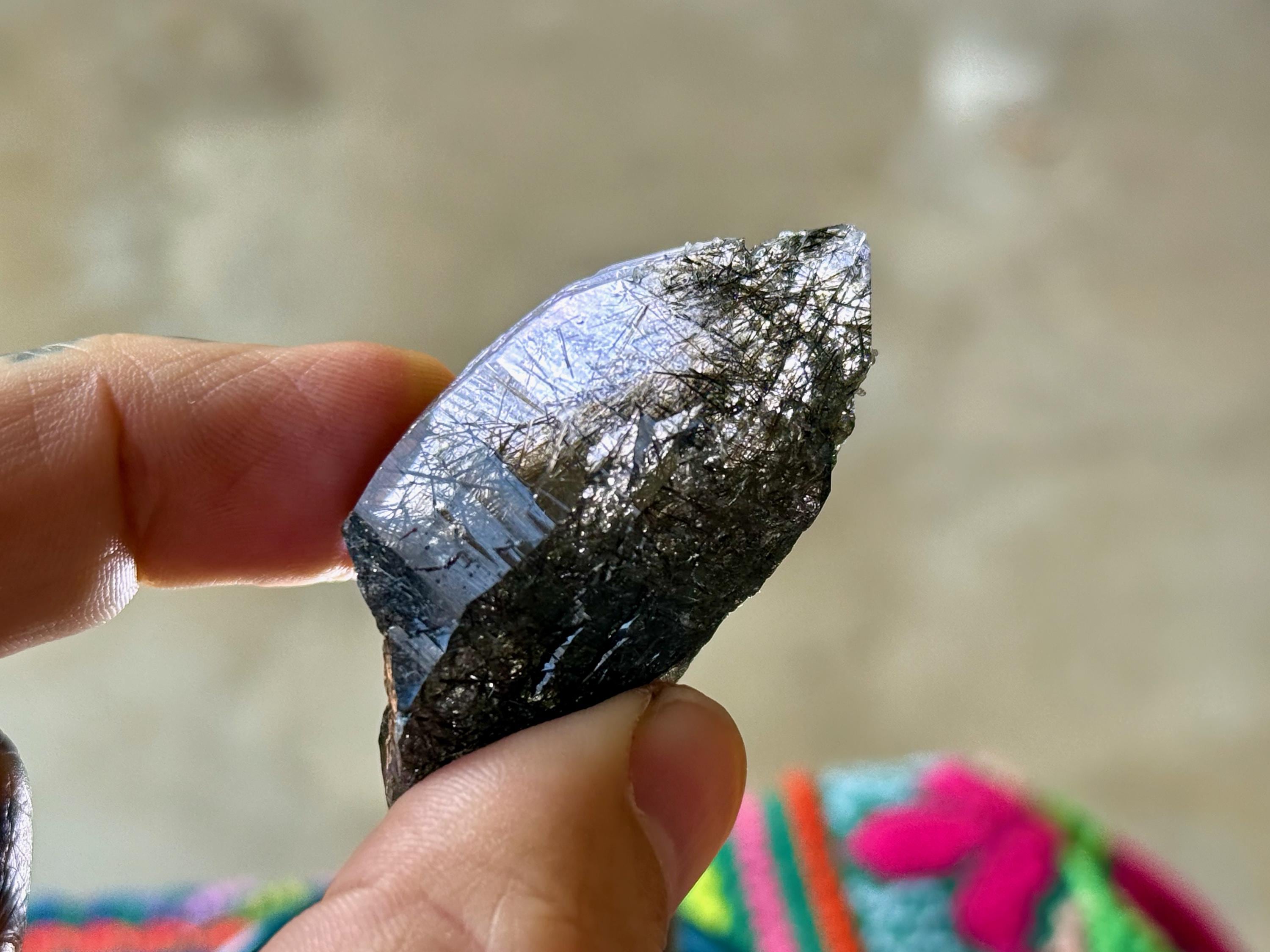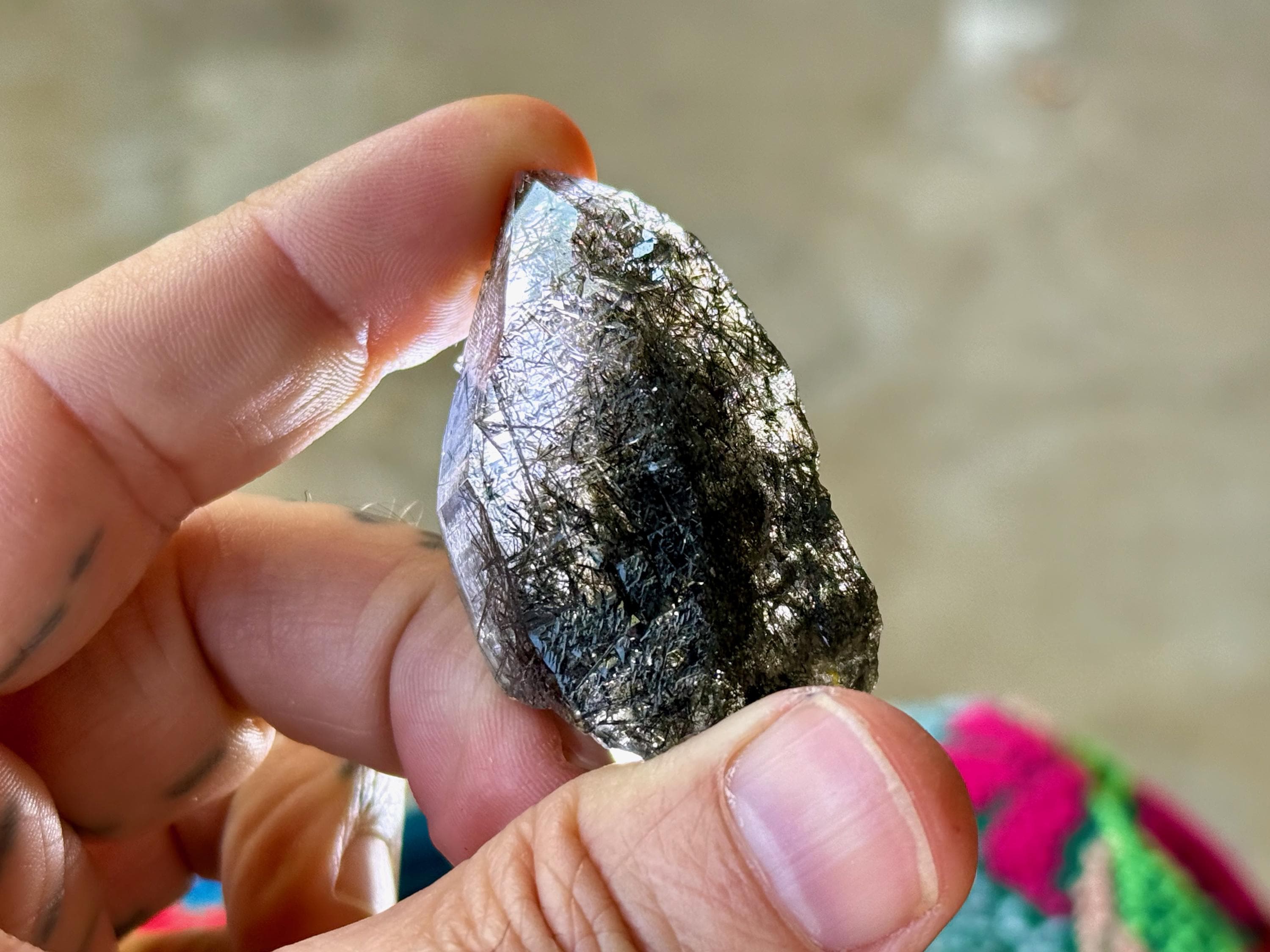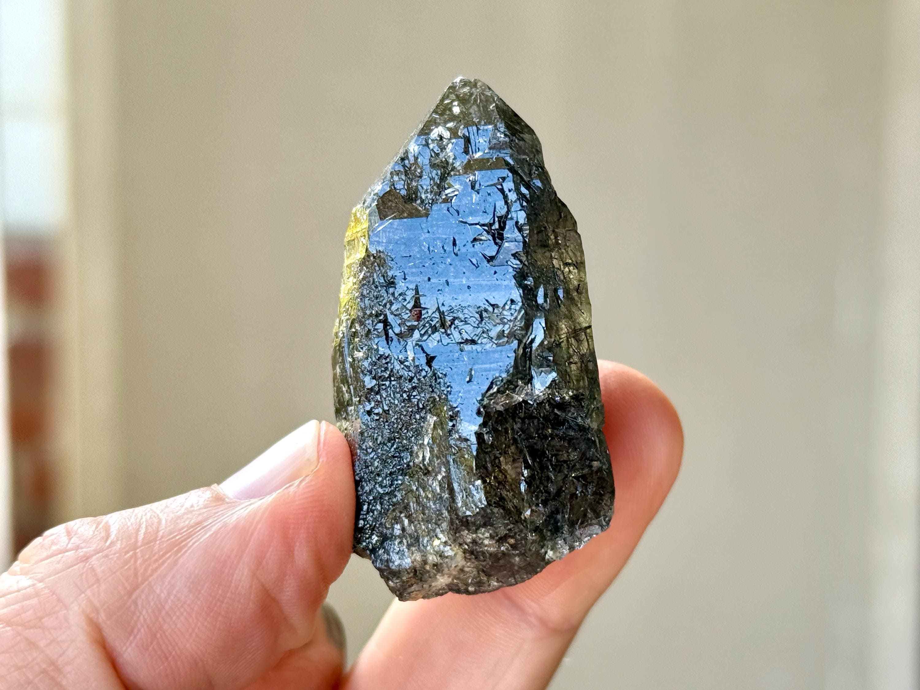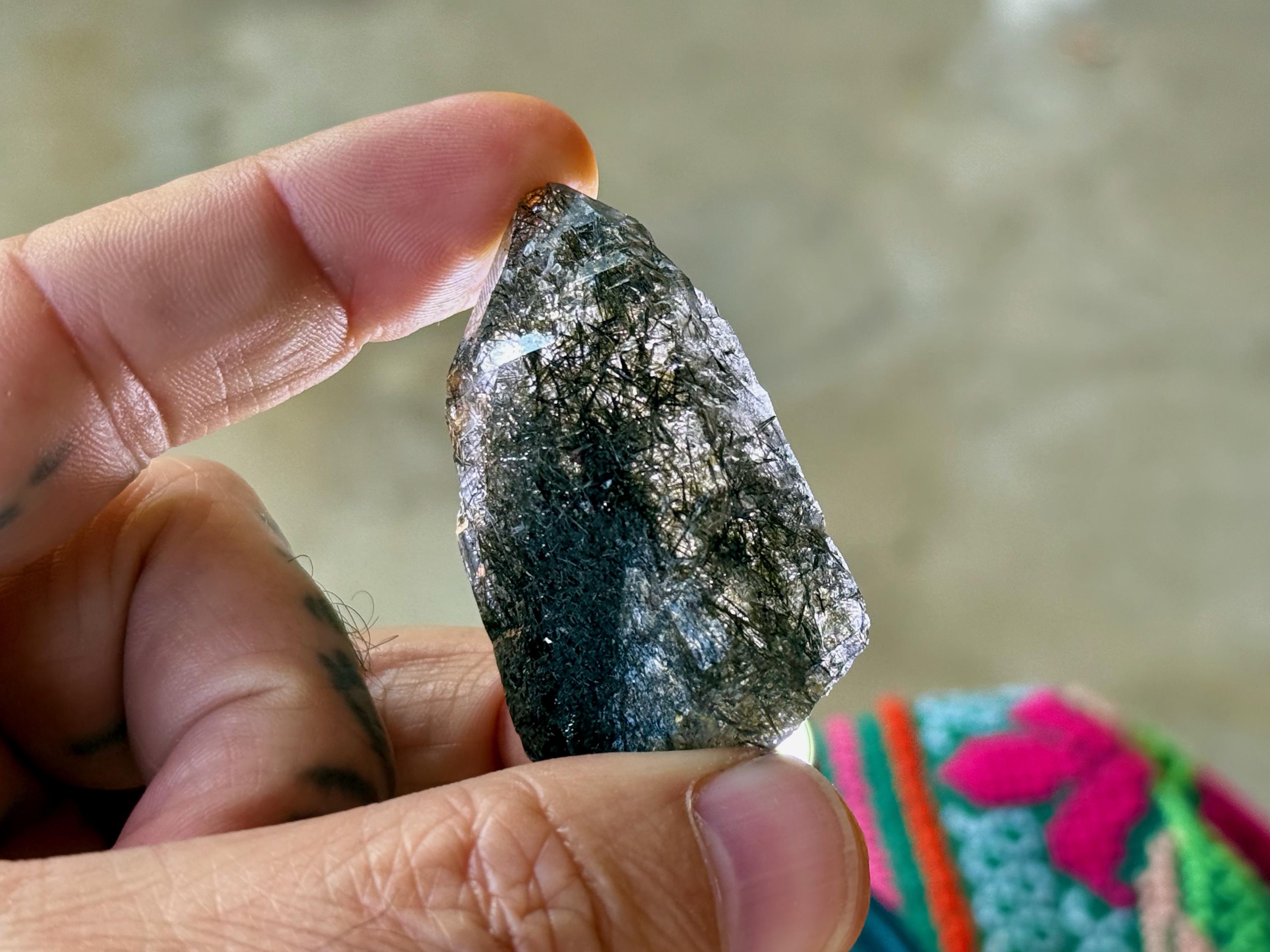Superb quality to this darkly lustrous Cathedral Quartz crystal filled with Black Tourmaline inclusions! This crystal exhibits a traditional point formation with beautiful etched cathedral textures on its sides. When backlit, as in Photos 4-7, we can see just how well it passes light, and get a sense for the the multitude of individual Black Tourmaline "needles" within.