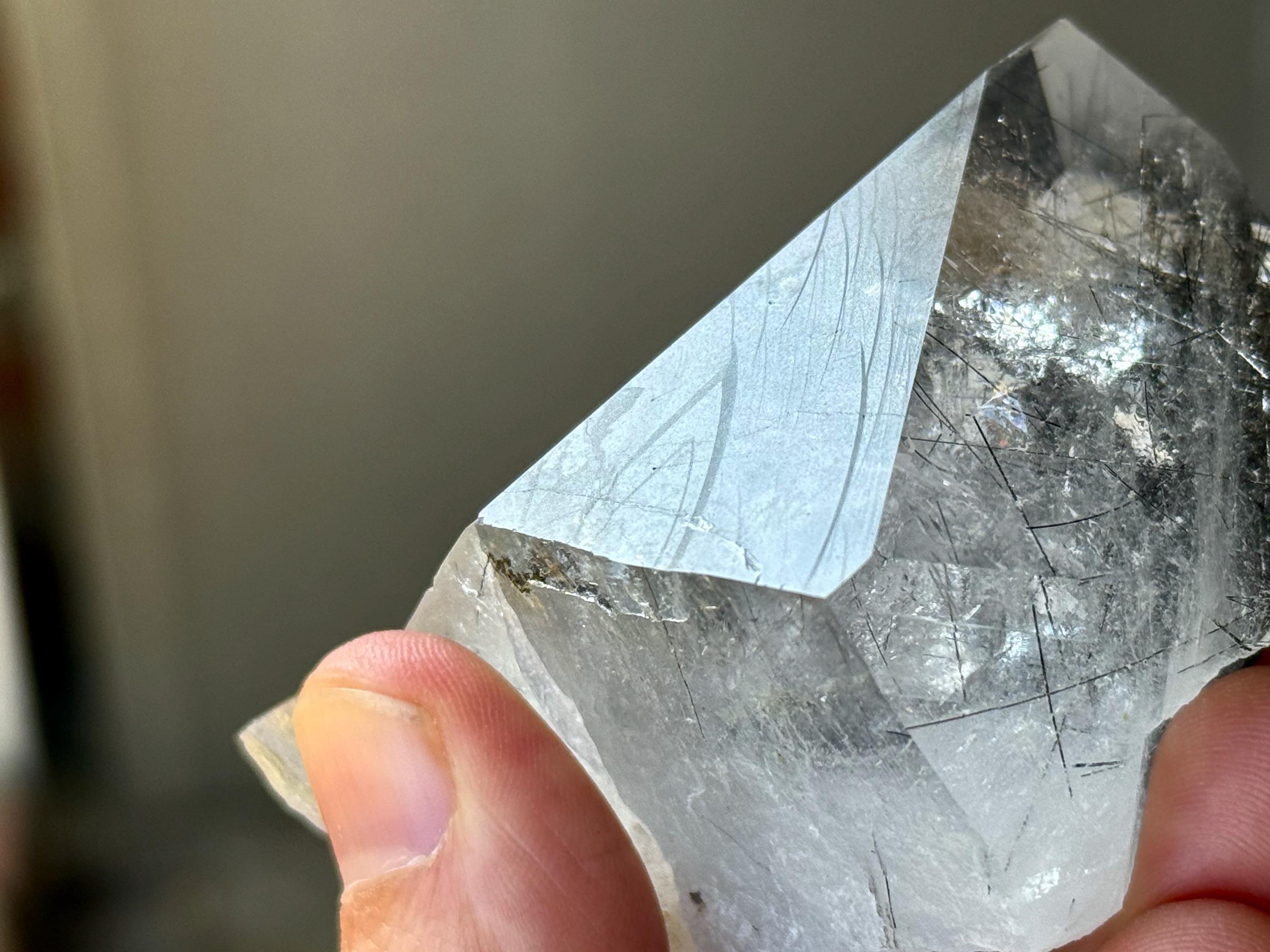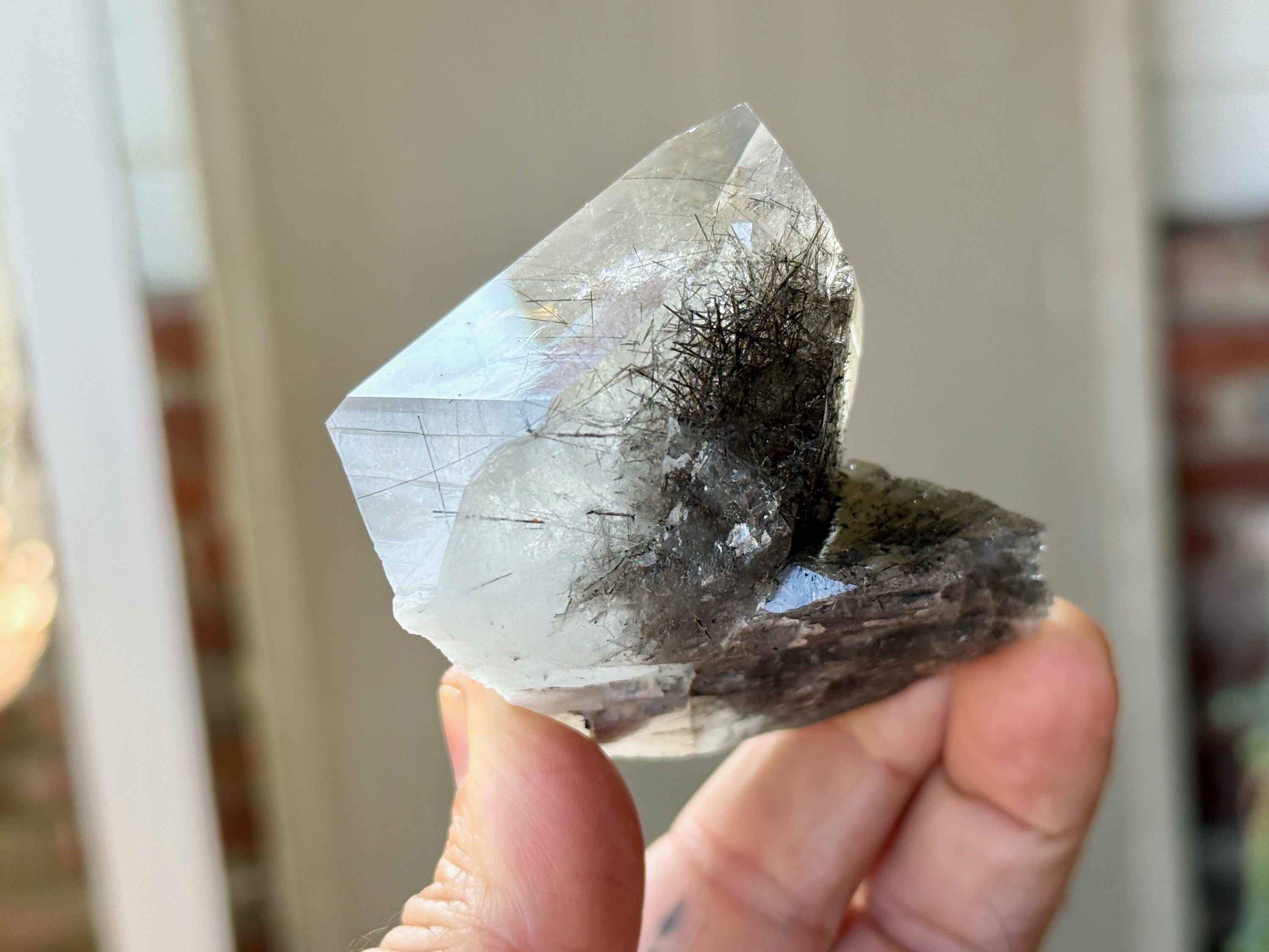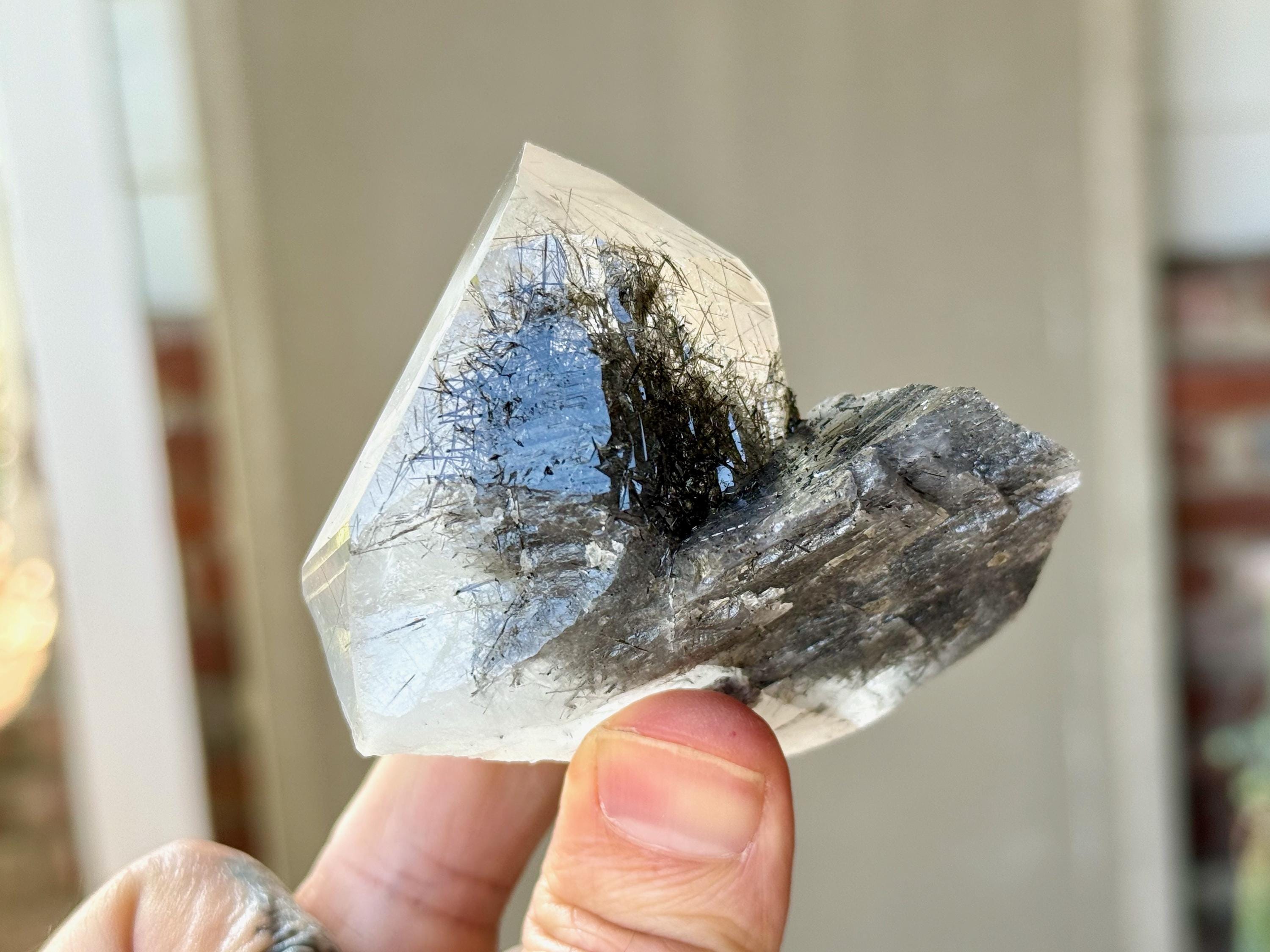 Magnificent luster and exceptional clarity to this Quartz crystal with Black Tourmaline "needle" inclusions within. This is one of the finest pieces from this collection and is a wonderful Tantric Twin formation.