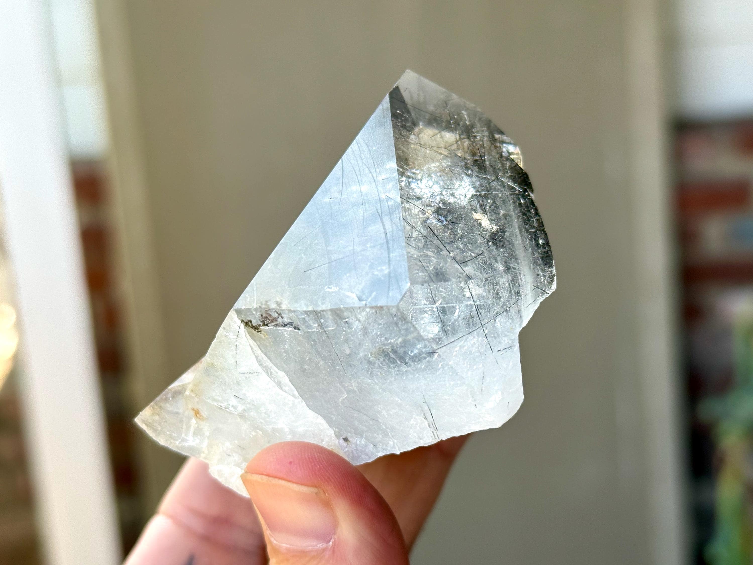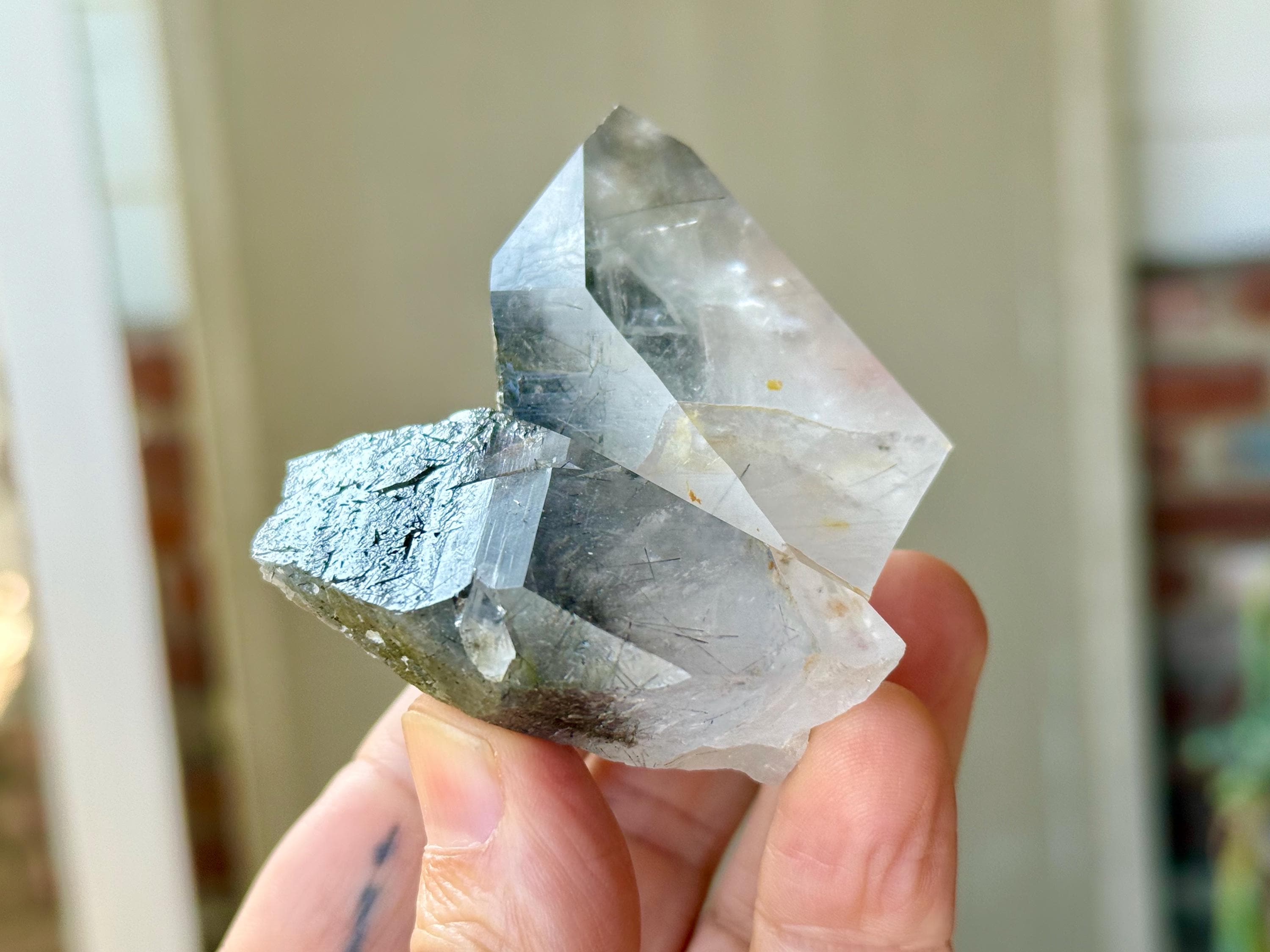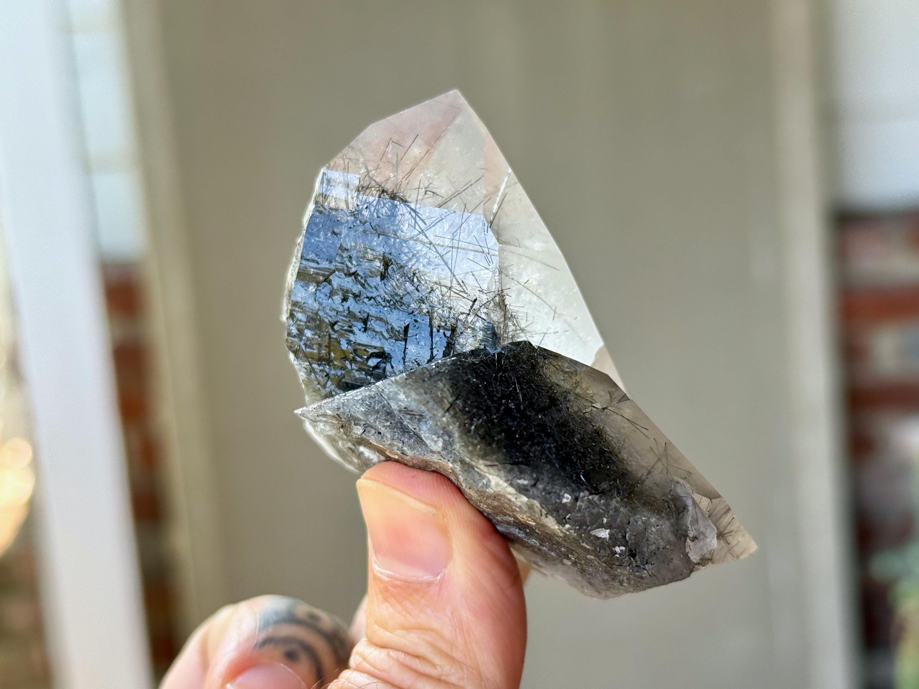 Magnificent luster and exceptional clarity to this Quartz crystal with Black Tourmaline "needle" inclusions within. This is one of the finest pieces from this collection and is a wonderful Tantric Twin formation.