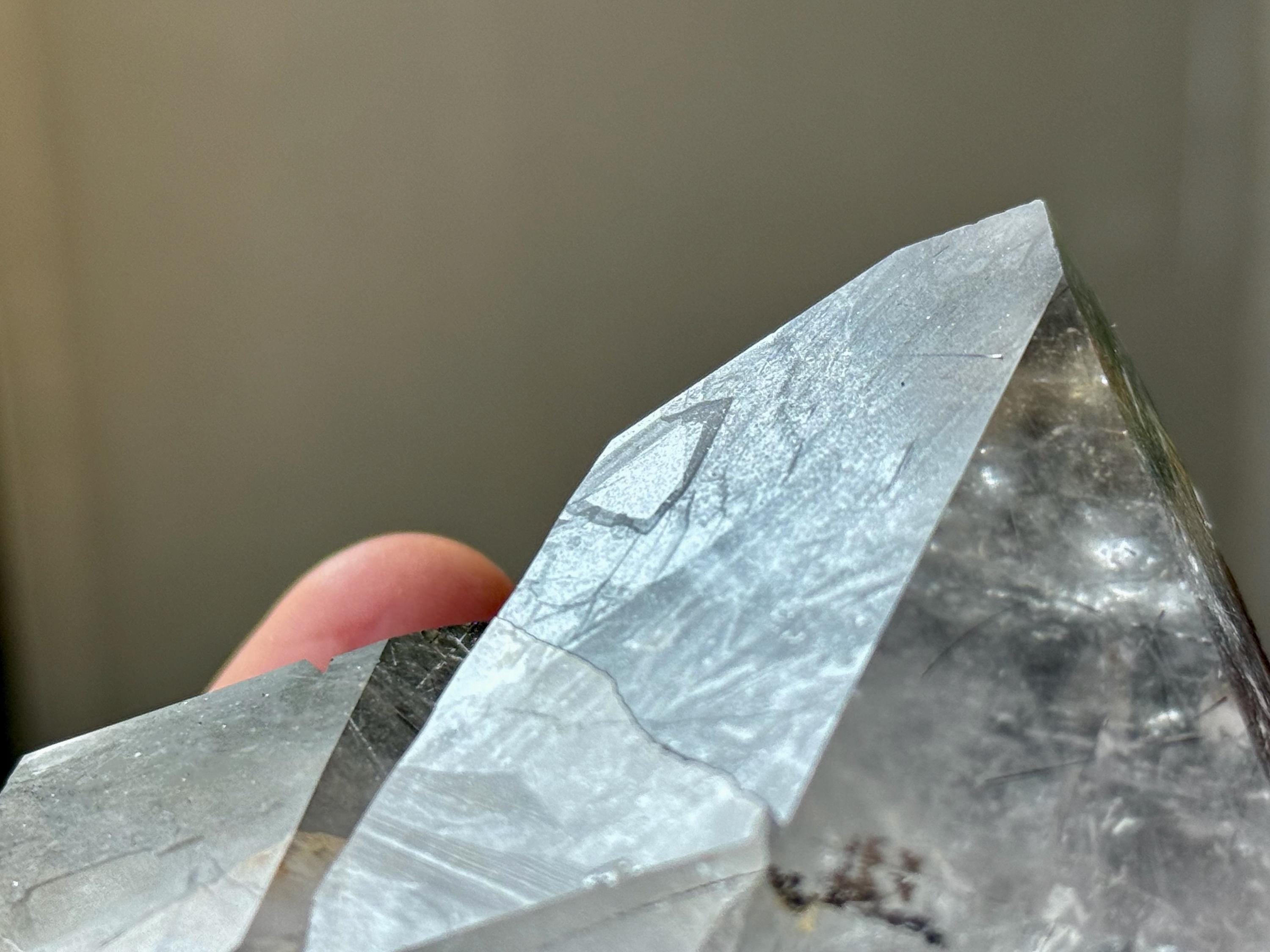 A Record Keeper is a crystal with clearly etched pyramidal shapes on its termination faces. These crystals are quite rare and special and are considered to be ancient "hard drives," containing compiled wisdom of lost civilizations (i.e. Atlantis). They offer a direct interface to be "decoded" via meditation, at which time this library of knowledge held within the Akashic Record can be revealed.