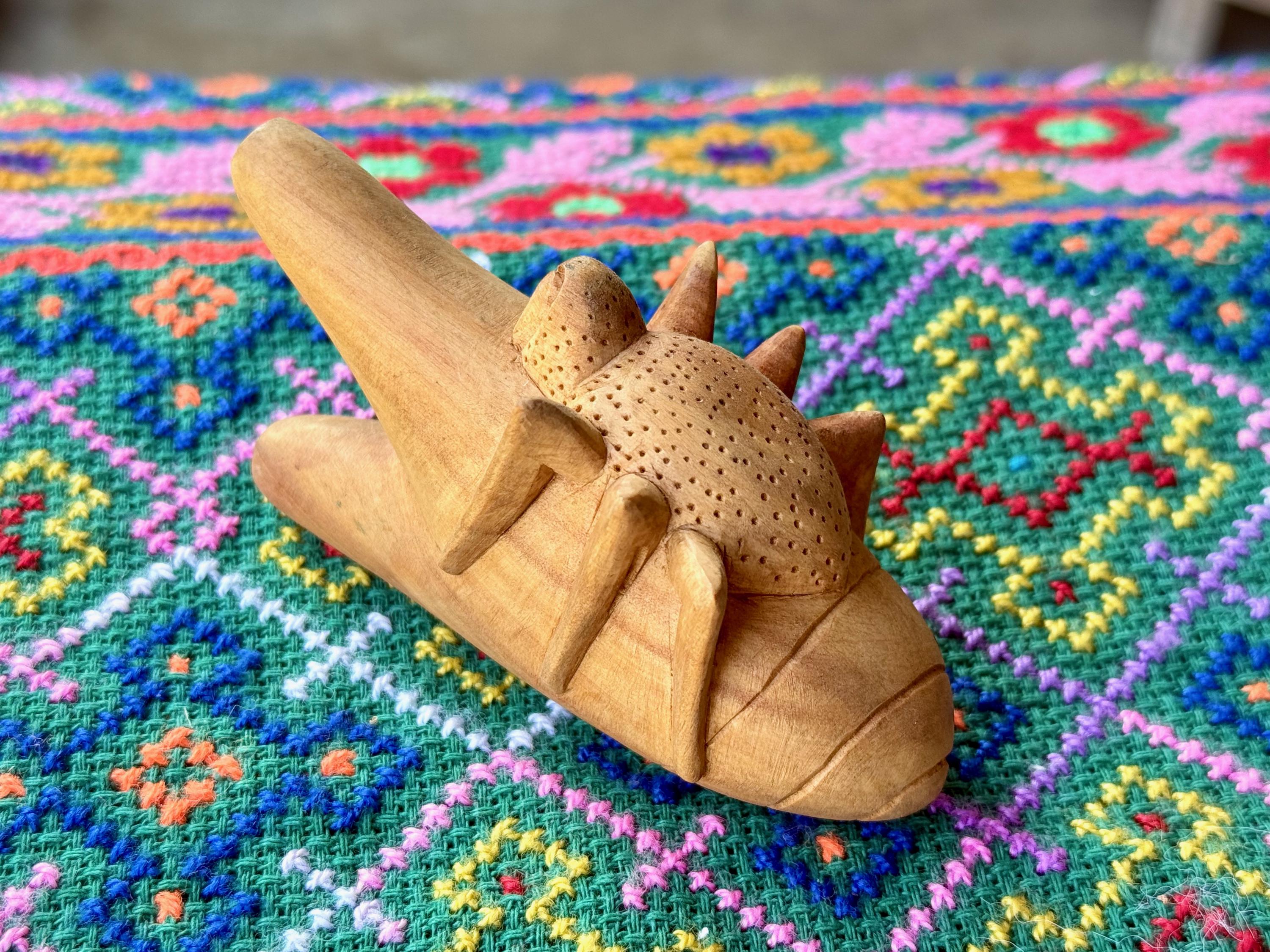 This whimsical Spider Kuripe was hand carved from native Cempaka Wood. Yes, we know an arachnid would have 8 legs, but allowing for some artistic license for our artisans who created this one. It's a bit of a fantasy creature!
