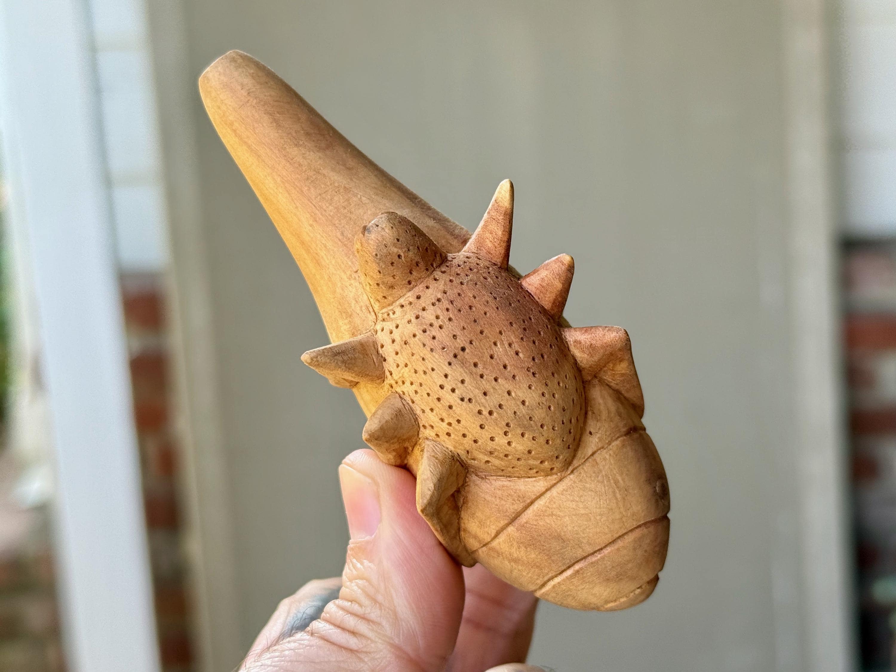 One of the most unusual designs our artisans have crafted for us. This kuripe has the spirit of the Spider, though it could serve as a beetle or other type of jungle insect for sure. The carving is just exceptional, all done on a single block of native Cempaka Wood. A unique and beautiful piece that has wonderful functionality as well.