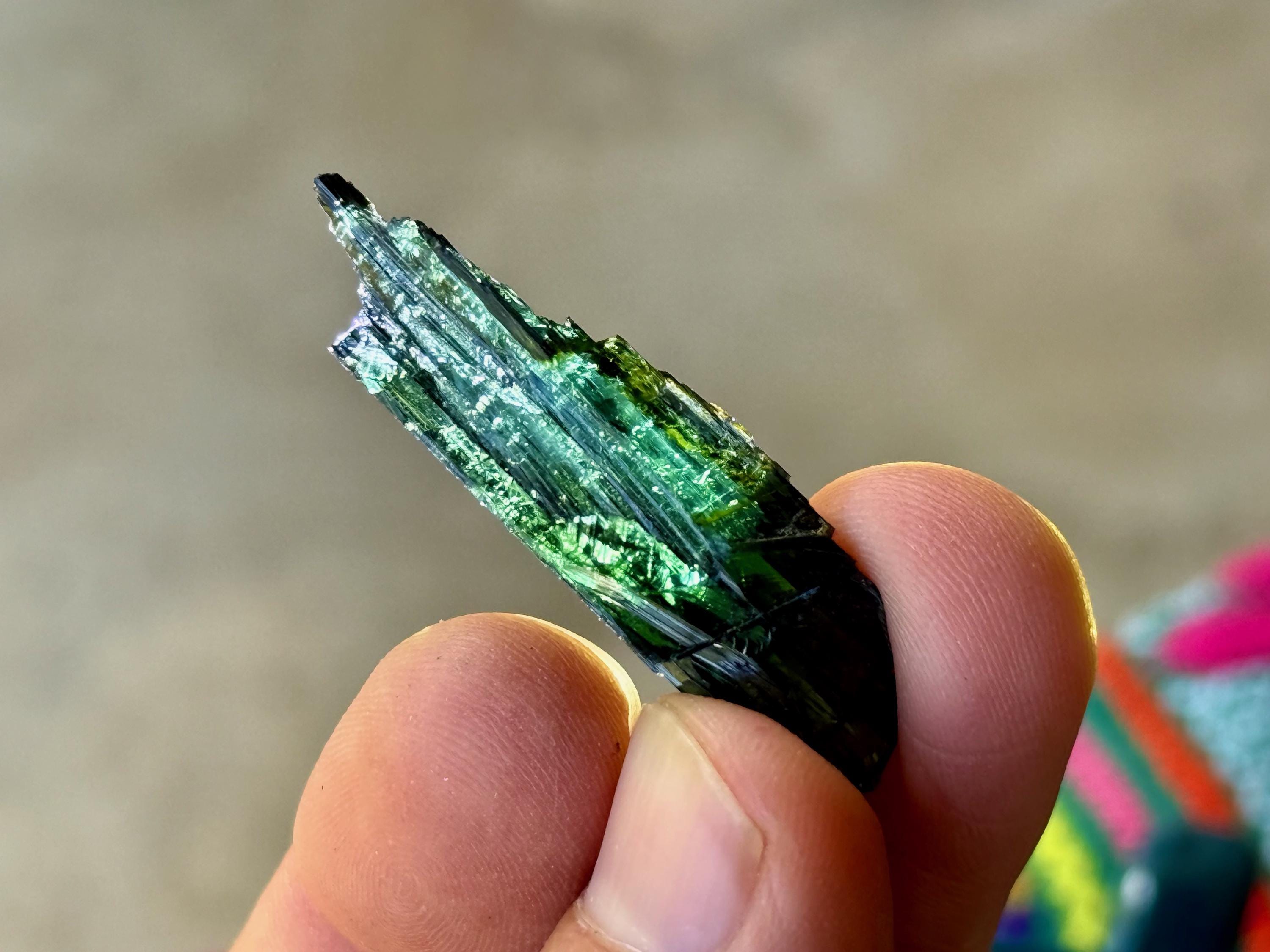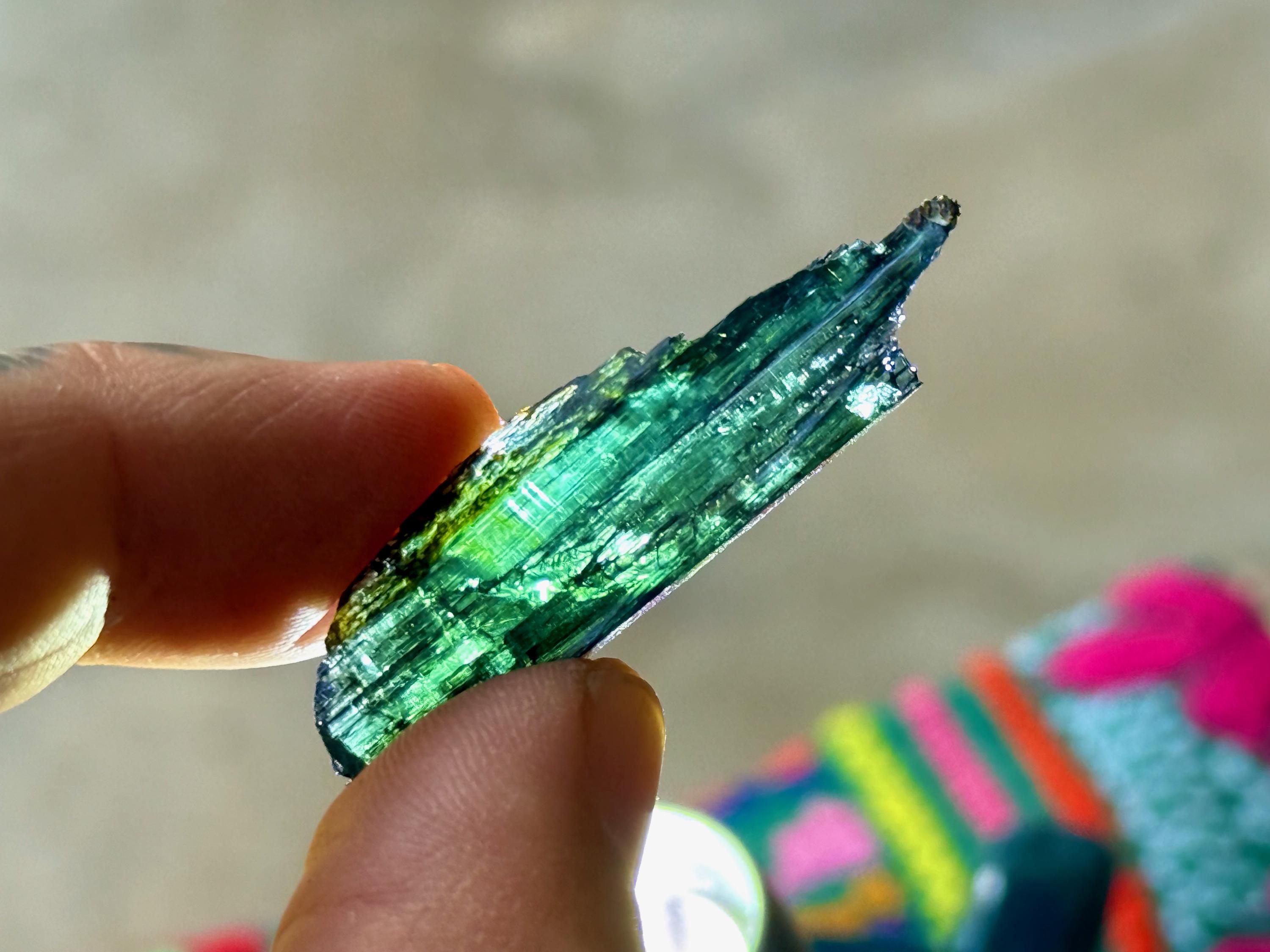 When backlit, the vibrant green hues of this crystal truly come to life, and we can also see some mild blue tinges at the tip (see Photos 1, 3-5). Completely intact and natural formation.