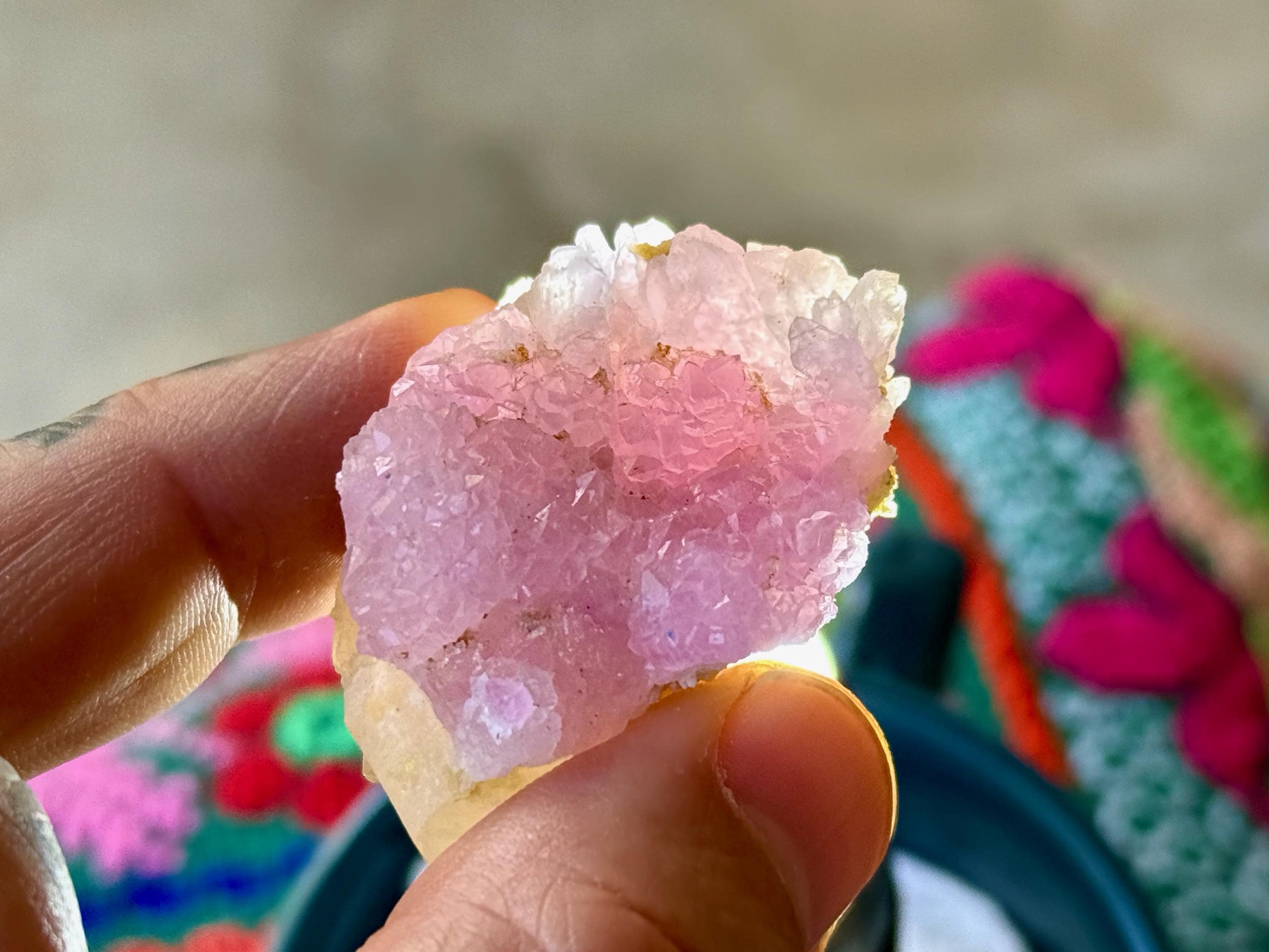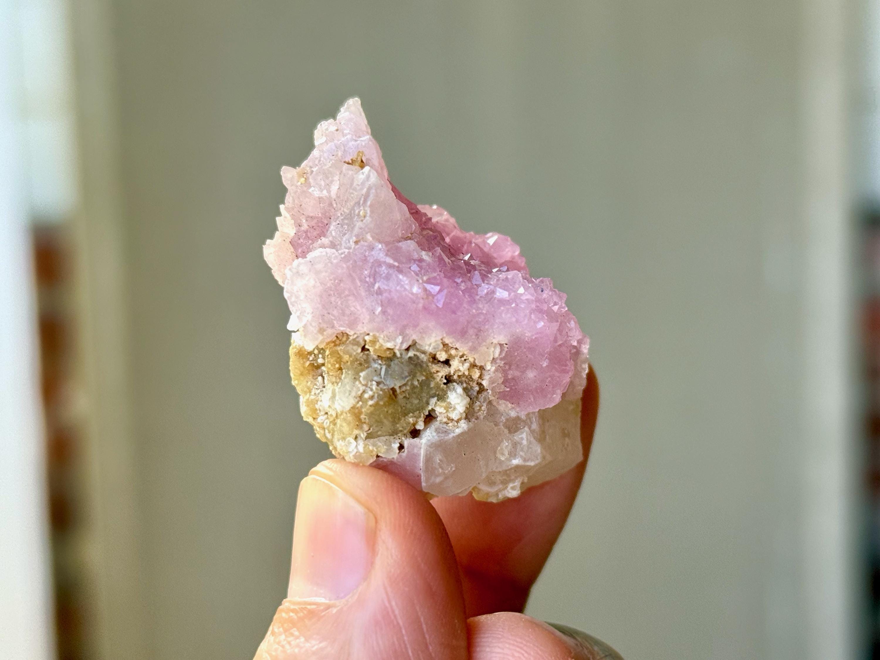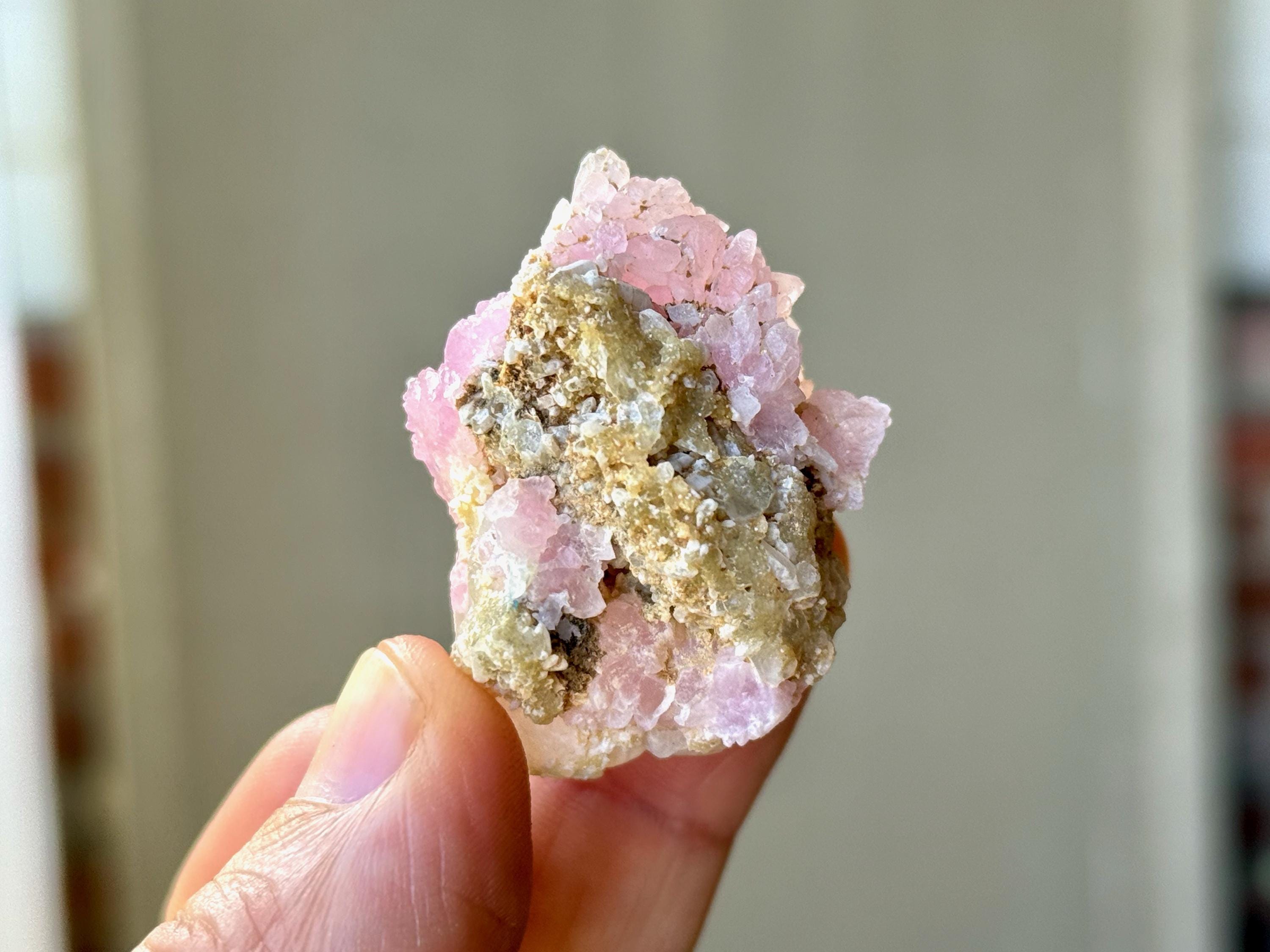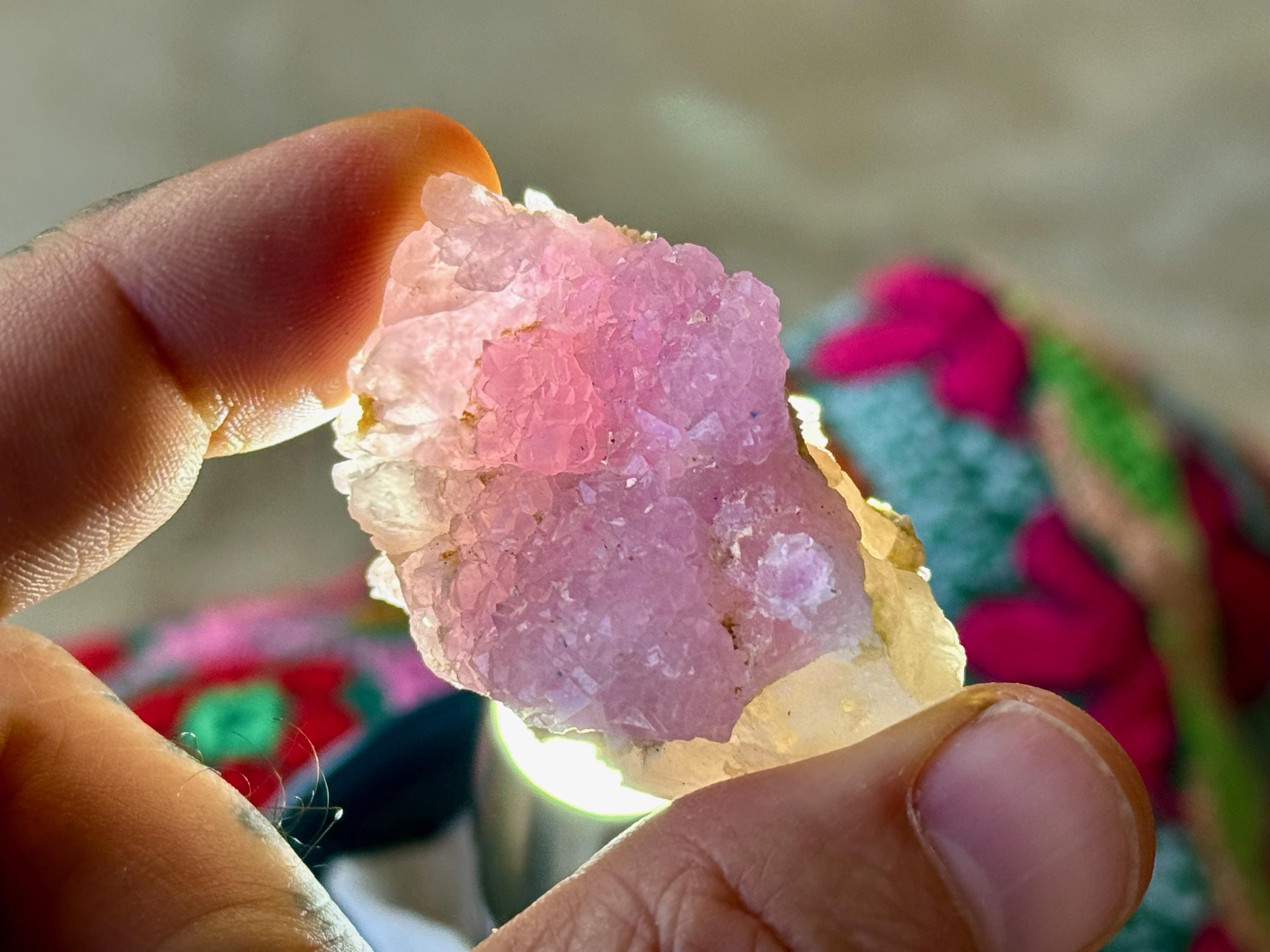 While Rose Quartz, as most of us know it, is quite common in slab form and can be found at any New Age store (in tumbled stones, etc), crystallized Rose Quartz (also known as Canga Rosa or Canga Rose Quartz) is extremely rare. In addition to its physical beauty, it is considered to be one of the most powerful Heart Chakra crystals, purifying and opening the heart on all levels. It carries an energy of divine love, tenderness and sensuality.
