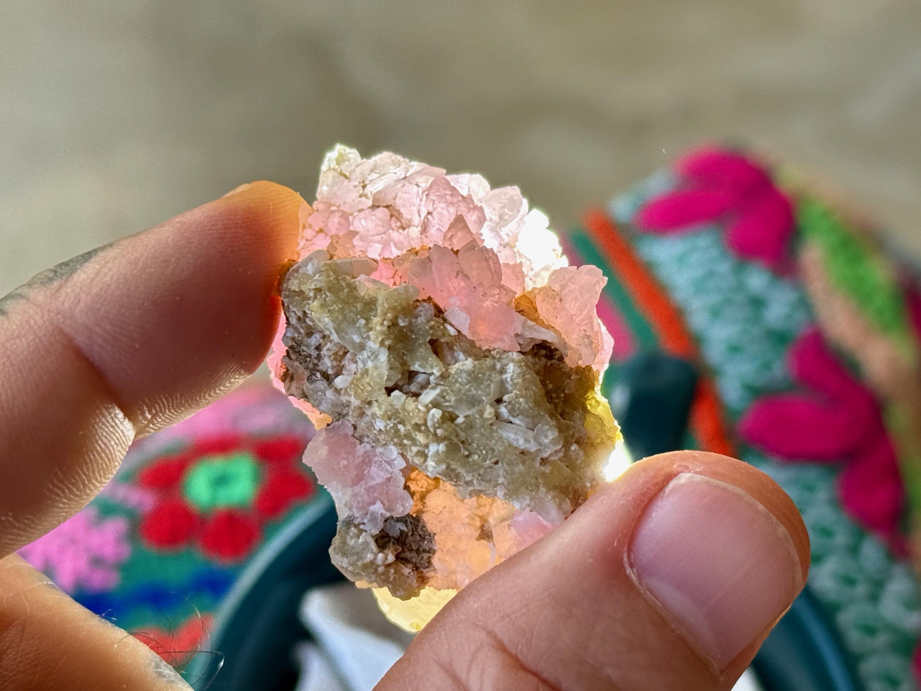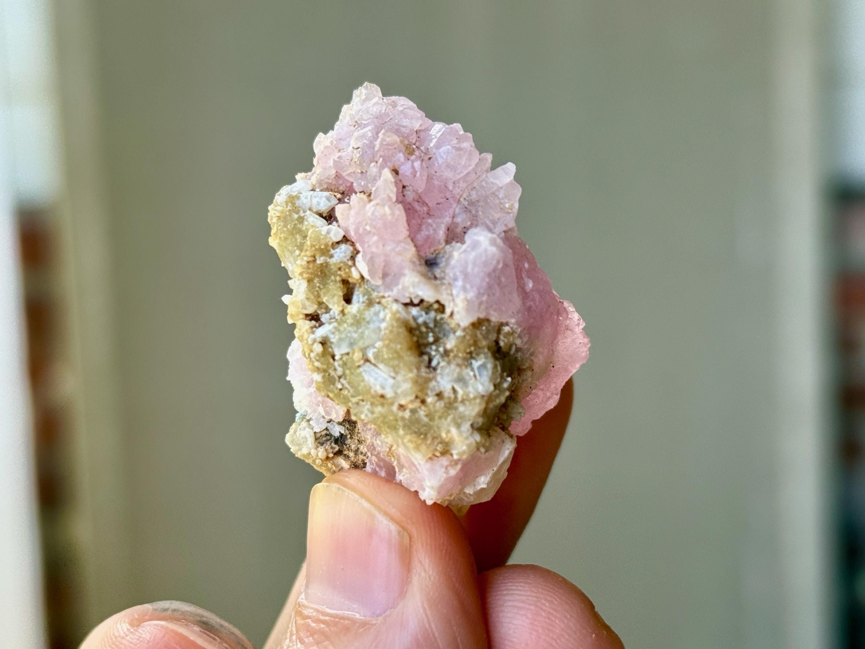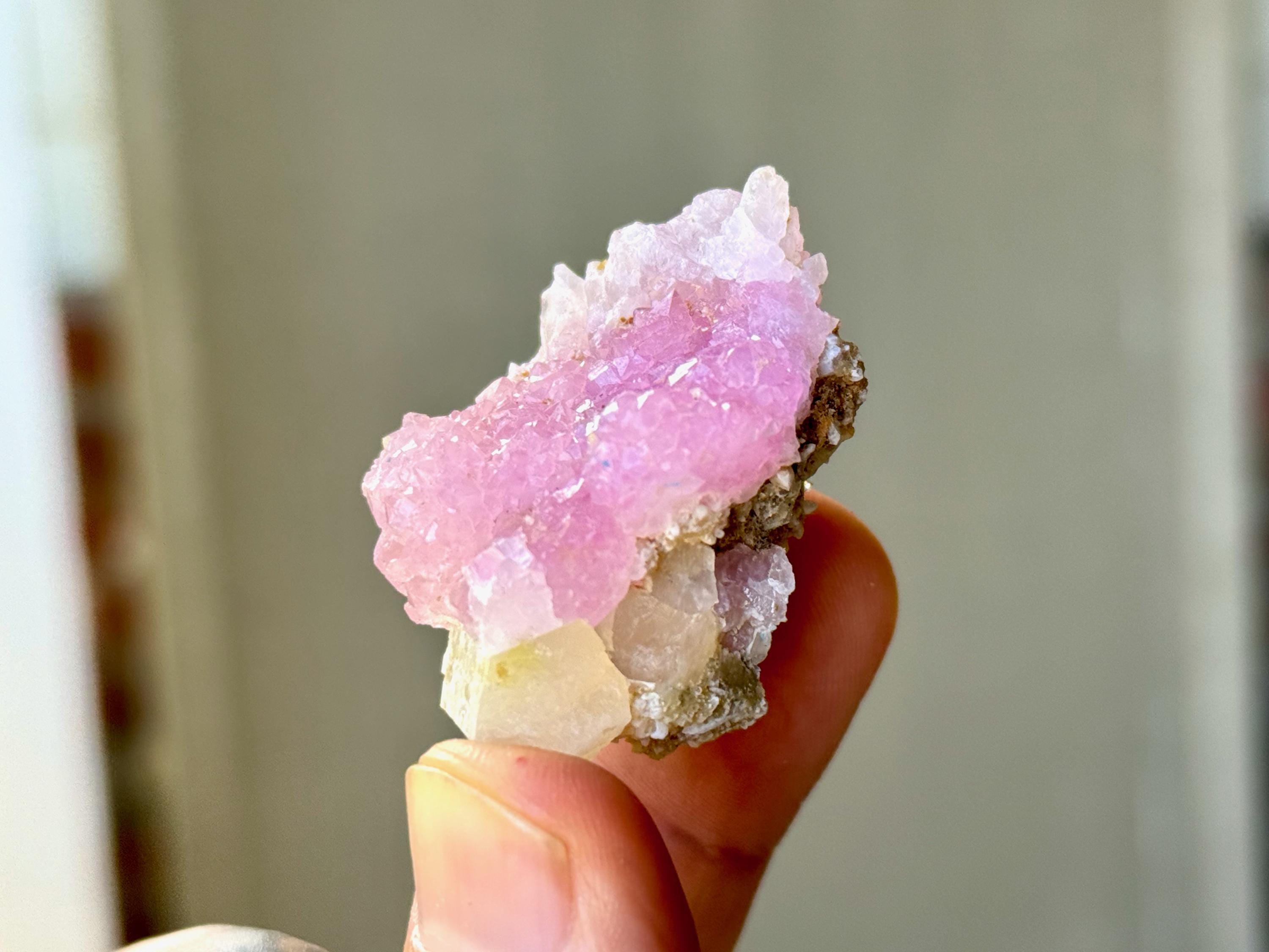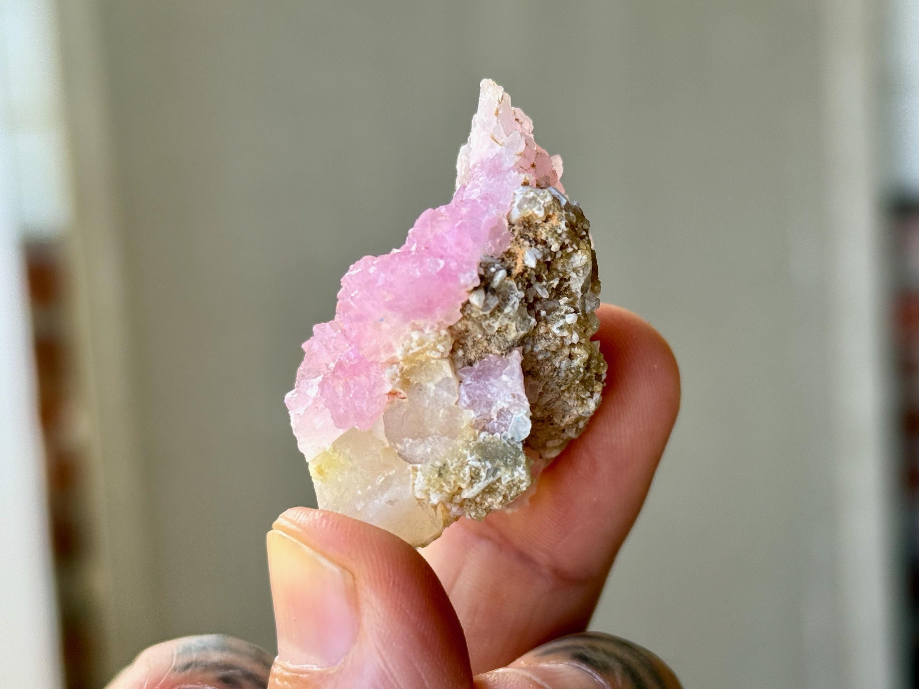 Exquisite luster and a juicy, vibrant pink color to this stunning Canga Rose Quartz in a sublime crystallized formation. This piece is mostly Canga Rosa with a matrix of Quartz at the base and Golden Mica on the backside.