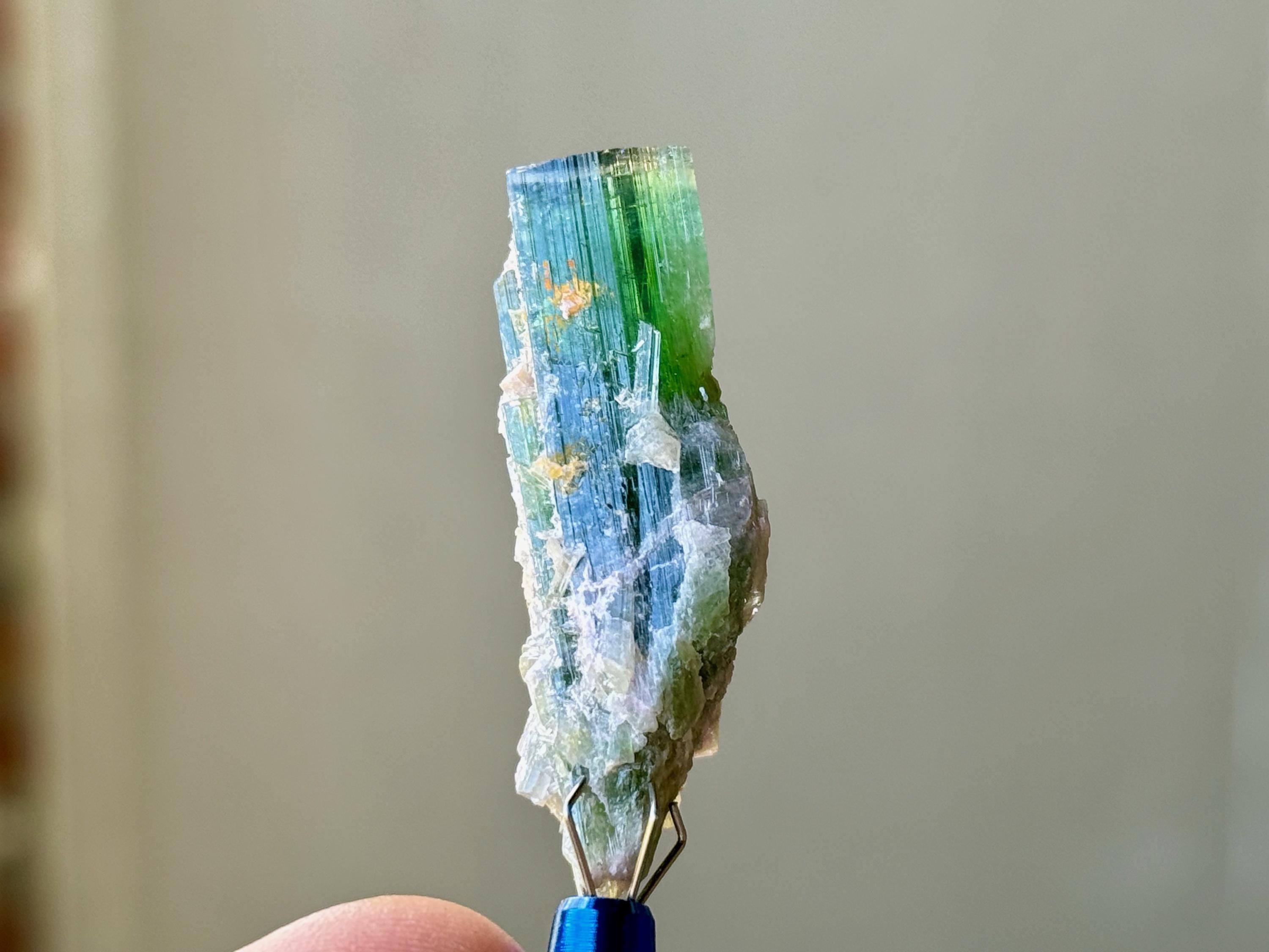 This exquisite bicolor Blue & Green Tourmaline comes from an old find in Aracuai, Minas Gerais, Brazil.