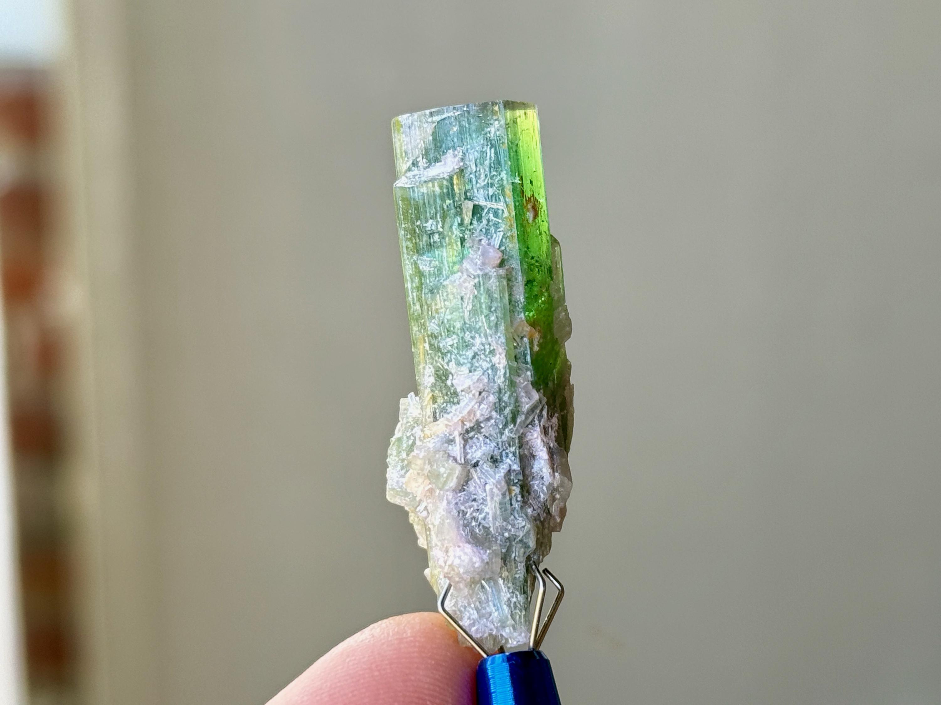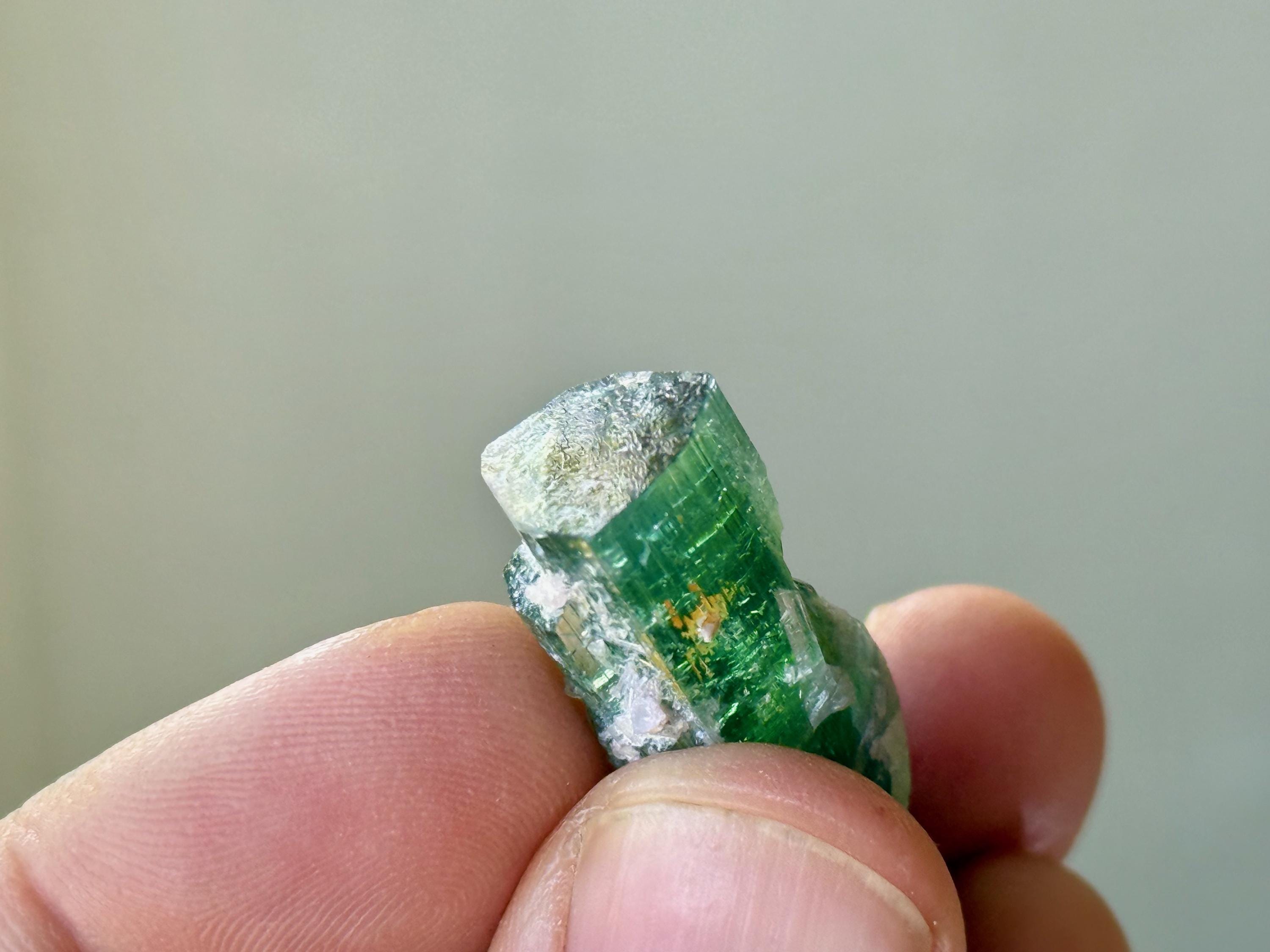 This Tourmaline crystal possesses a color that we would describe as "Teal," but that changes color at different angles. It appears completely green from some angles and more blue from others. We have done our very best to capture the color faithfully, and these photos were taken in natural, partially shaded light with no manipulation.