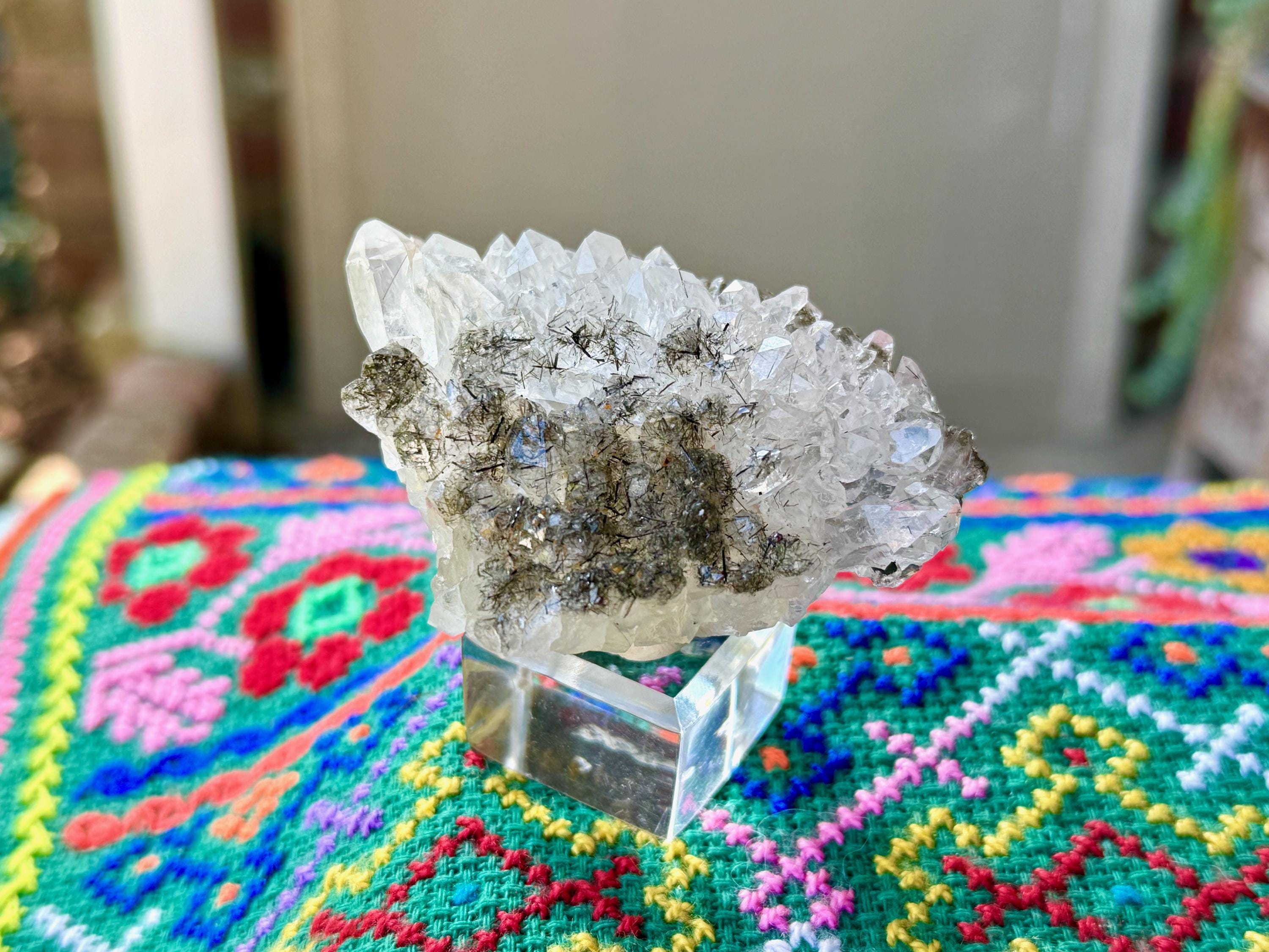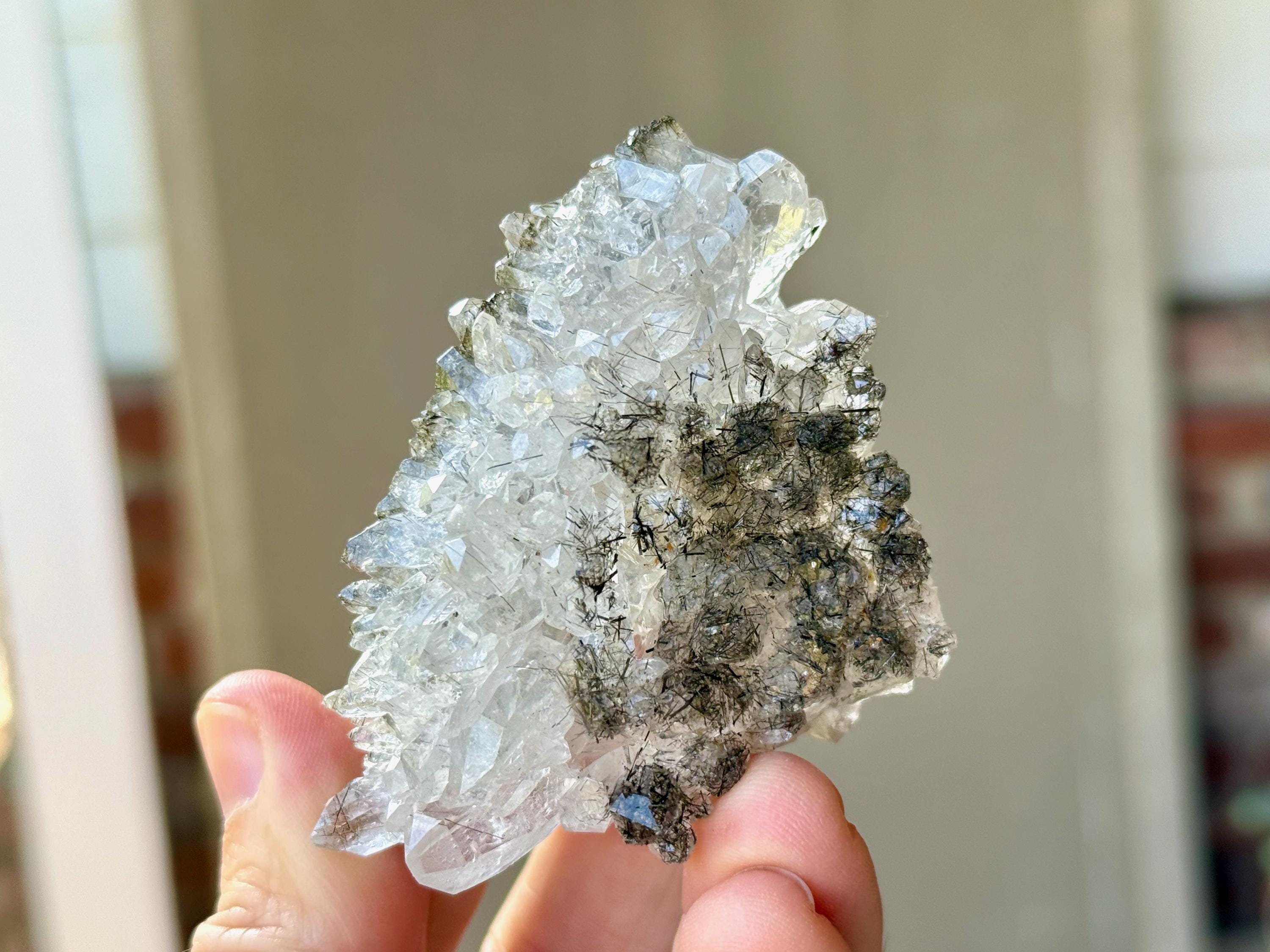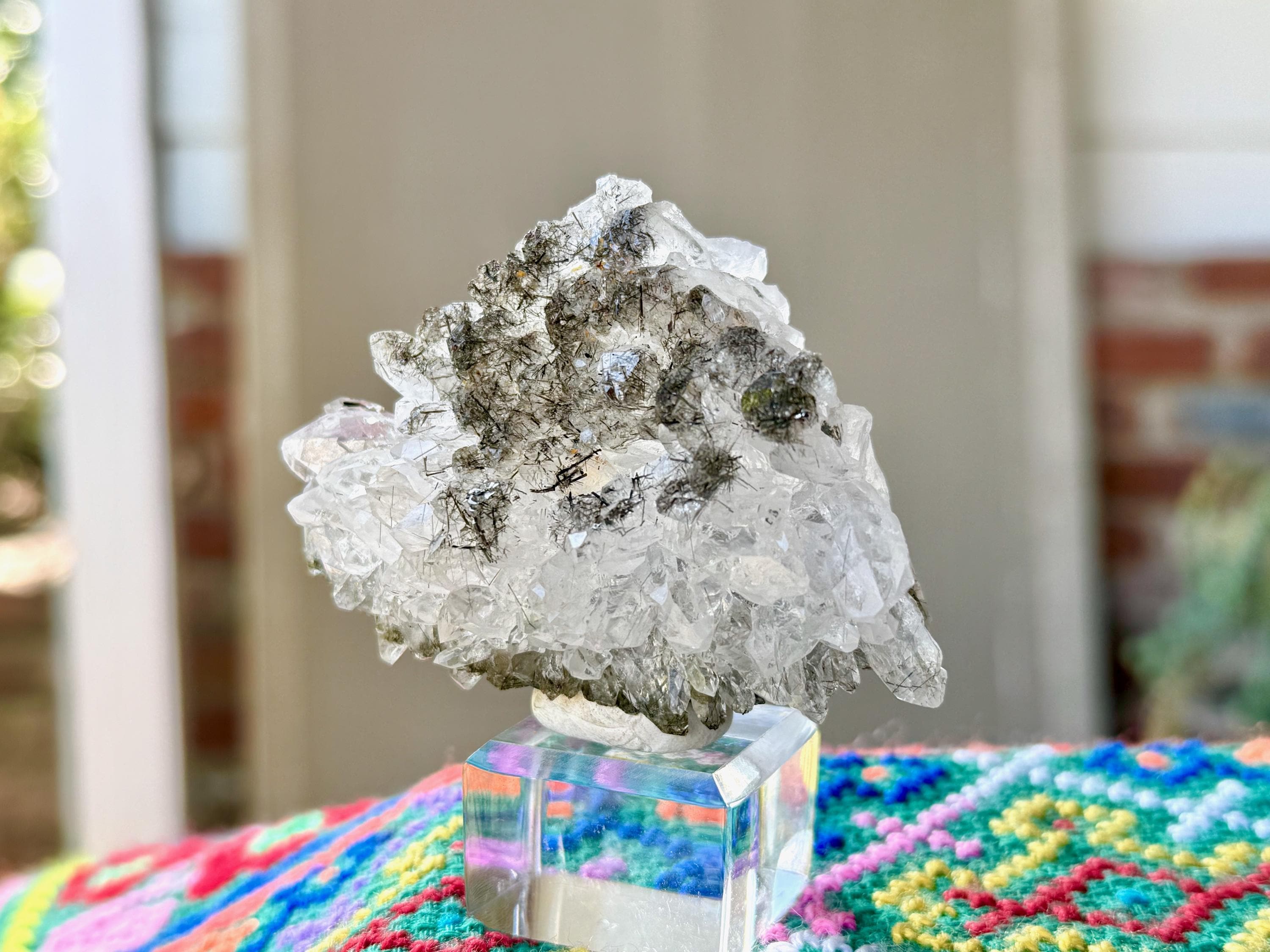 So much elegance and sparkle to this lustrous Quartz crystal cluster with needle-like inclusions of Black Tourmaline throughout. This is a layered formation where we can see the separation of druzy-like quartz and veins of Black Tourmaline on the edges.