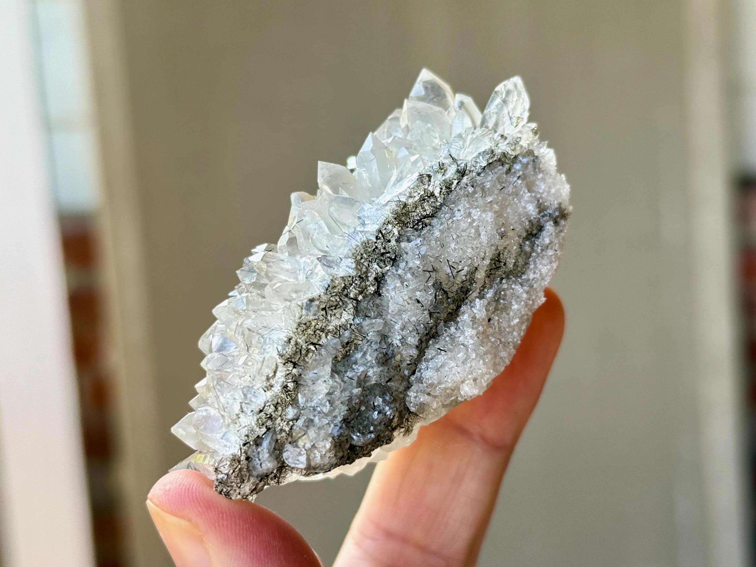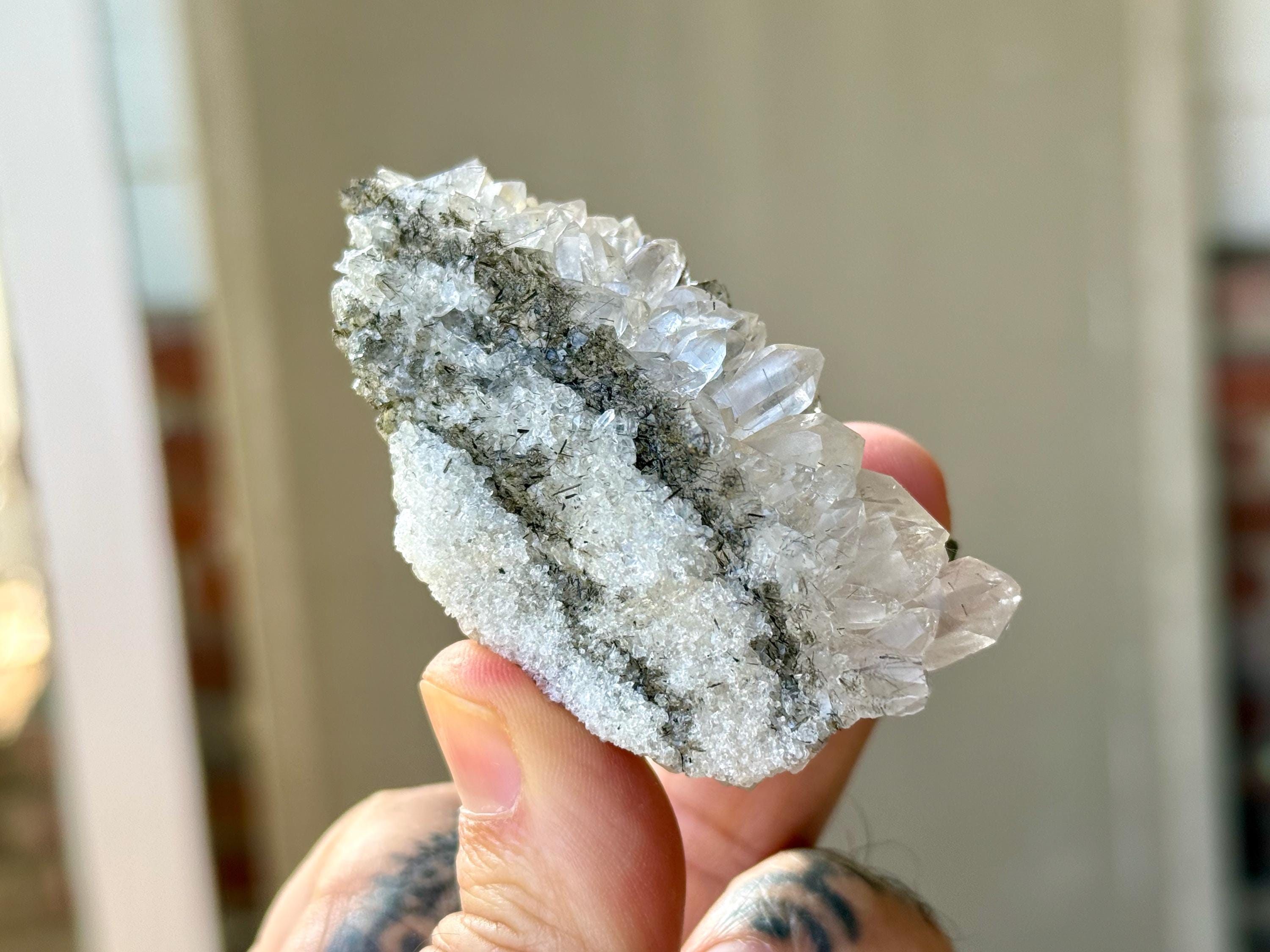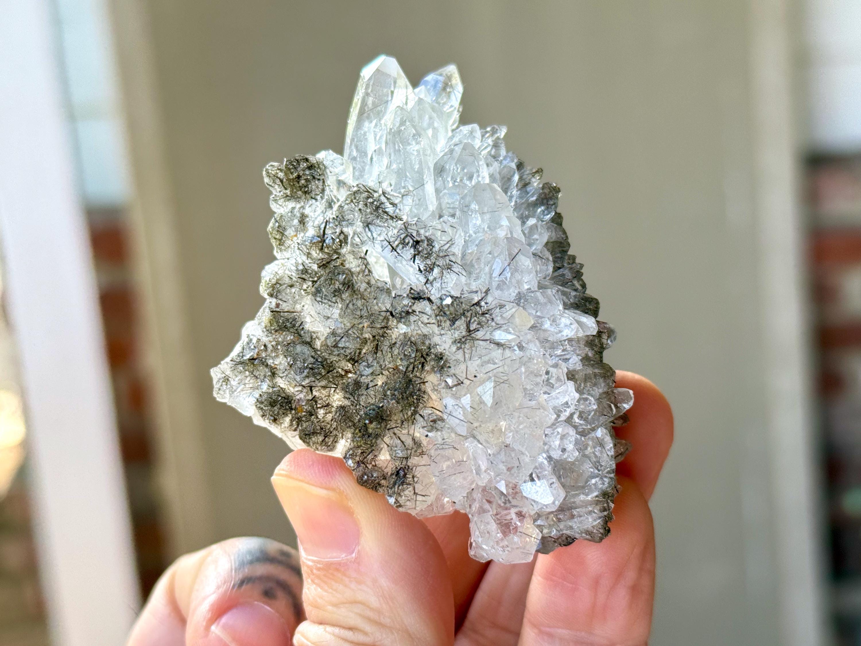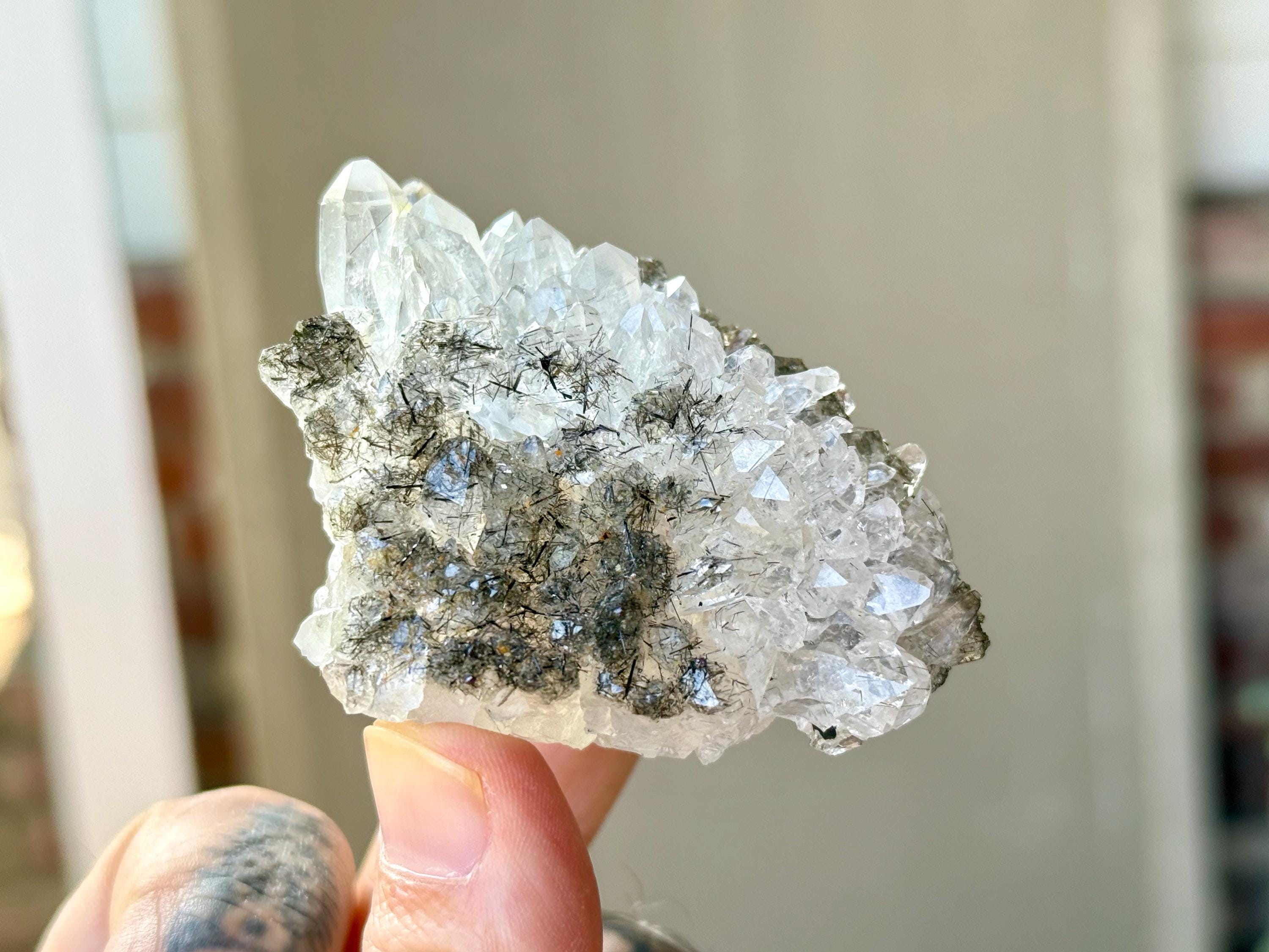So much elegance and sparkle to this lustrous Quartz crystal cluster with needle-like inclusions of Black Tourmaline throughout. This is a layered formation where we can see the separation of druzy-like quartz and veins of Black Tourmaline on the edges.