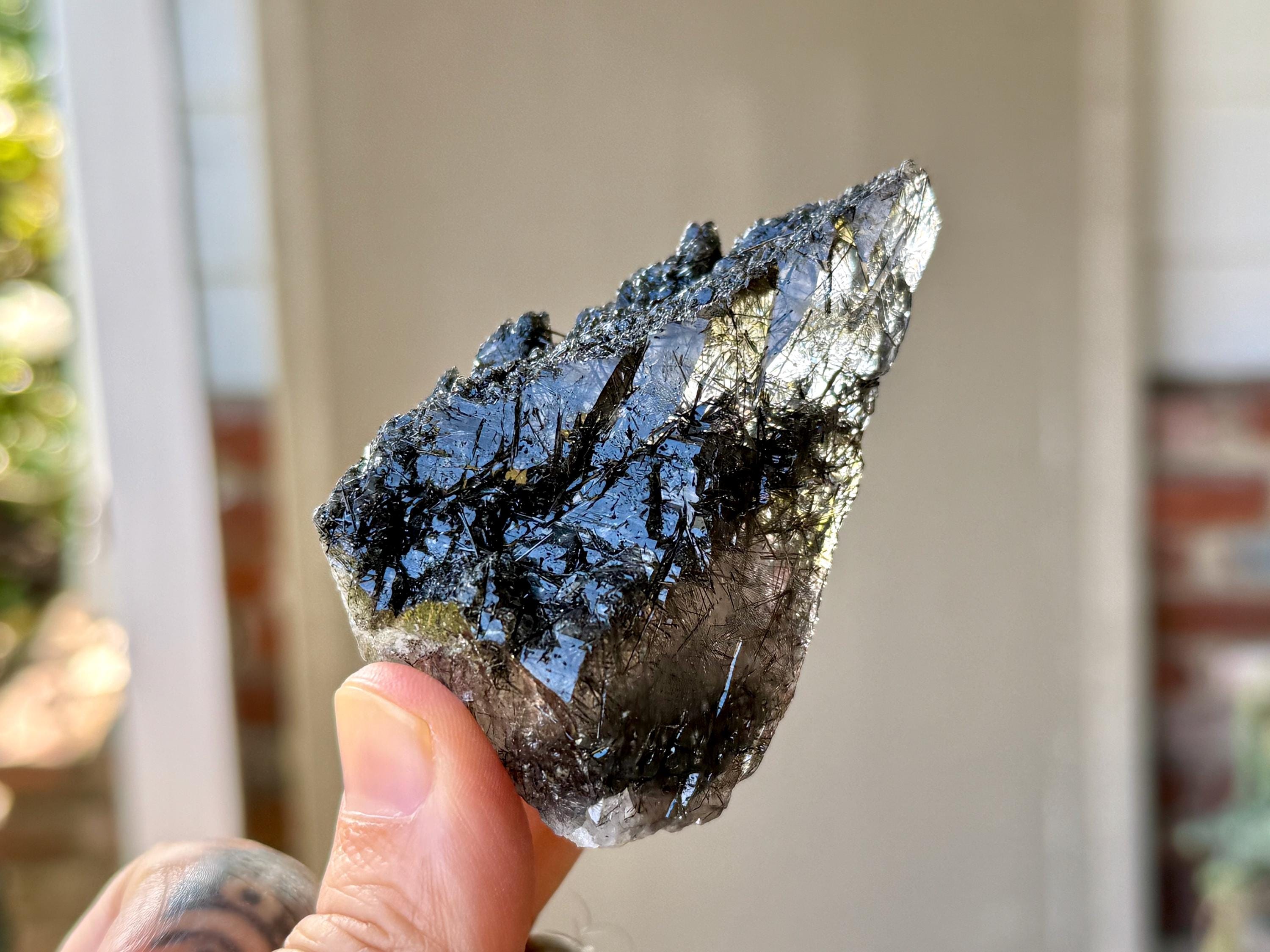The left side sparkles with Black Tourmaline inclusions on the exterior, and the back is a broad and smooth self-healed area. Nicely terminated and intact all around, a real beauty!