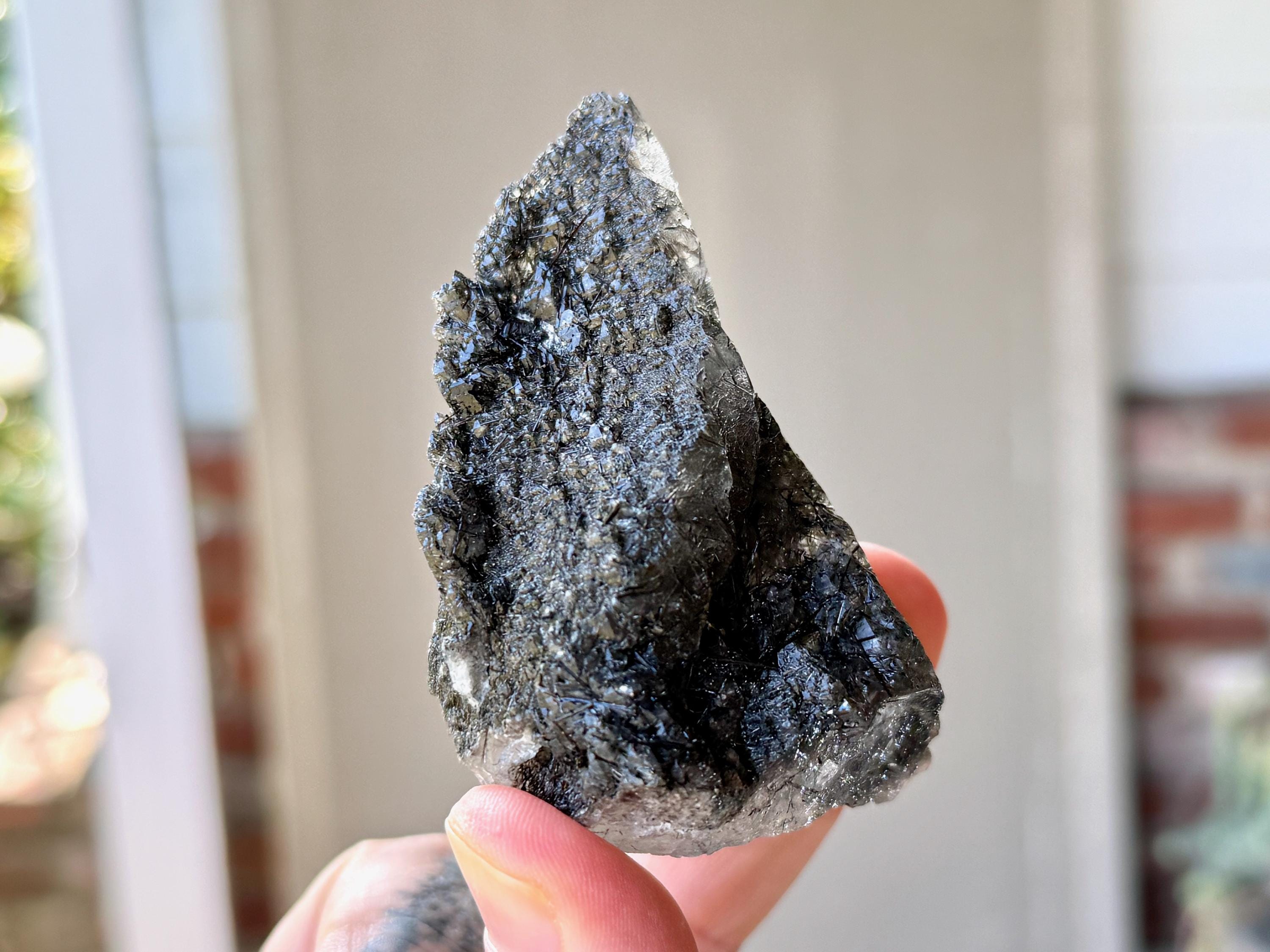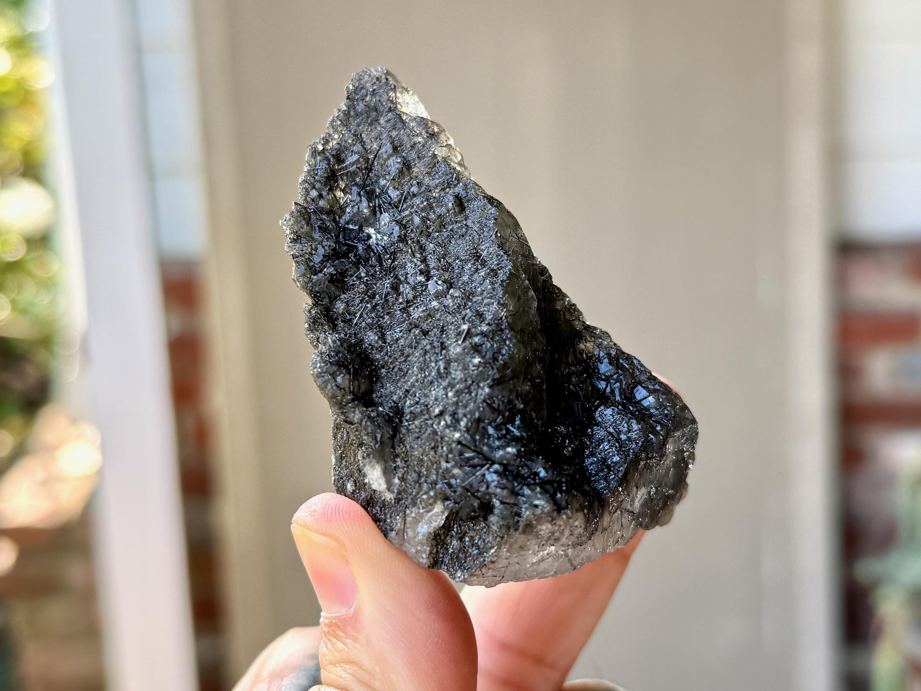 Outstanding quality to this darkly lustrous Cathedral Quartz crystal filled with Black Tourmaline inclusions! This crystal exhibits a somewhat pyramidal formation with beautiful etched cathedral textures on its front and right side. When backlit, as in Photos 3-4, we can see just how well it passes light, and get a sense for the the multitude of individual Black Tourmaline "needles" within.