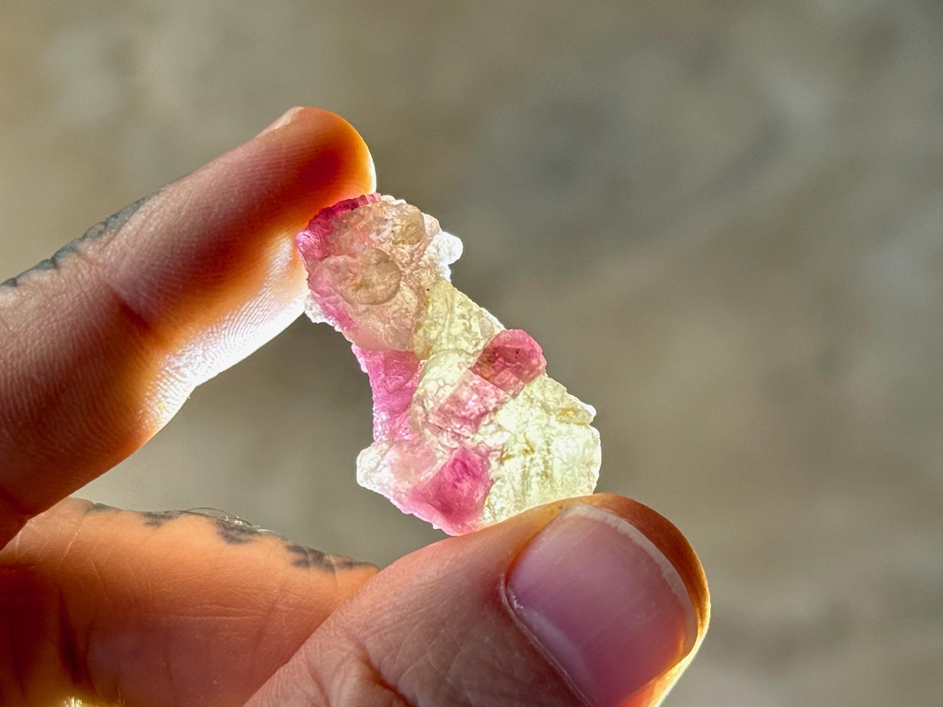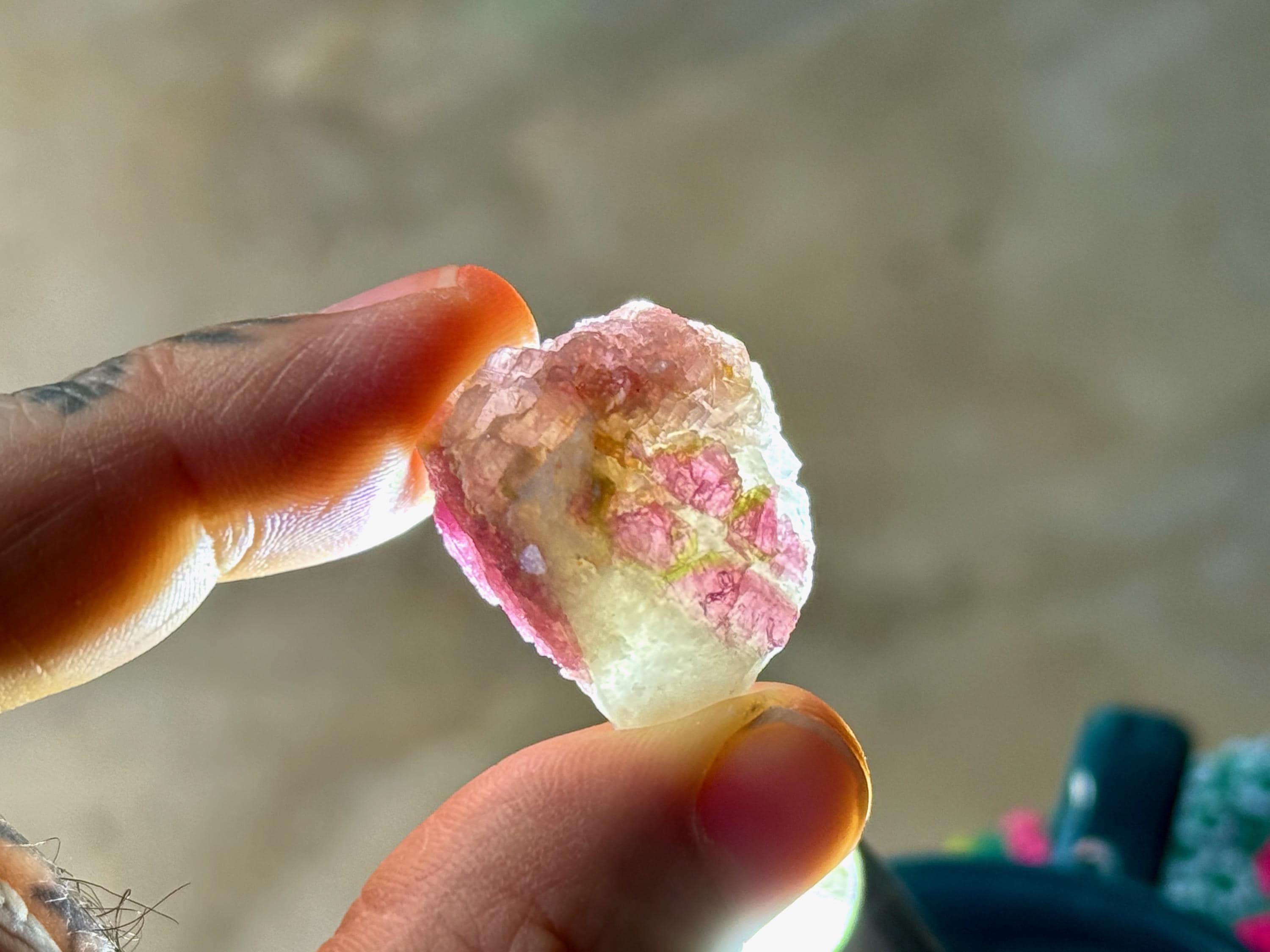 The crystals from this find include unique combinations of Quartz, Citrine, Lepidolite, Cleavelandite, Albite and Feldspar, with vividly colored Tourmalines in lovely hues of green, pink, purple and blue. Crystals with combinations of these minerals are sometimes referred to as "Unicorn Stones."