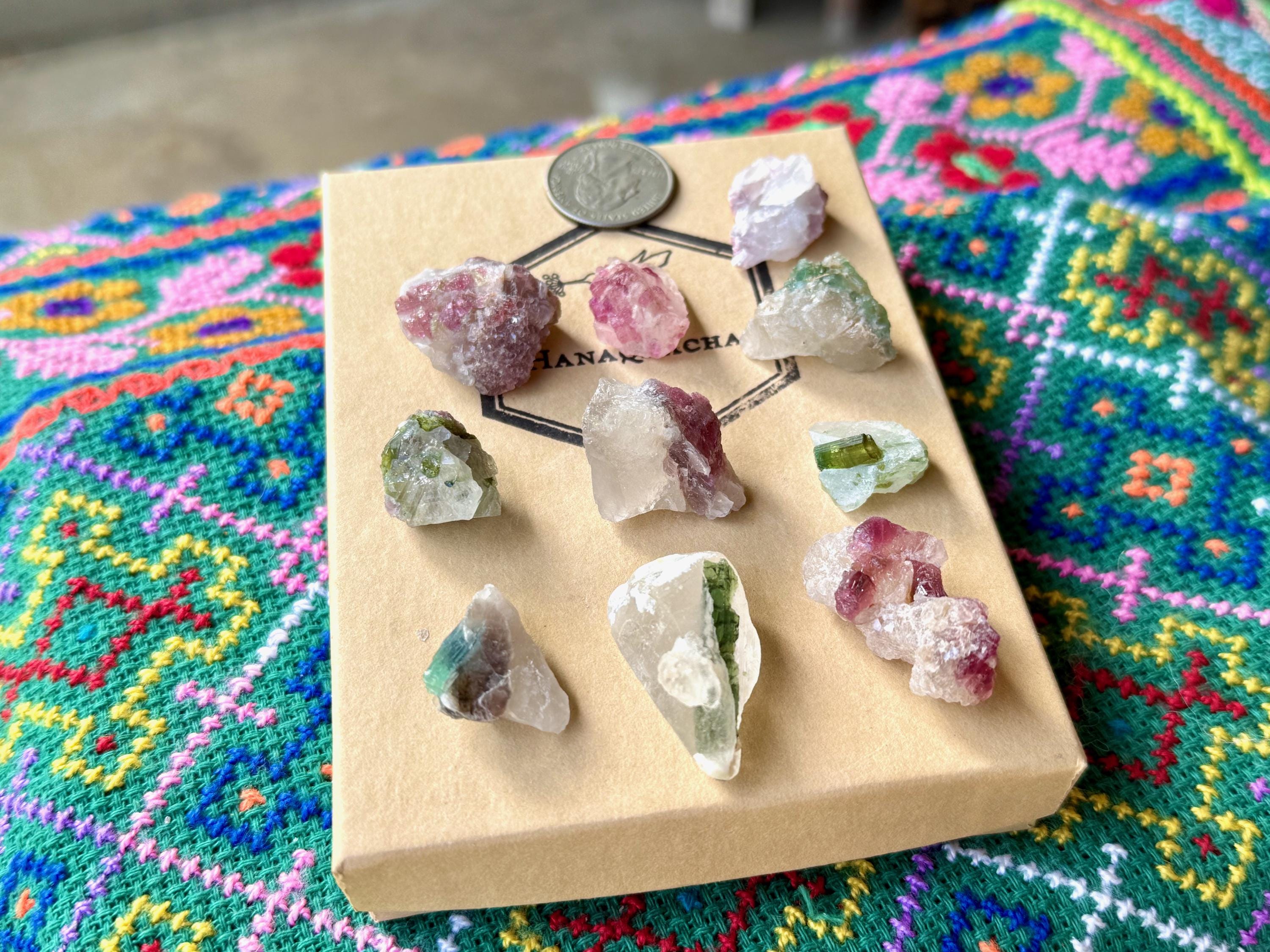 A vibrant collection of Unicorn Stone Quartz crystals with colorful inclusions of Green & Pink Tourmaline. When backlit, we can see just how gemmy and translucent these crystals are. A wonderful set for grids or collection.