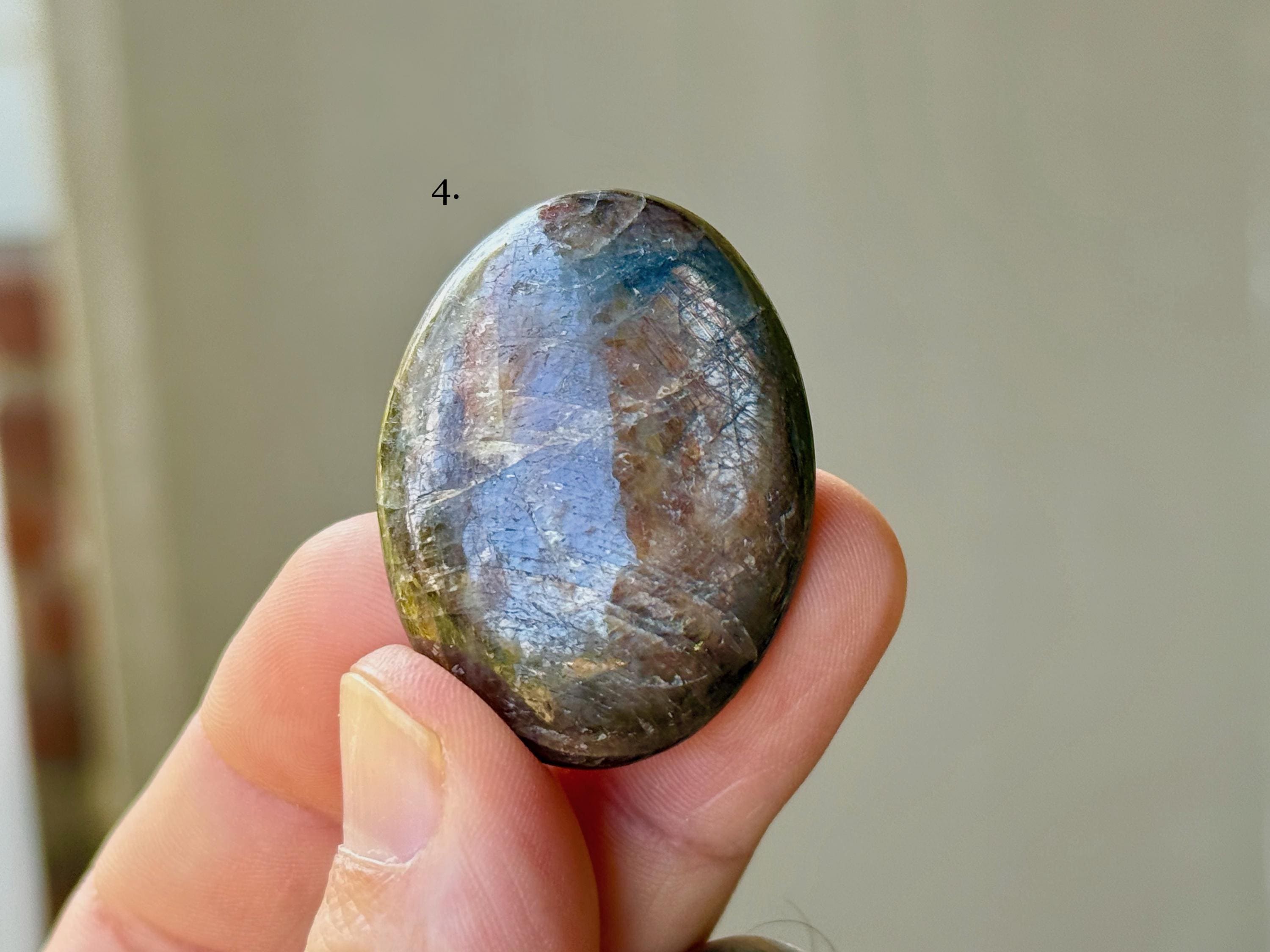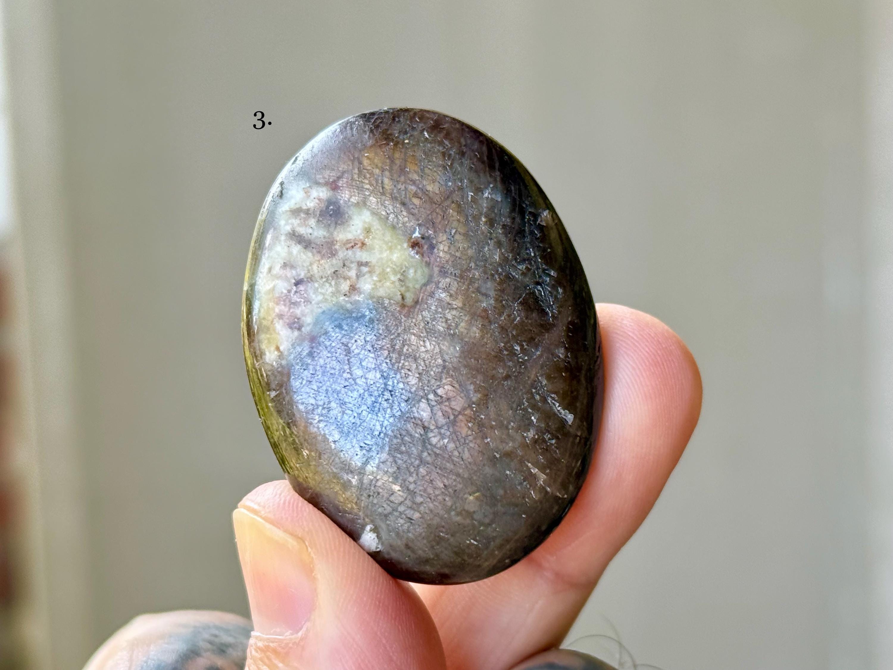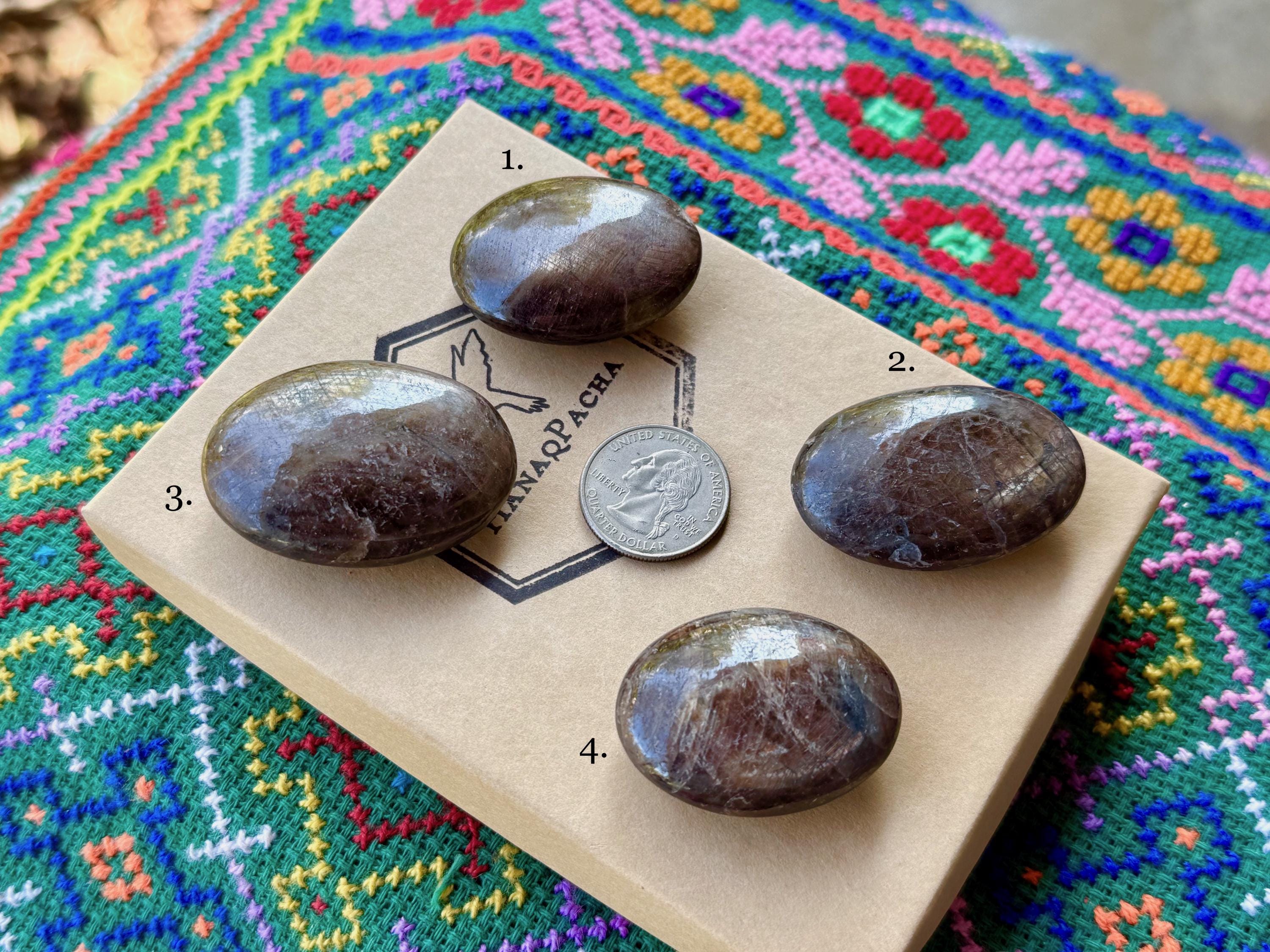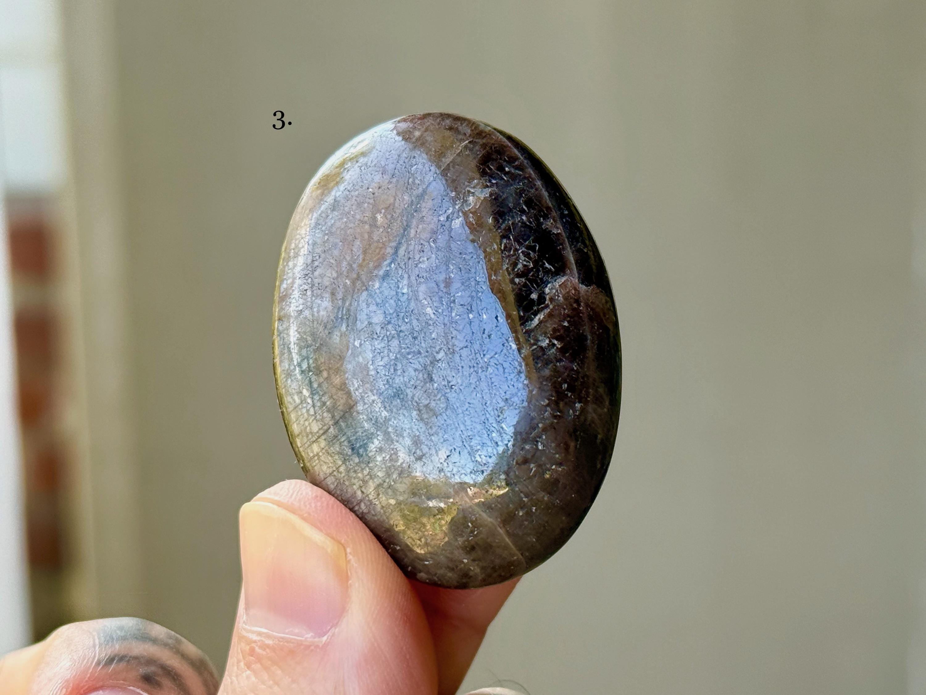 Stunning luster and opalescent hues to these beautiful Bronze Sapphire palm stones. The photos don't do them justice!