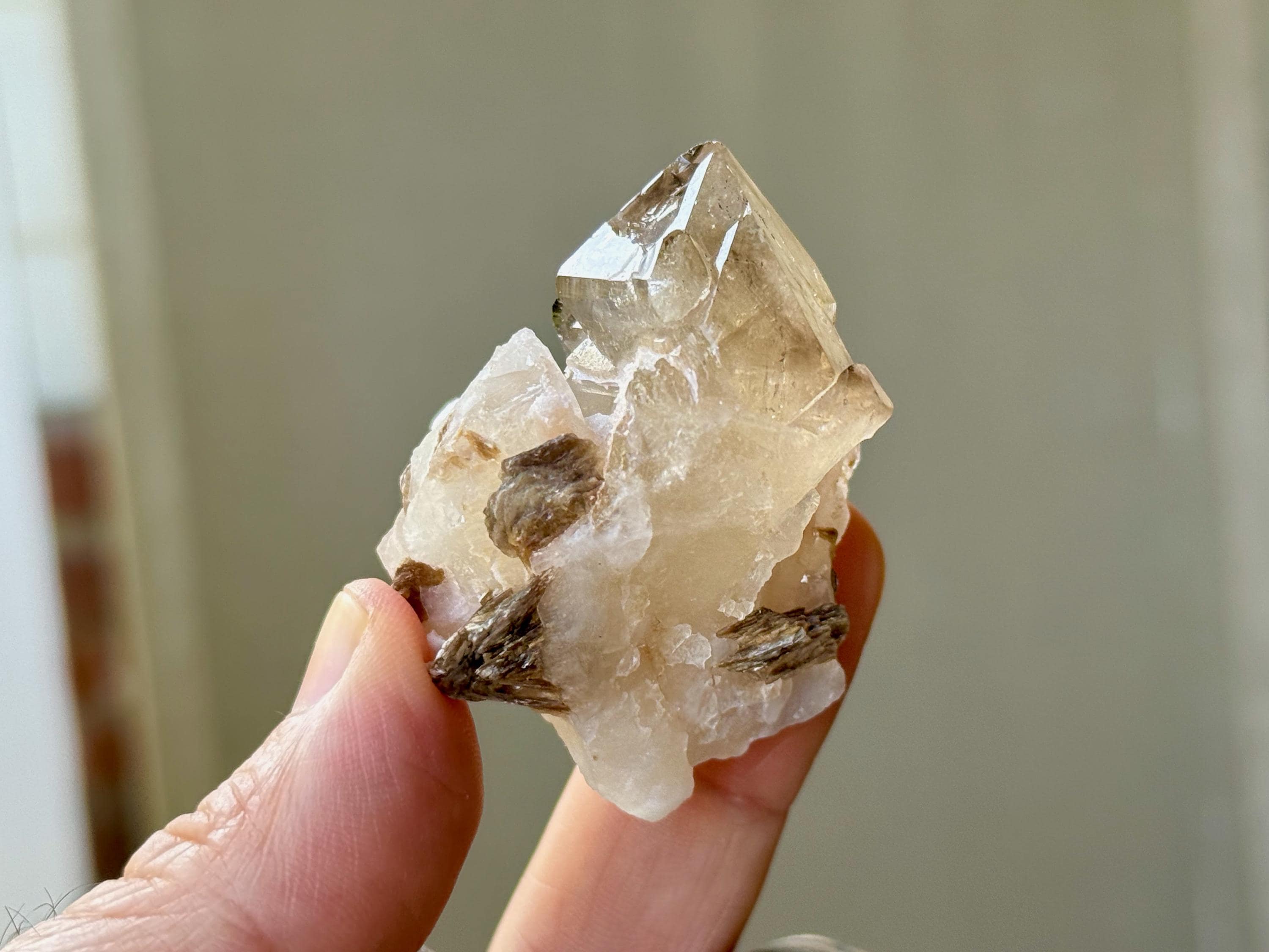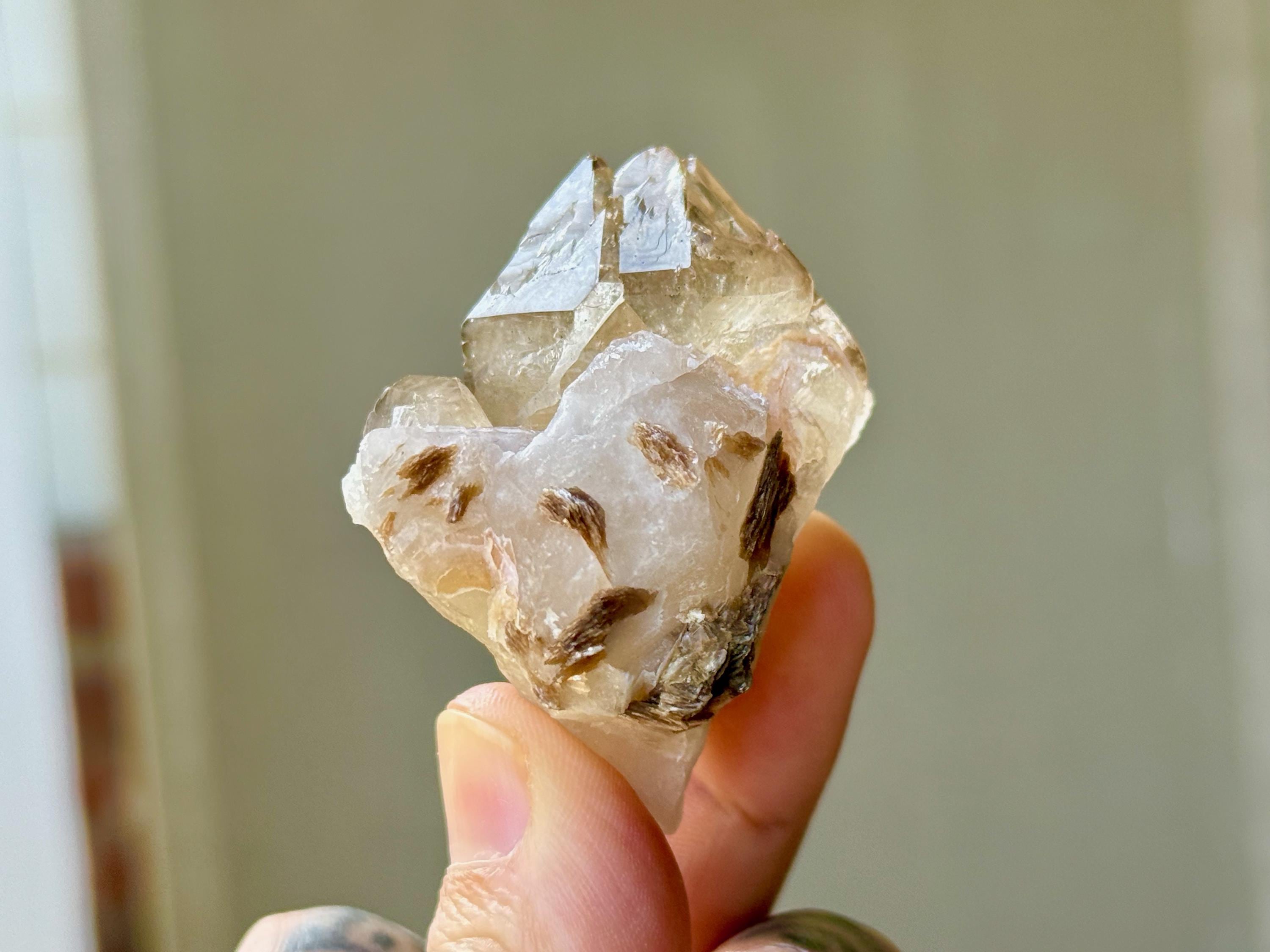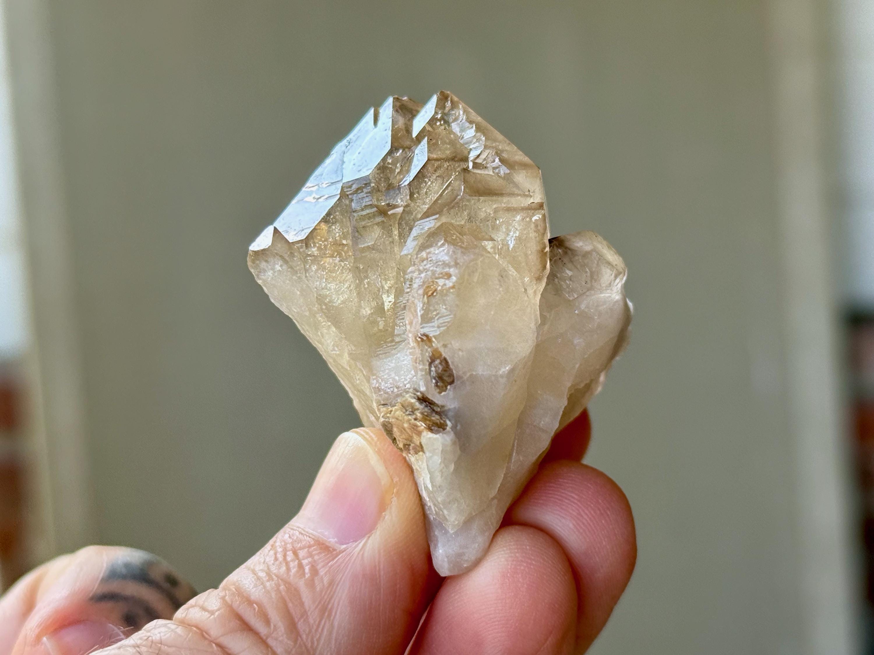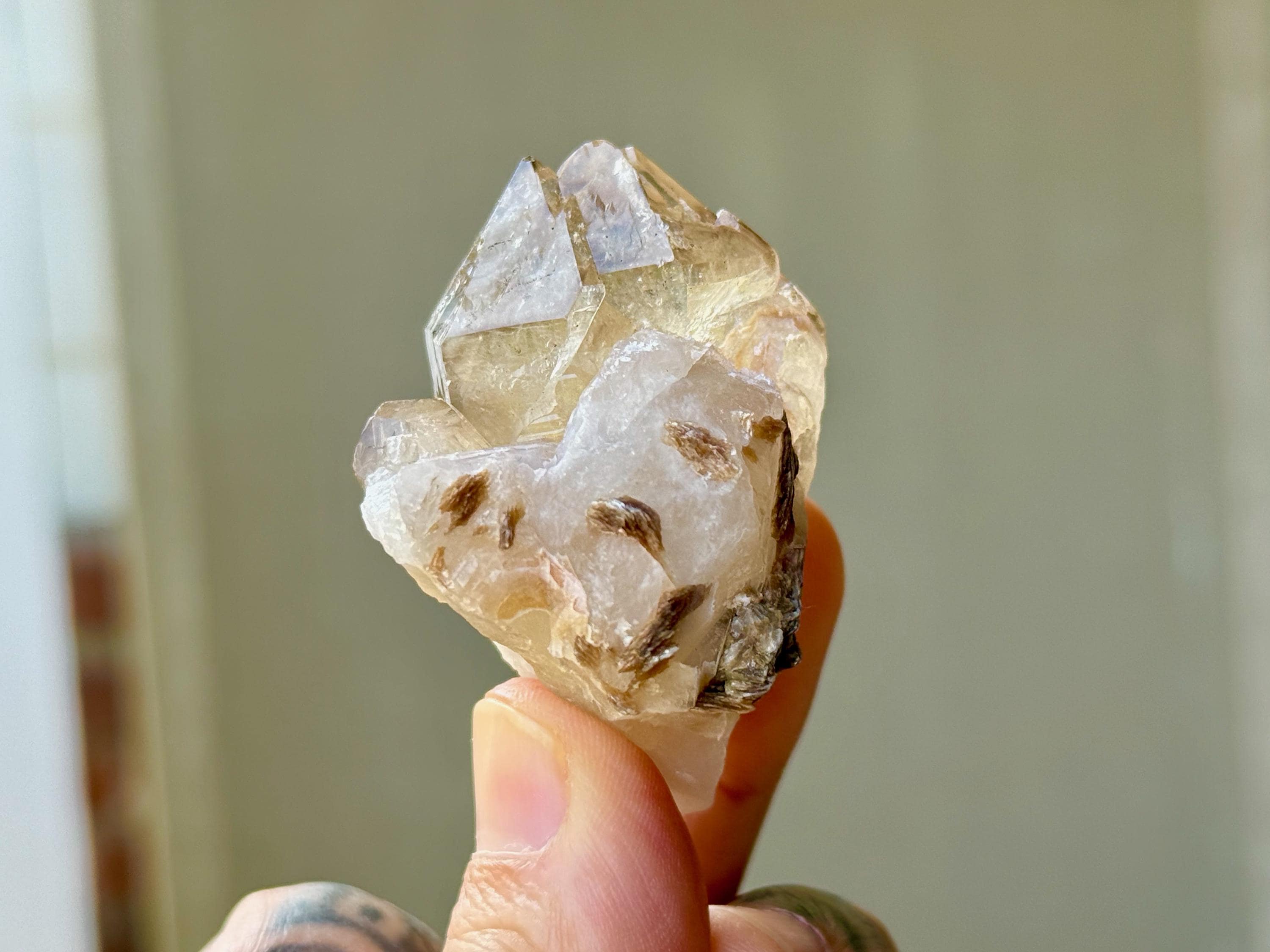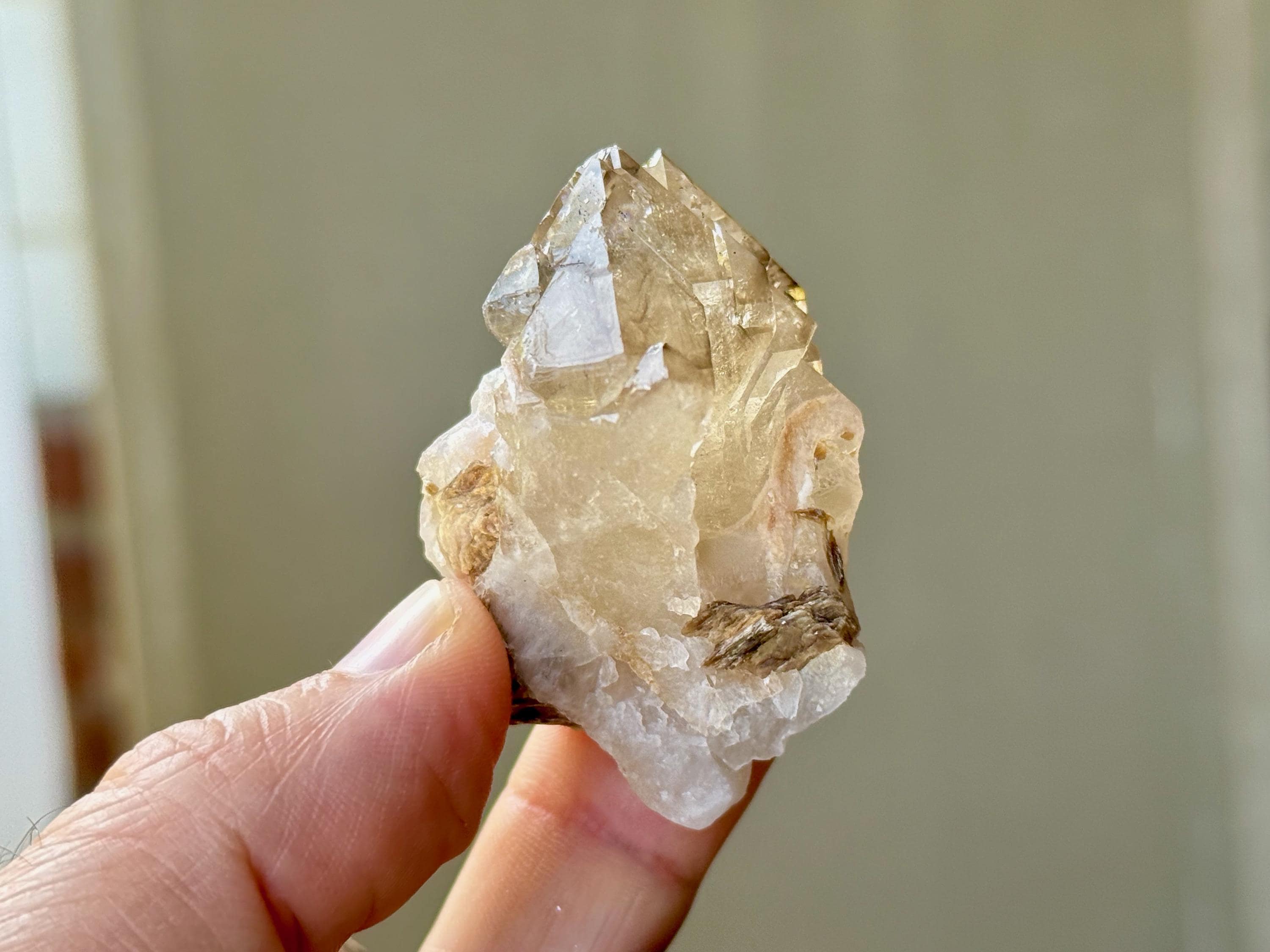 Outstanding quality to this lustrous, natural Elestial Citrine with a champagne golden color. This crystal features a "bloom" of pyramidal facets on top and several inclusions of disc-like Purple Lepidolite crystals embedded near the base.