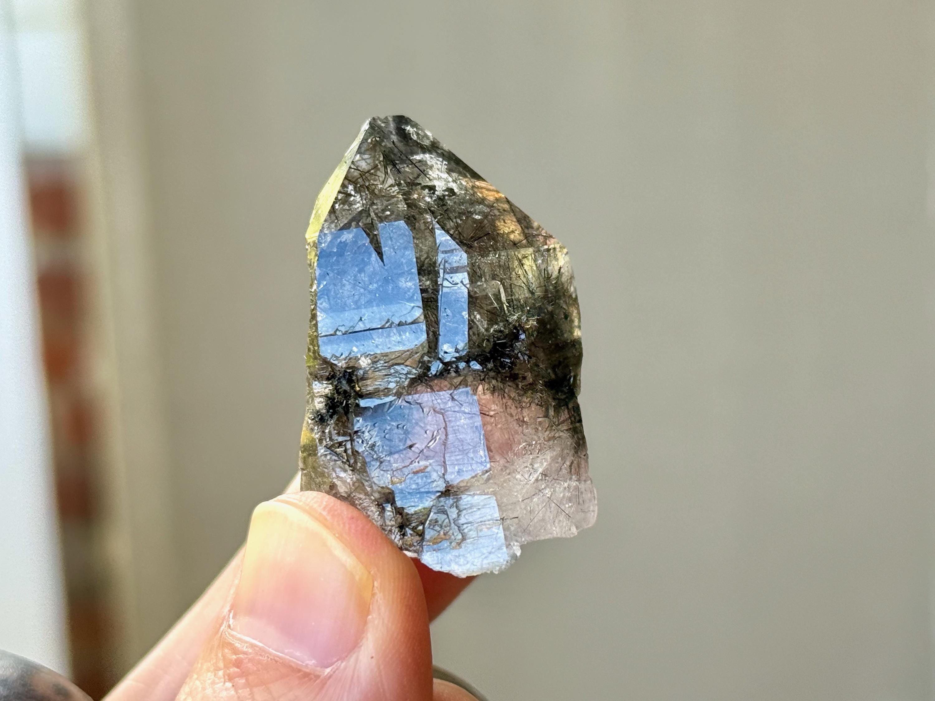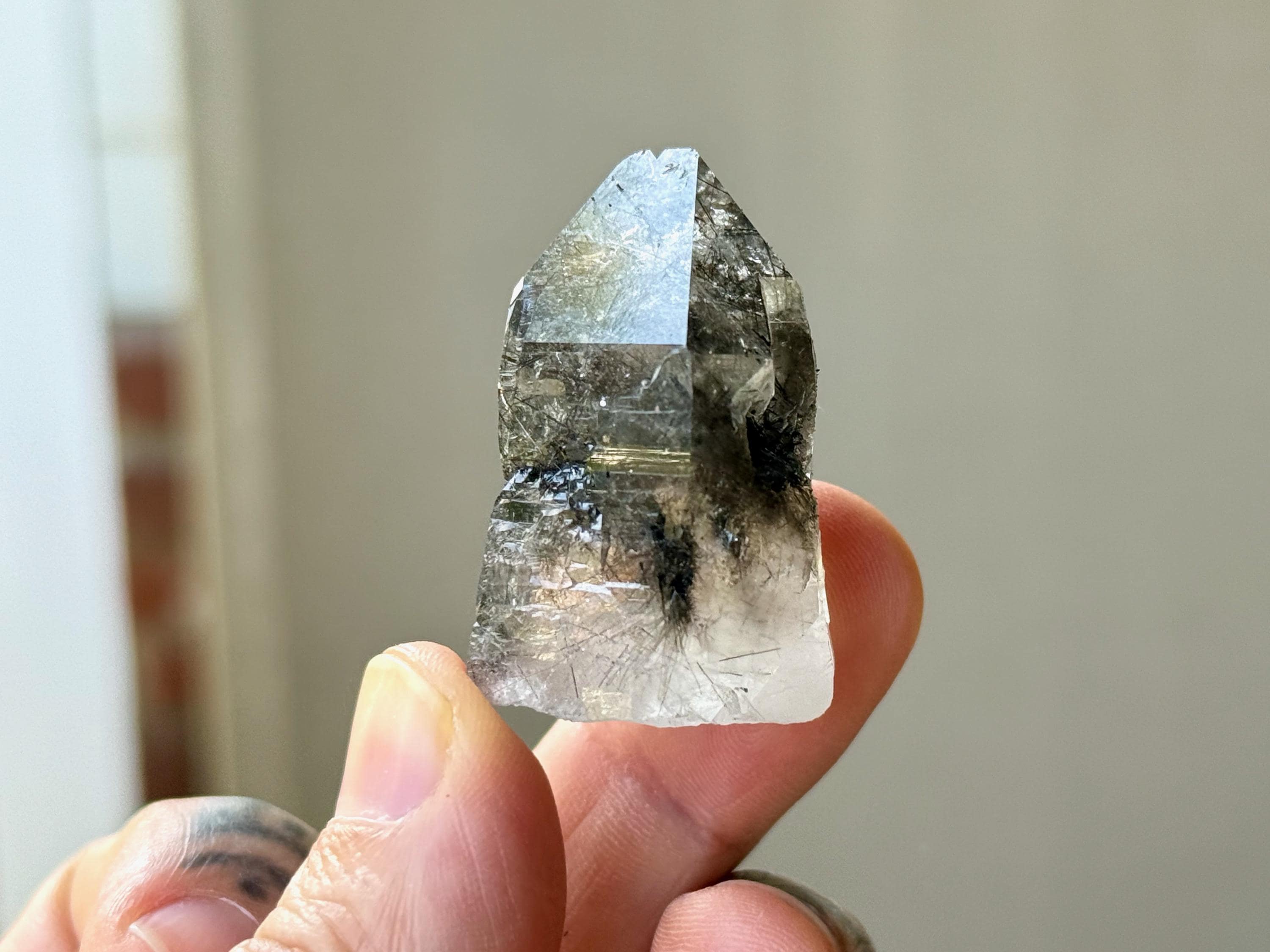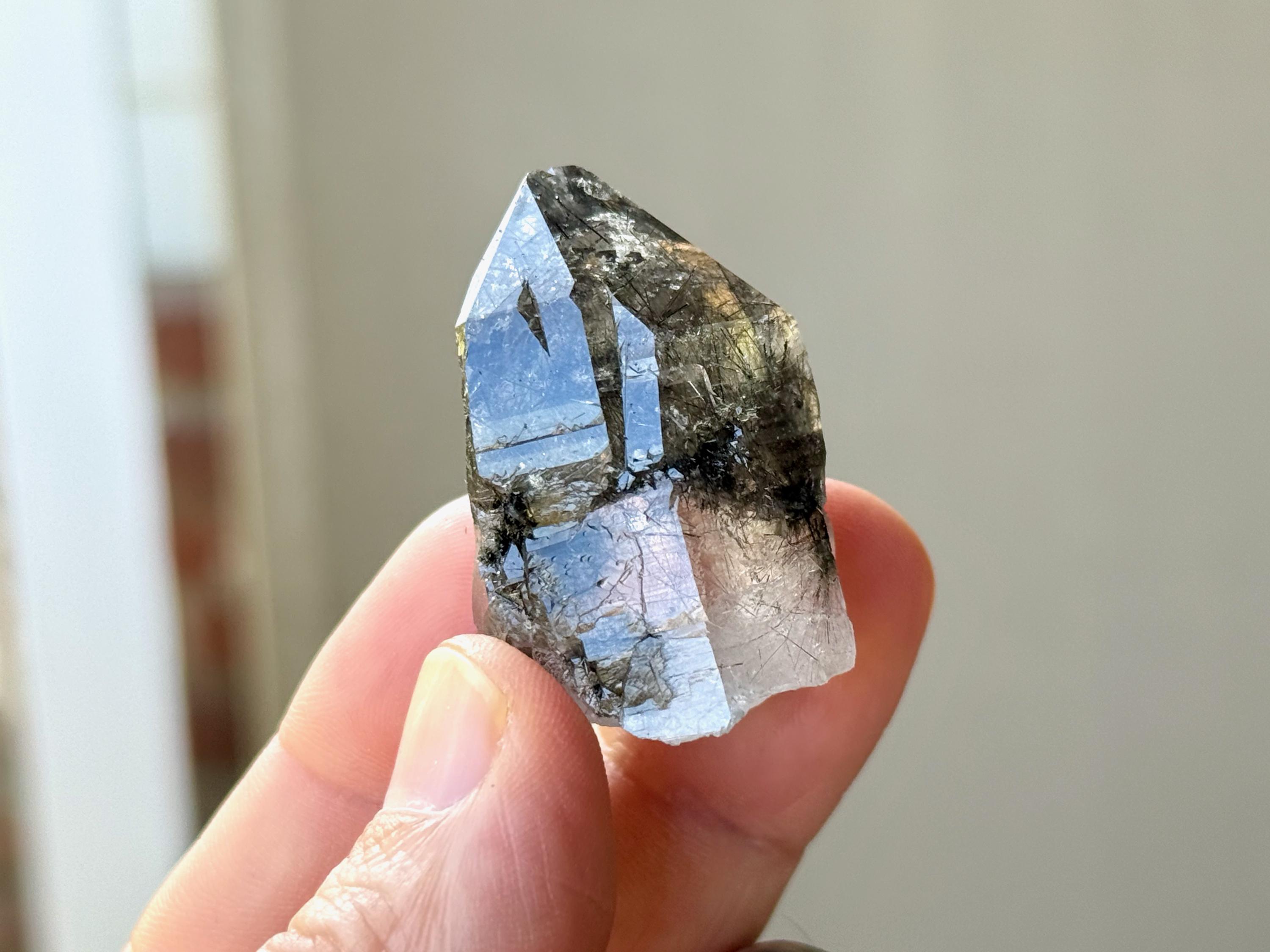Outstanding quality to this darkly lustrous Cathedral Quartz crystal filled with Black Tourmaline inclusions! This crystal exhibits a traditional point formation with beautiful etched cathedral textures on its body. When backlit, as in Photos 3-4, we can see just how well it passes light, and get a sense for the the multitude of individual Black Tourmaline "needles" within.