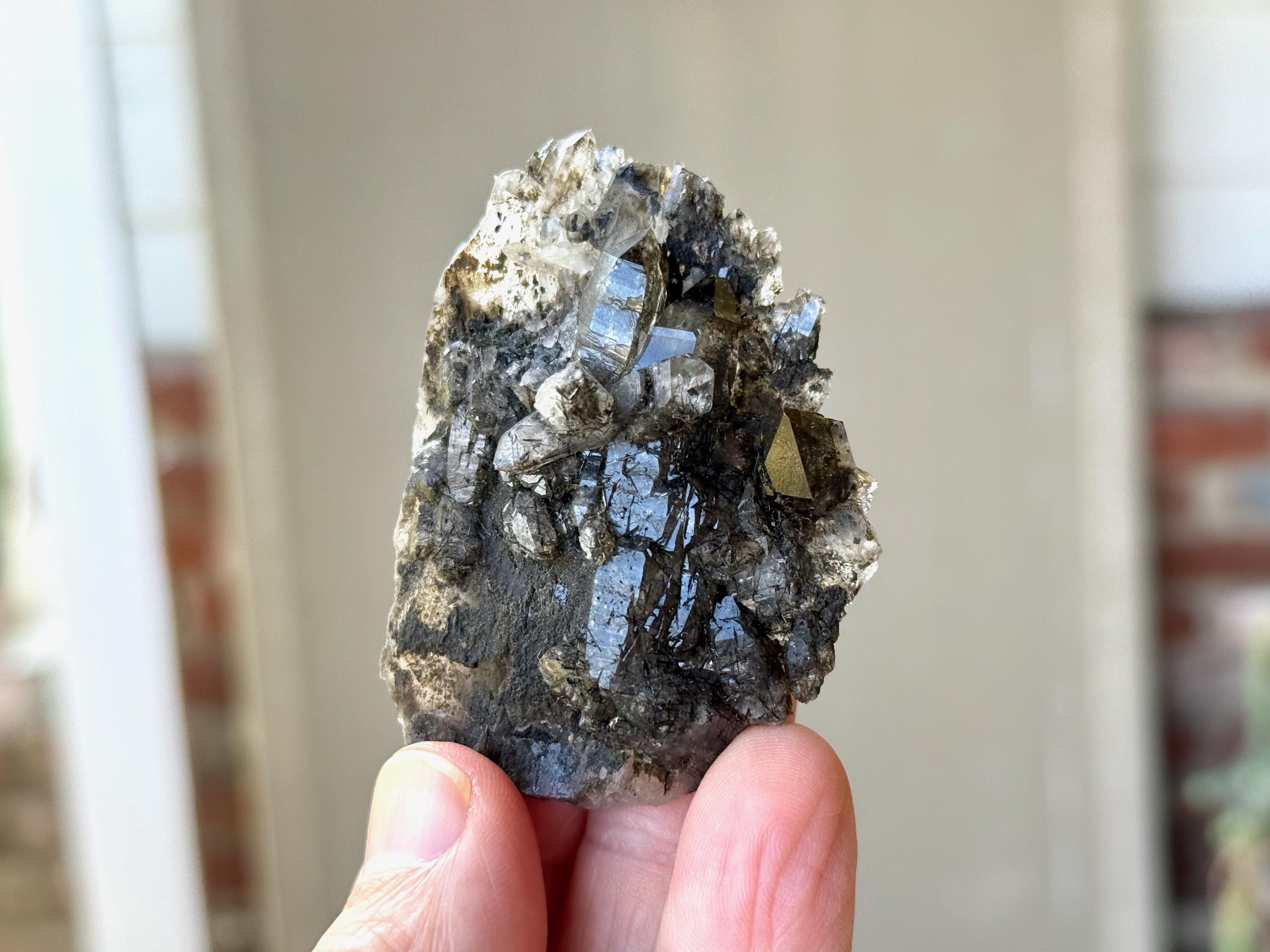 A broad and flat "plate" formation to this darkly lustrous Black Tourmaline Quartz cluster. This crystal features a multitude of individual Quartz points growing in all directions from a central matrix, with dense inclusions of Black Tourmaline that create a deeply reflective complexion.