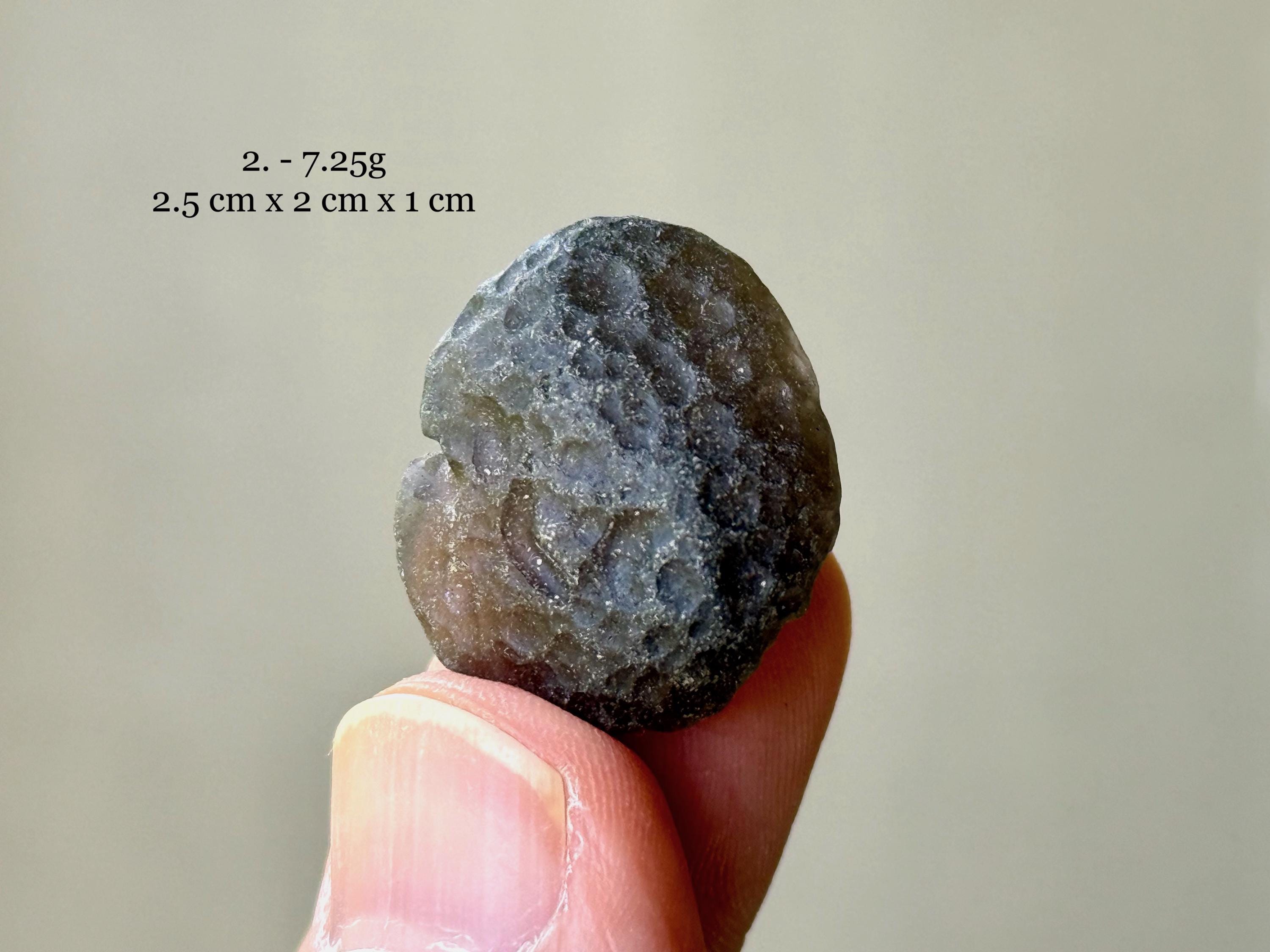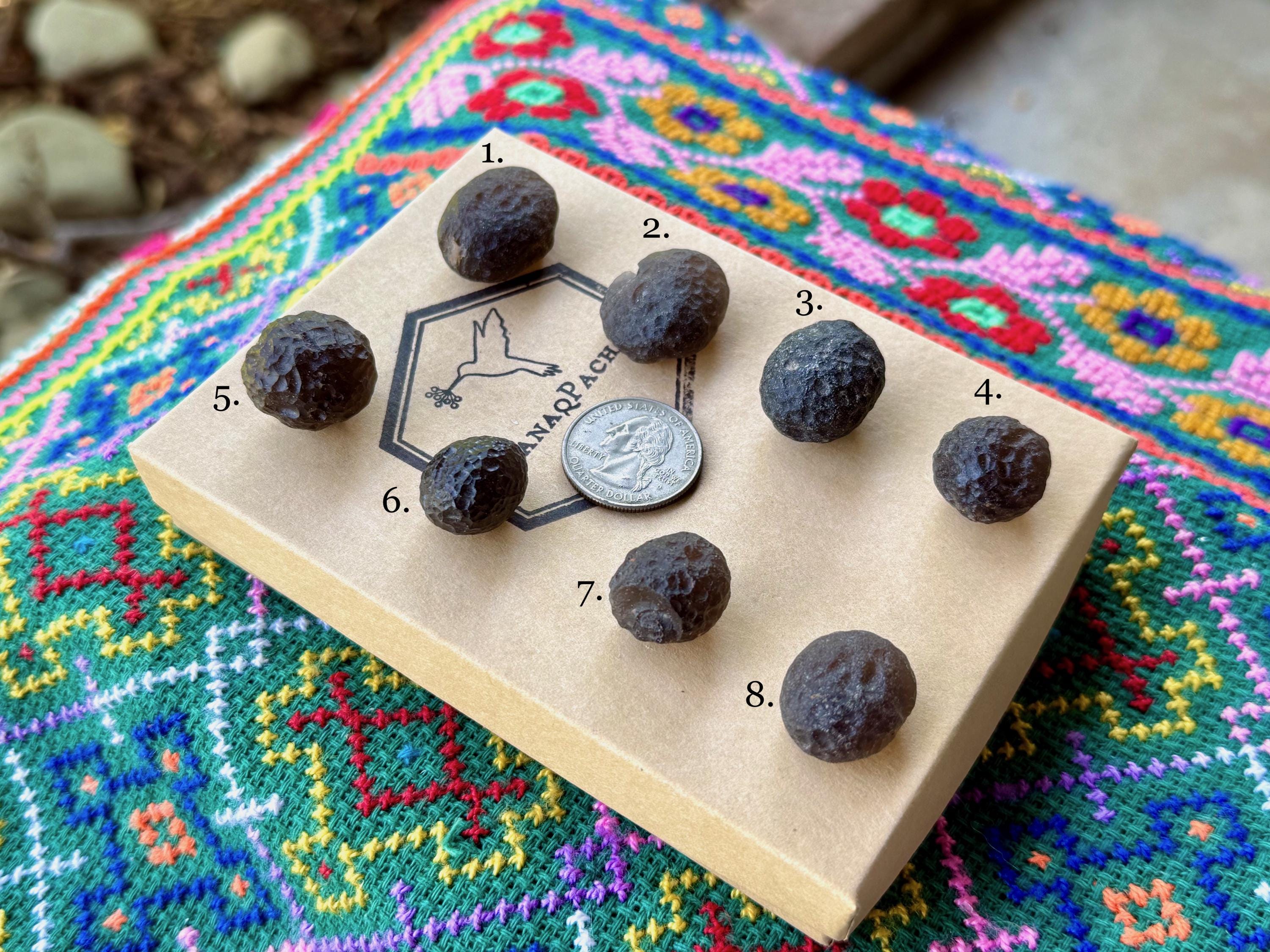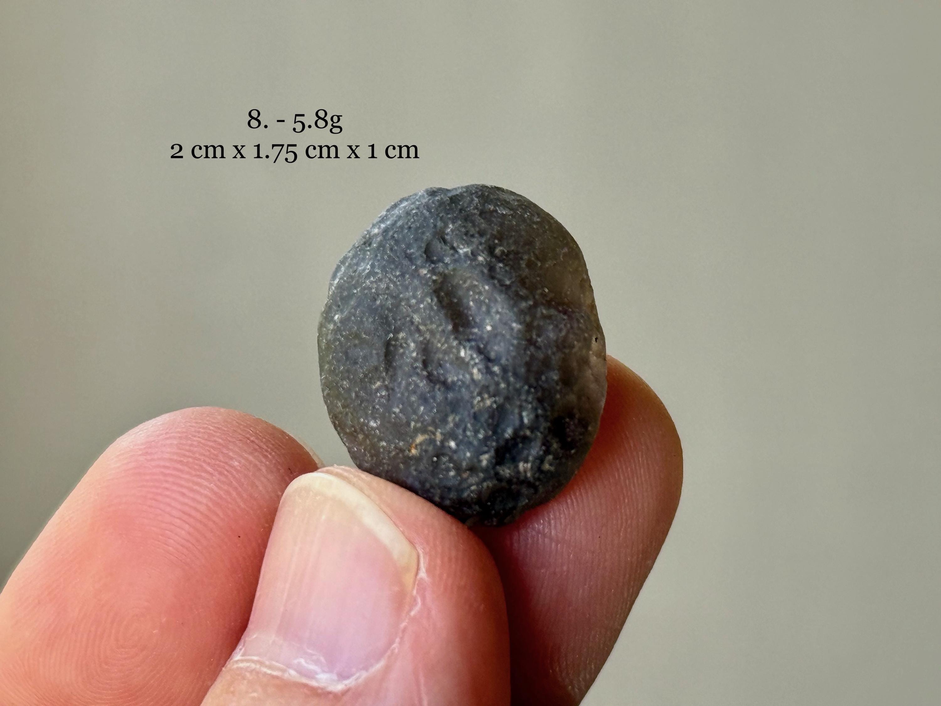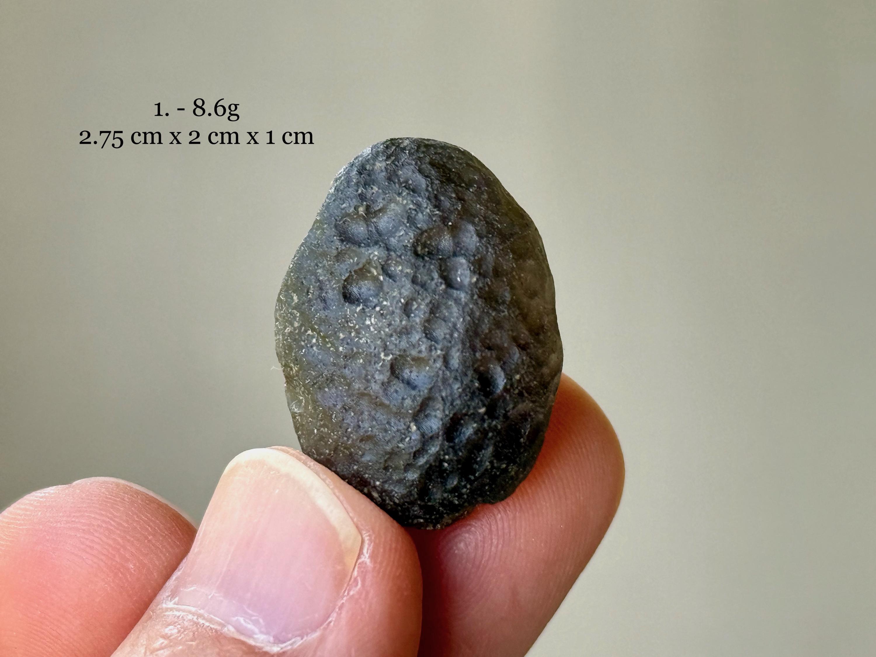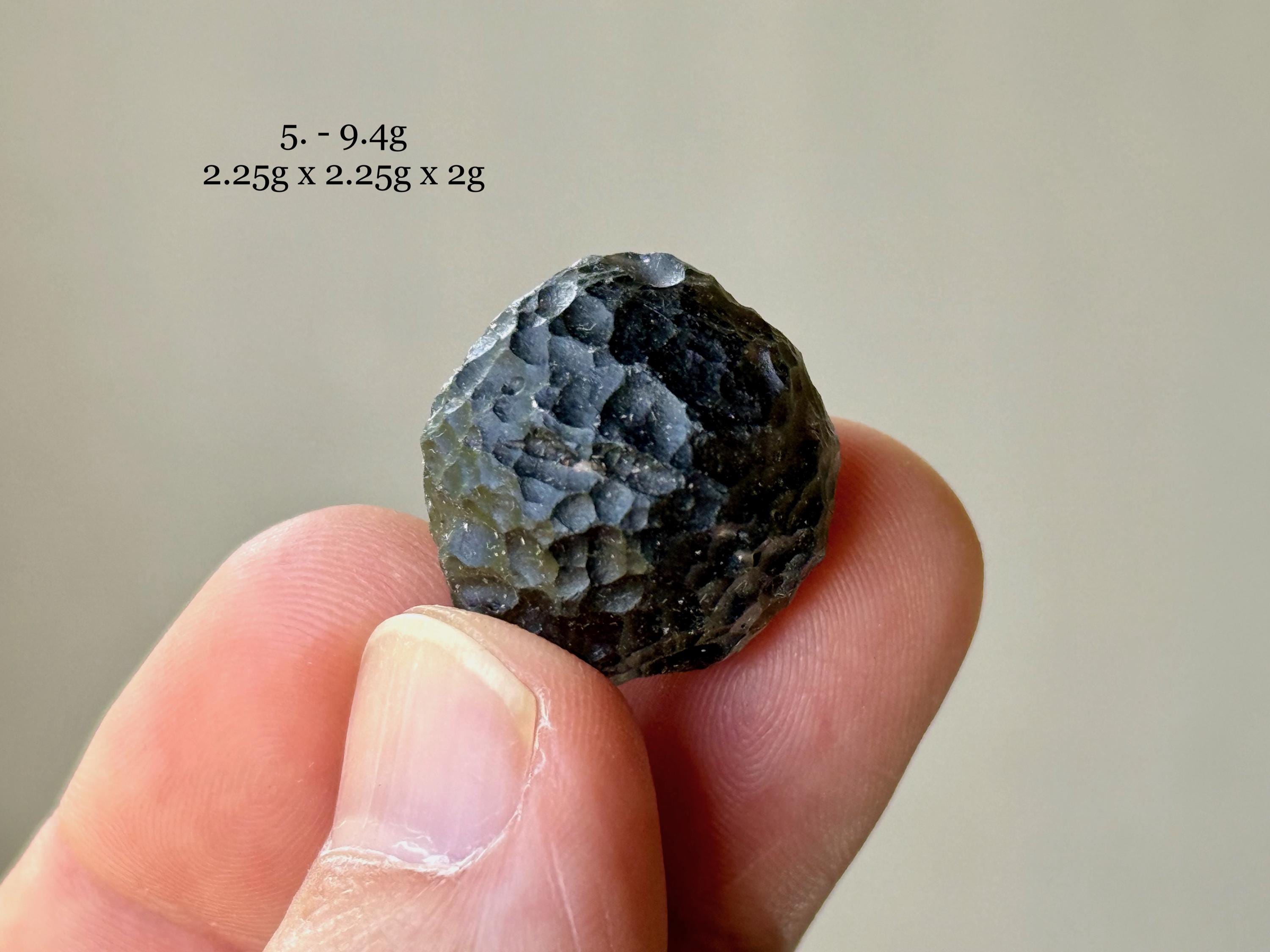 "B" Grade - These specimens may have a slightly duller complexion, with less luster and more more of a charcoal gray hue, as opposed to deep pitch black. They may still have rounded or ovular formations, or they may have irregular shapes and forms. There is still an element of translucency that is often quite high, or it may be slightly less. They may have larger smooth areas where there is no pitting.